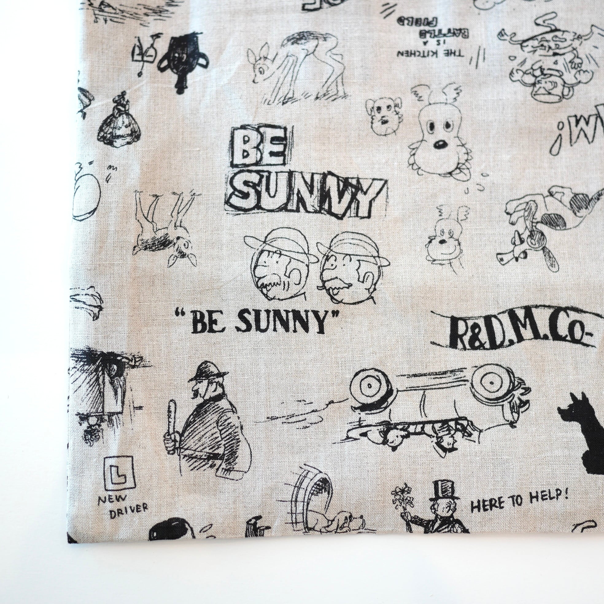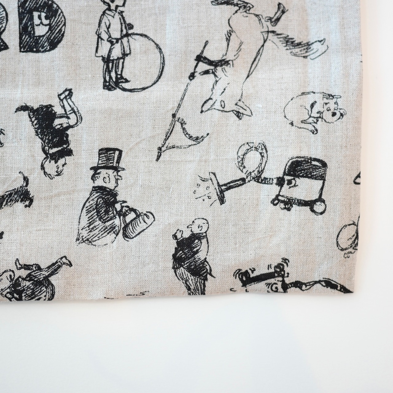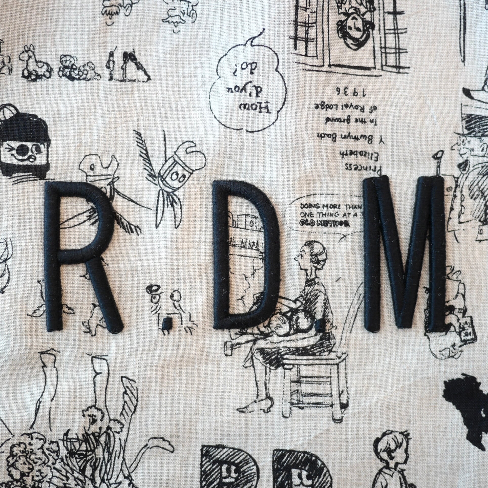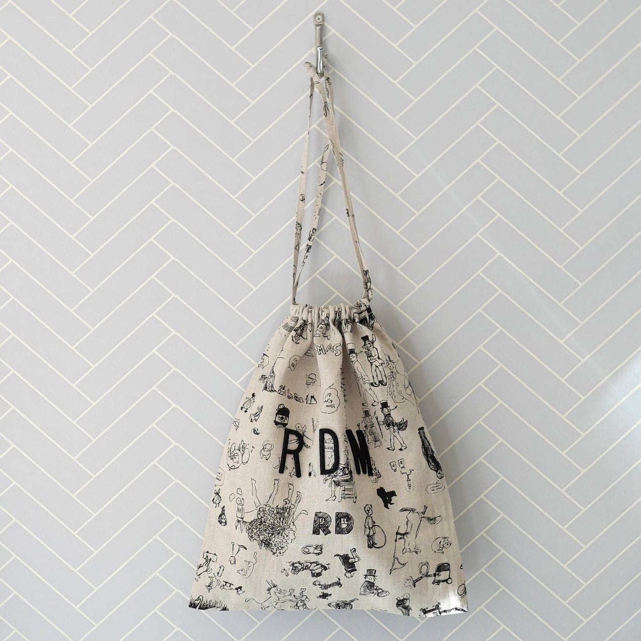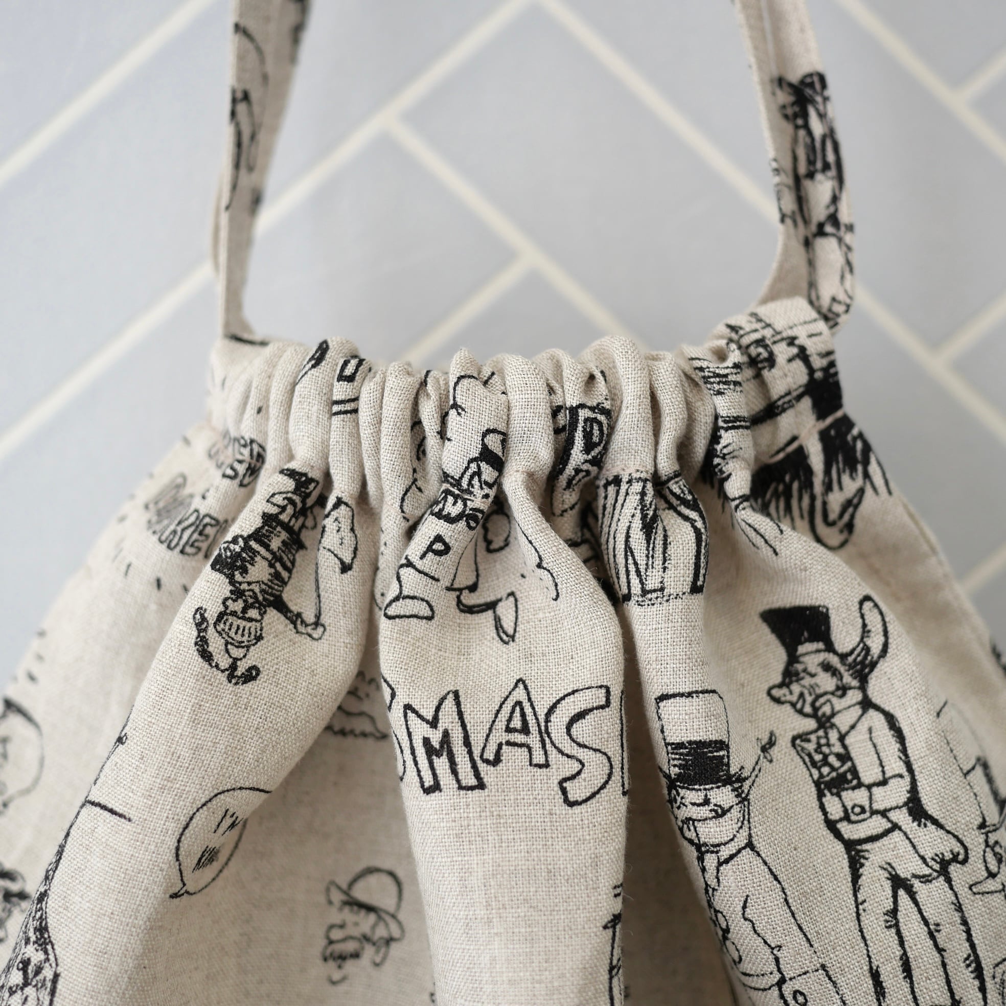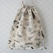 2026春の新柄「グラフィティー」。いろんな柄やキャラクターの落書きがそのまま柄の名前になっています。鉛筆画タッチの繊細な描写や、力強い陰影がリネン生地に表現されています。RDMの刺繍が素敵なフォローストリングバック。メインバックとしてはもちろん、カゴバックと合わせて持ったり、旅行の着替え用にも可愛いです。