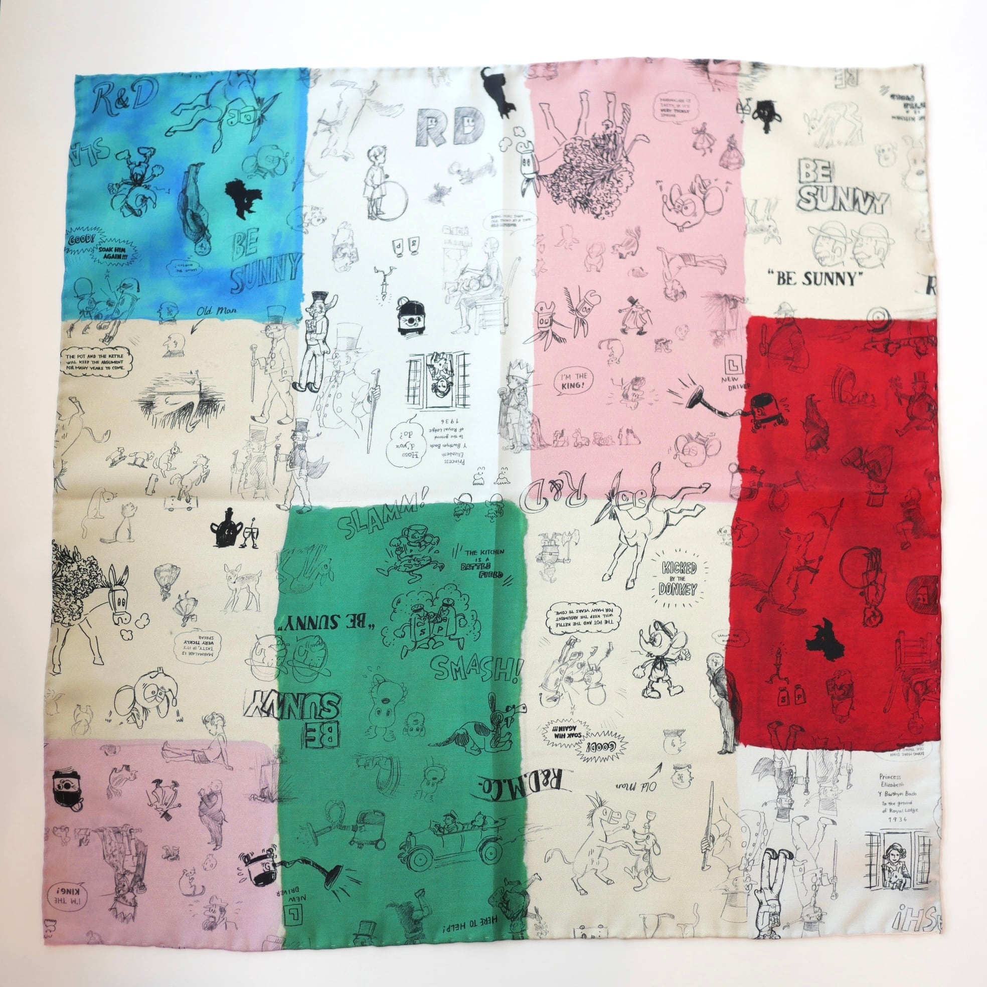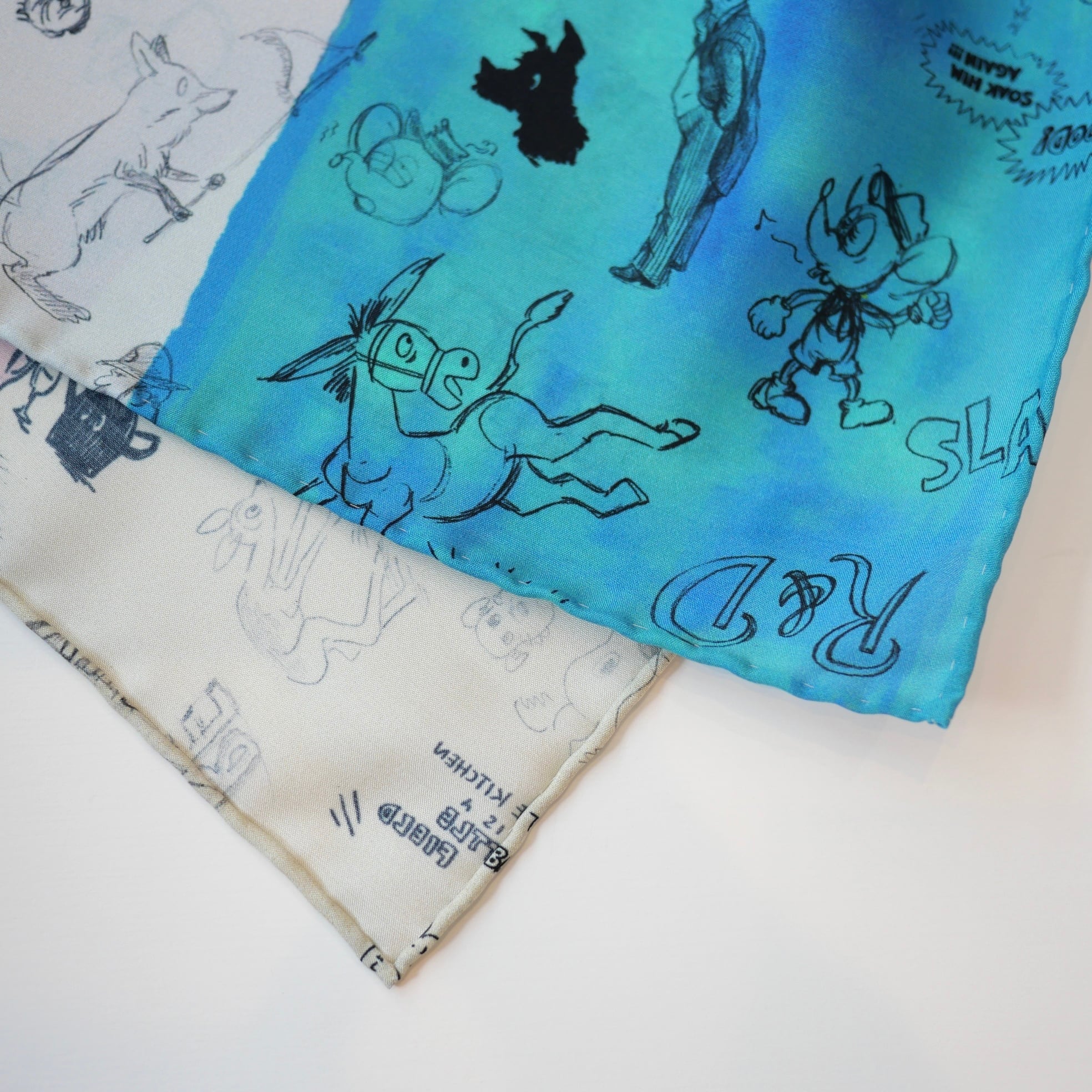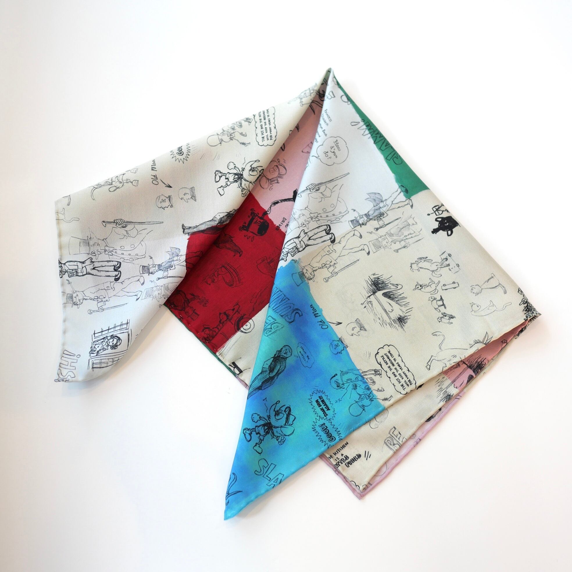 2026春の新柄「グラフィティー」。いろんな柄やキャラクターの落書きがそのまま柄の名前になっています。色々な色をモザイク画のように配置したグラフィティーのシルクスカーフ。ハンドステッチで仕上げたスカーフ和ふわふわとして巻きやすい一枚です。