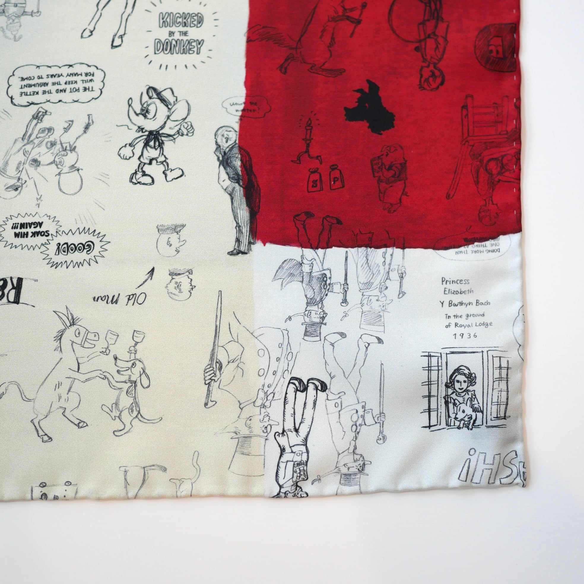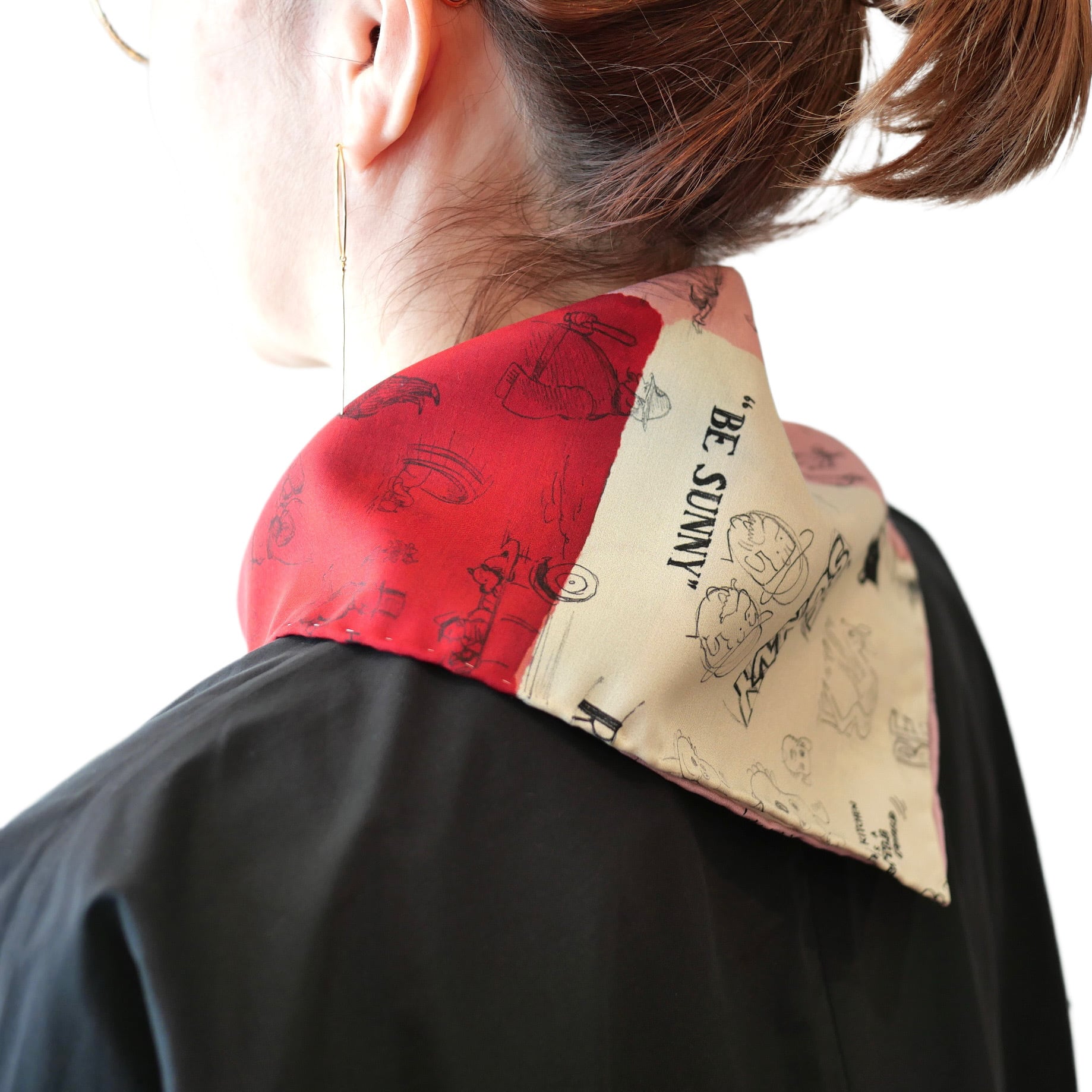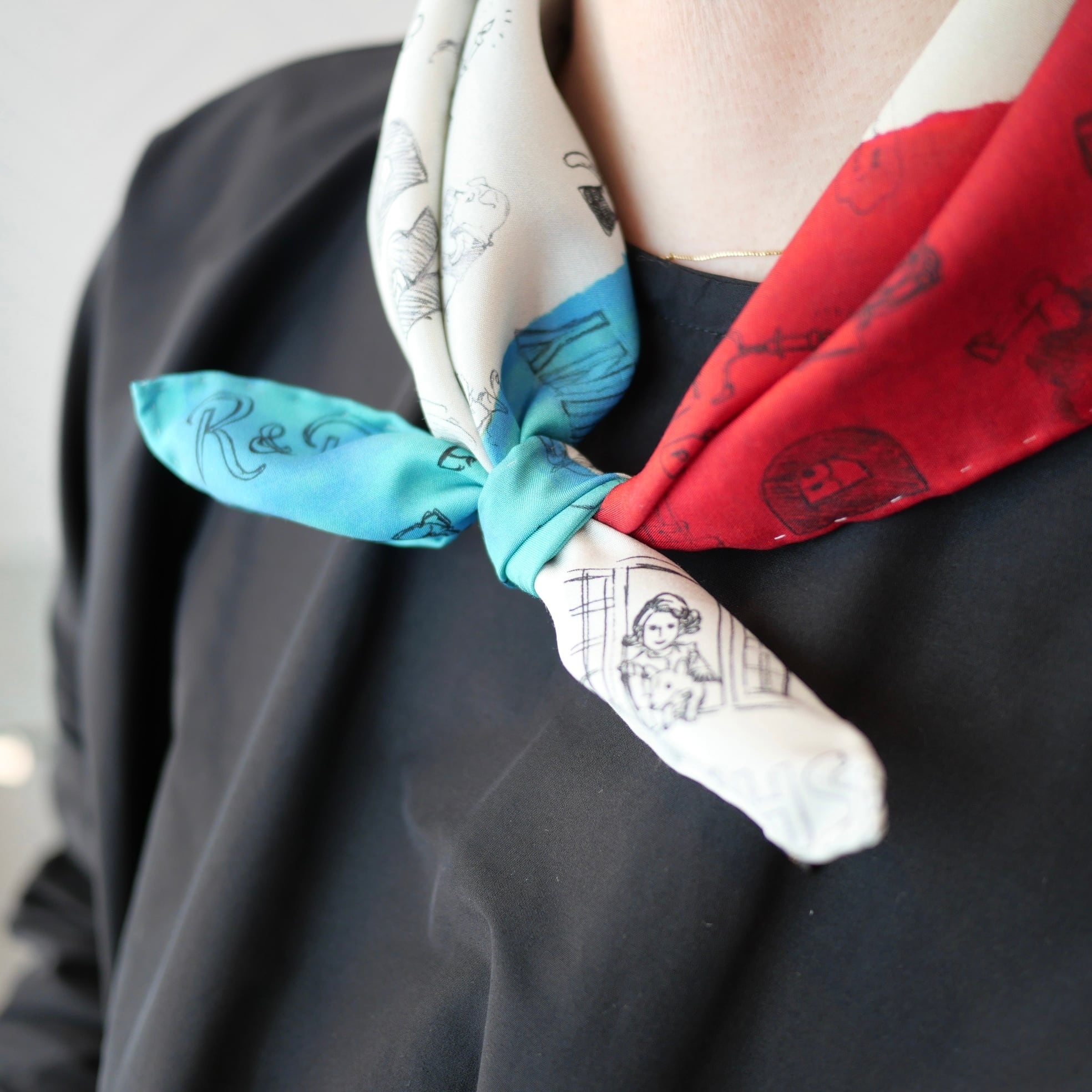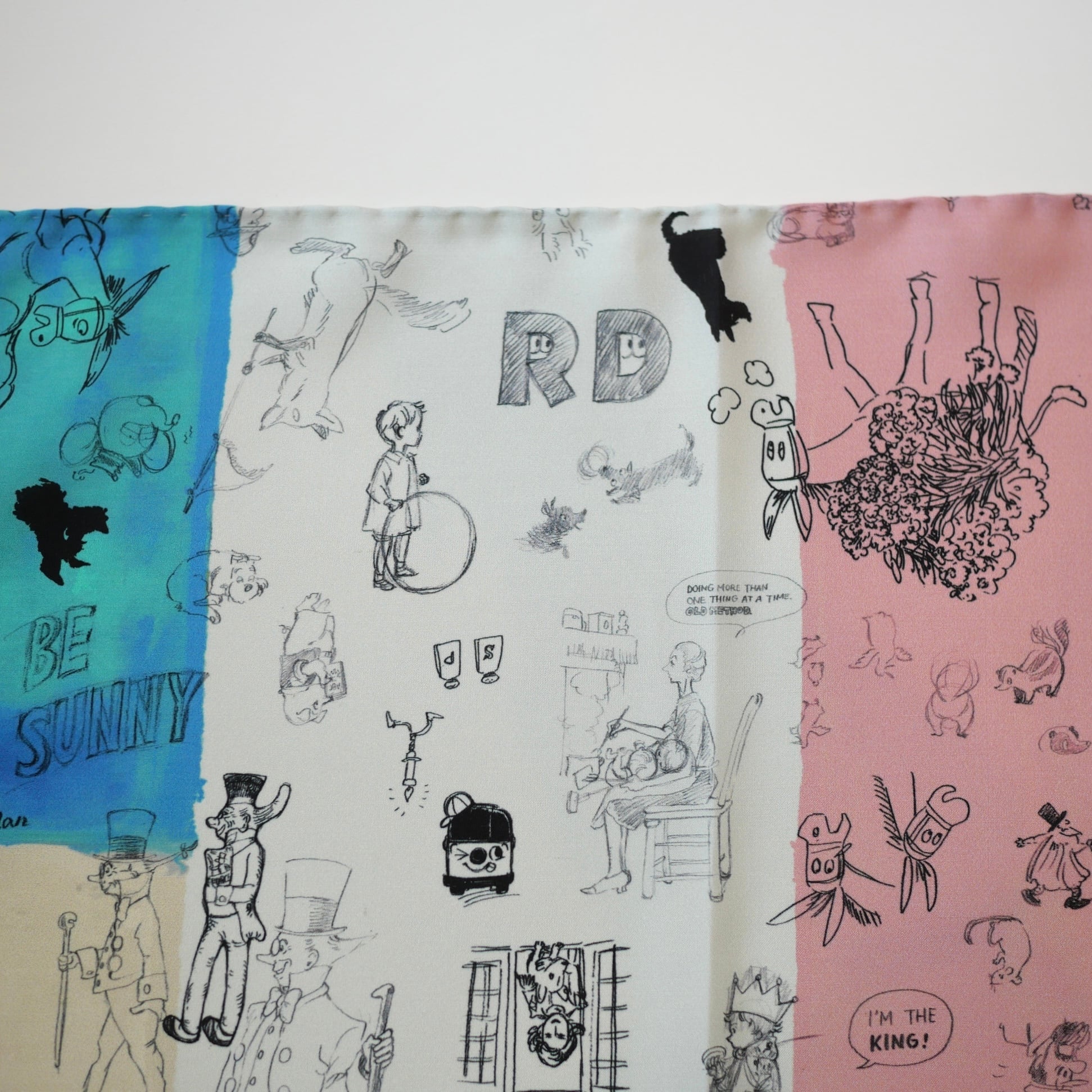 2026春の新柄「グラフィティー」。いろんな柄やキャラクターの落書きがそのまま柄の名前になっています。色々な色をモザイク画のように配置したグラフィティーのシルクスカーフ。ハンドステッチで仕上げたスカーフ和ふわふわとして巻きやすい一枚です。