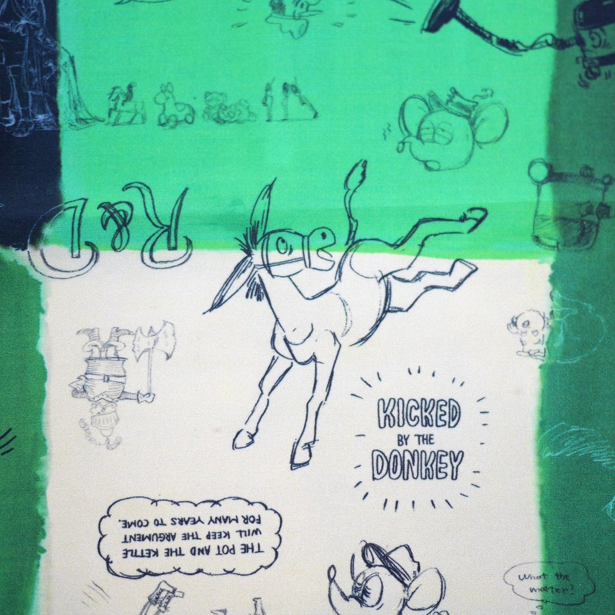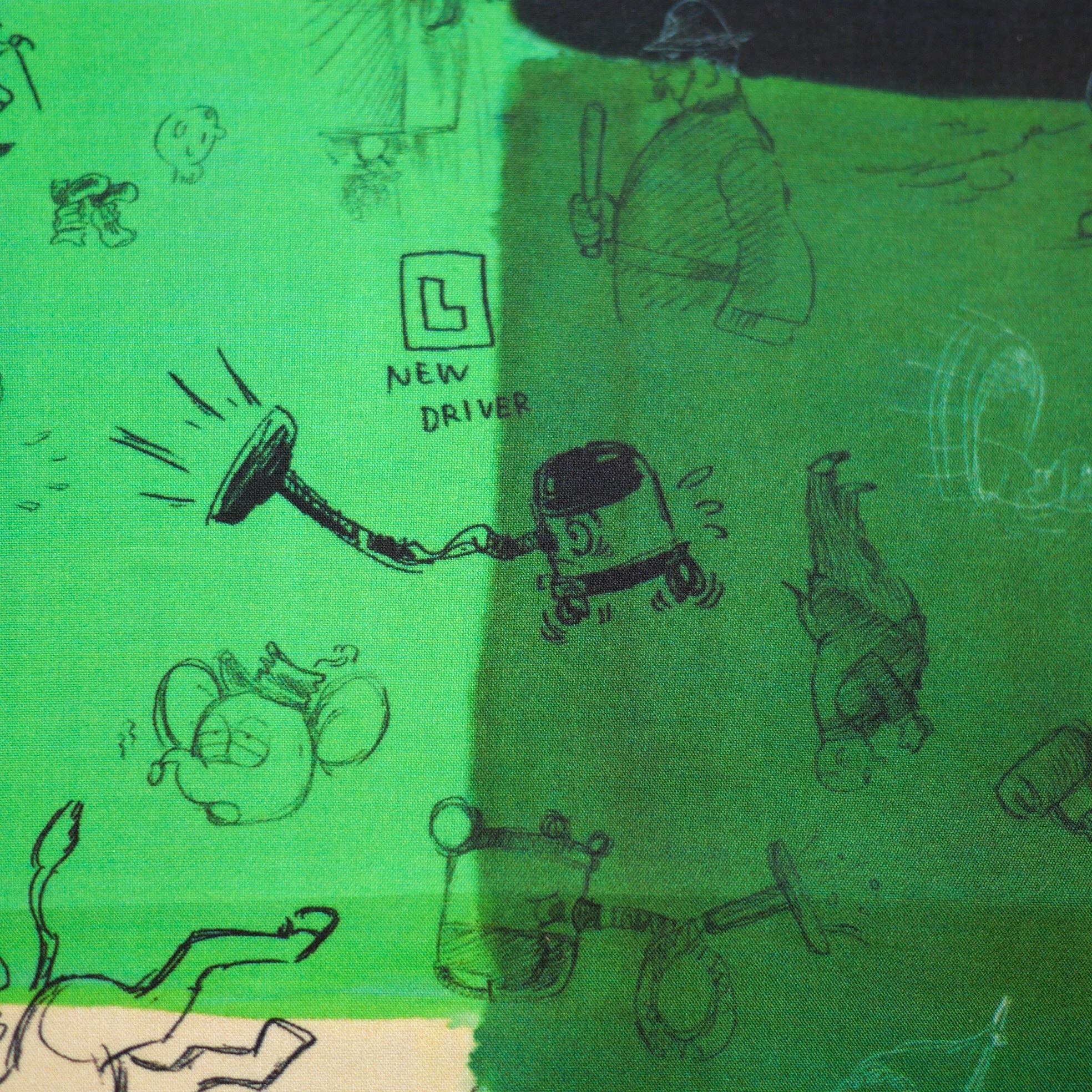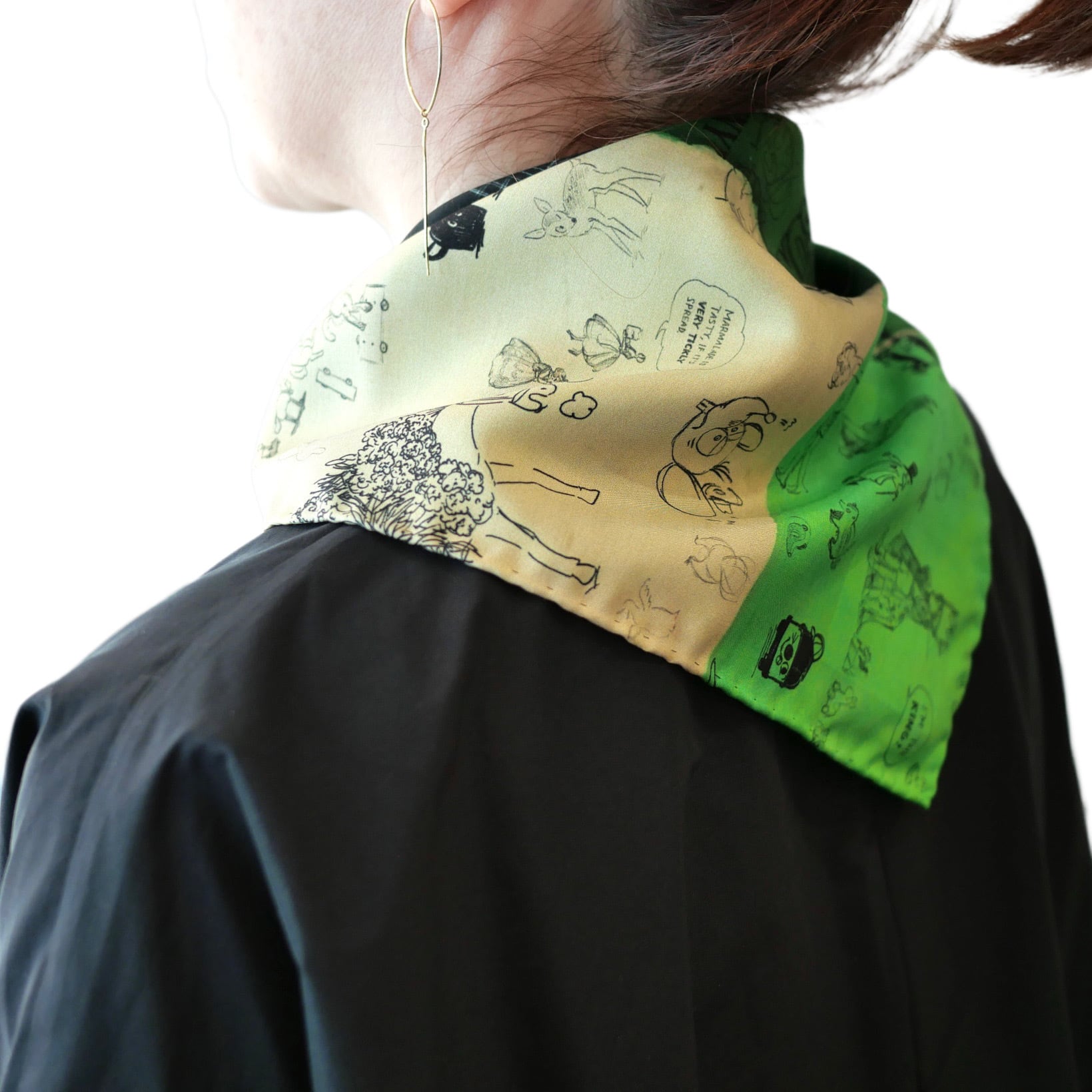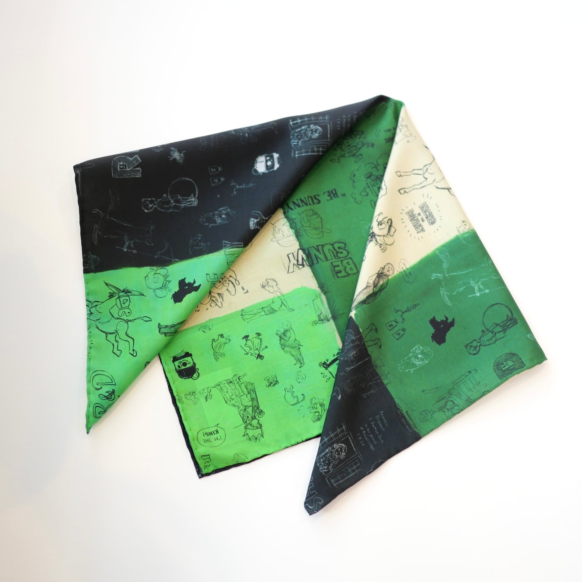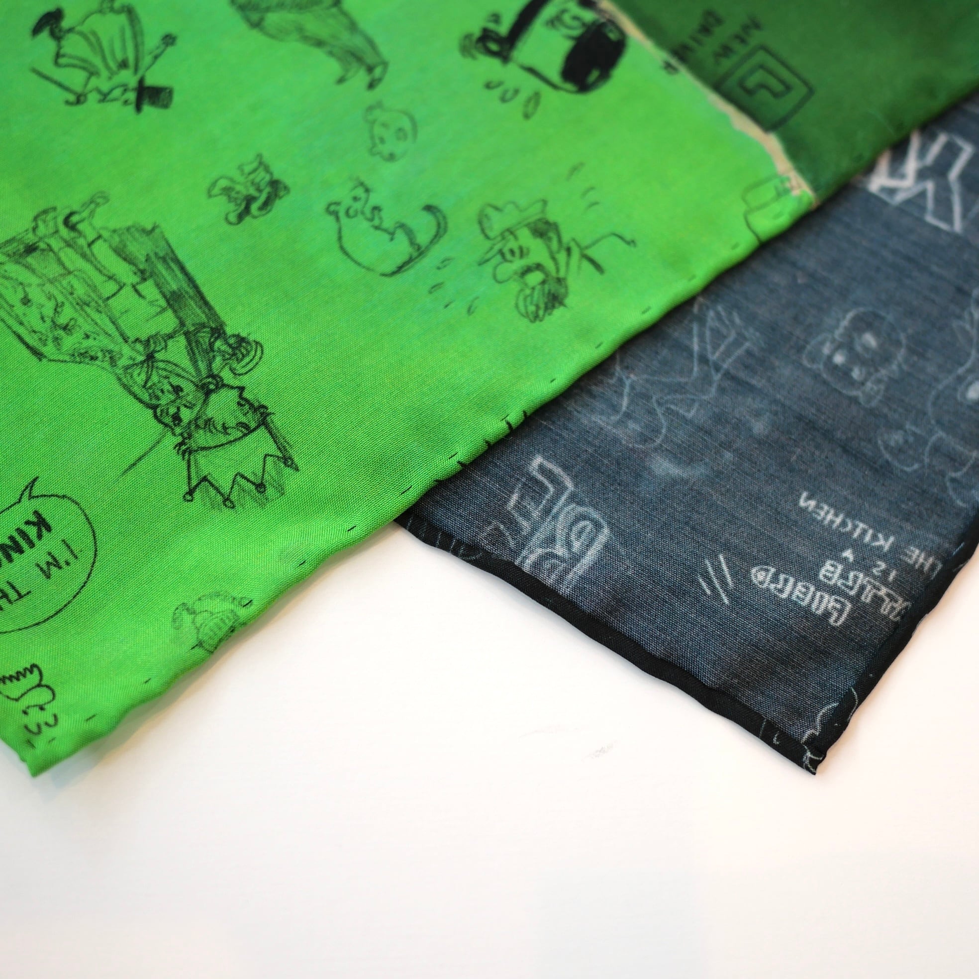 2026春の新柄「グラフィティー」。いろんな柄やキャラクターの落書きがそのまま柄の名前になっています。色々な色をモザイク画のように配置したグラフィティーのシルクスカーフ。ハンドステッチで仕上げたスカーフ和ふわふわとして巻きやすい一枚です。