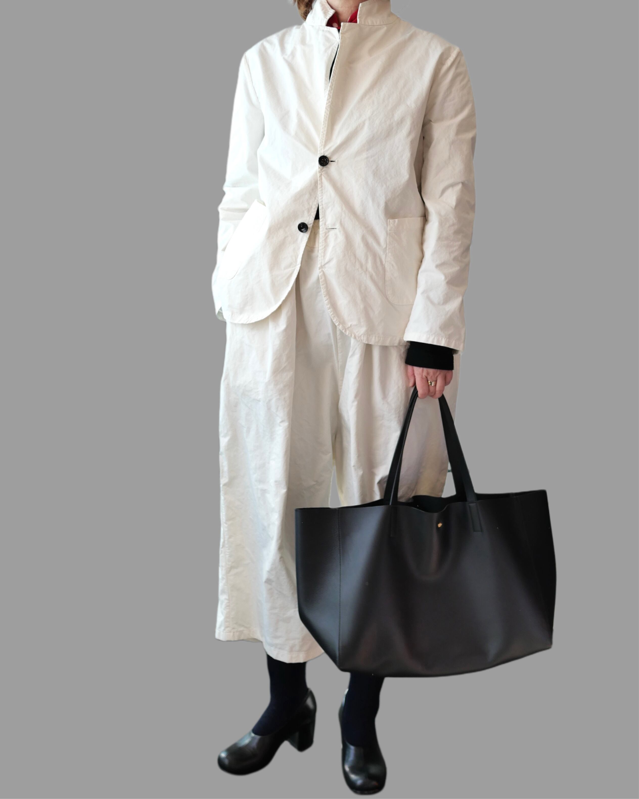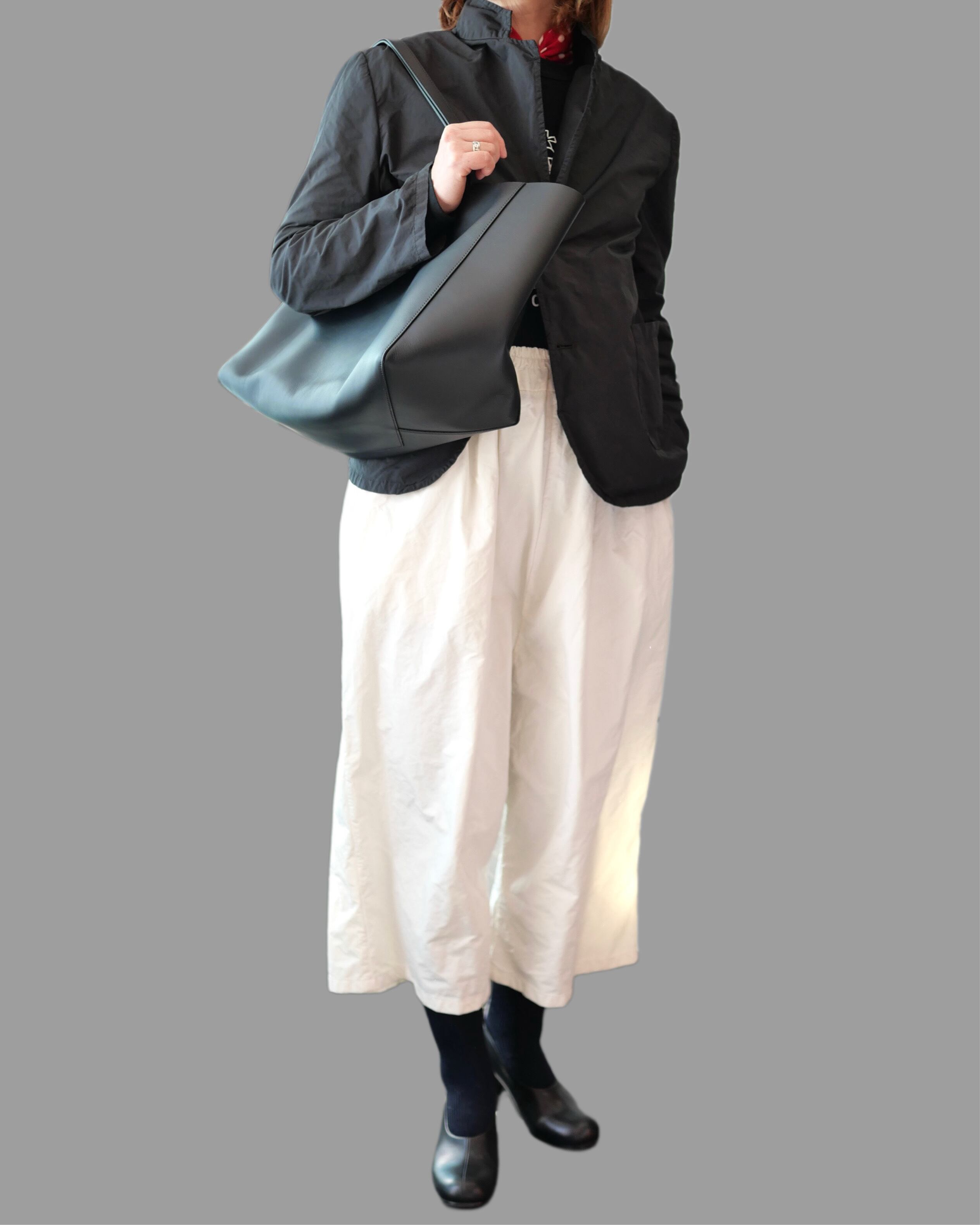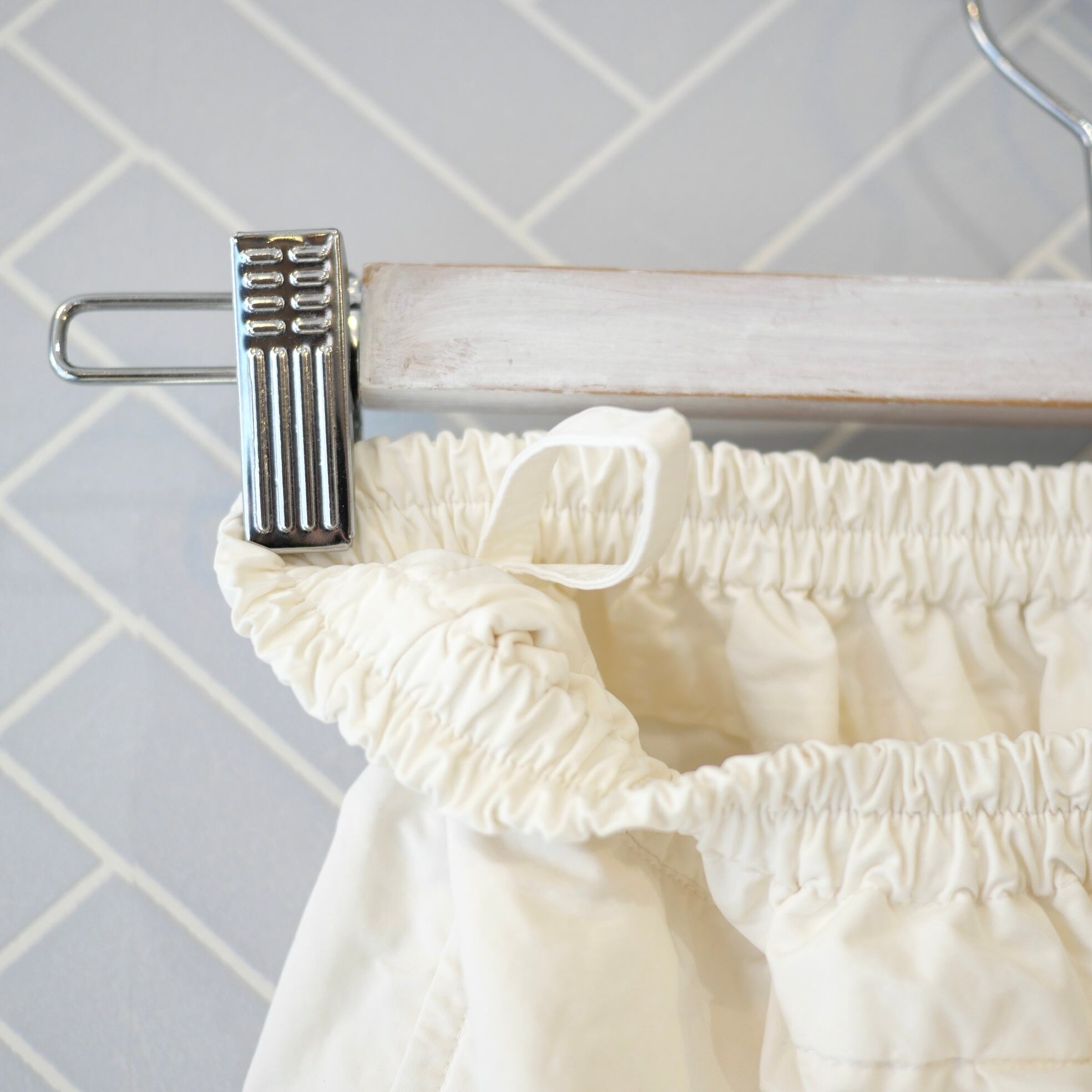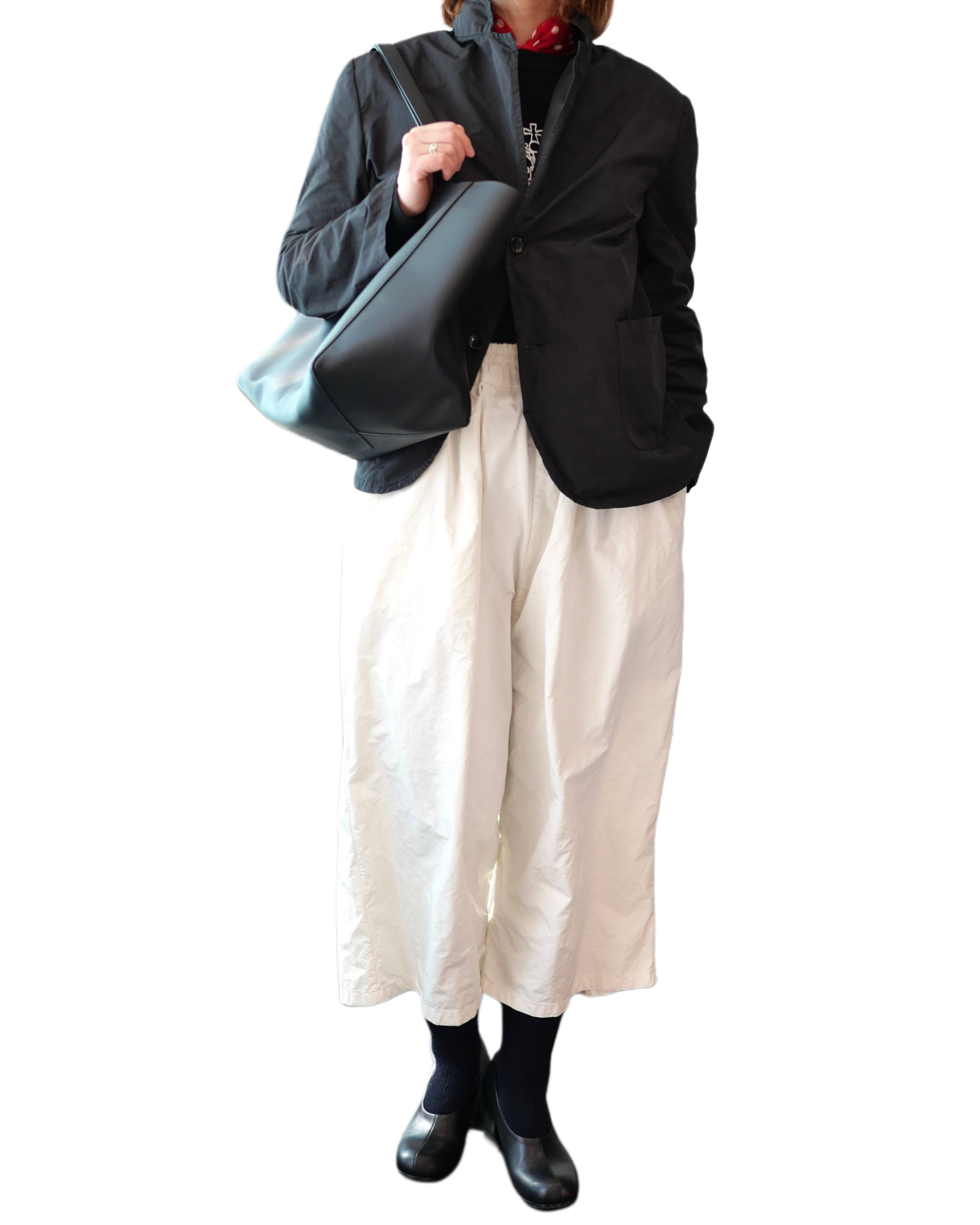 風を通さないポリナイロンの、シャカシャカ素材、ガーメントダイシリーズです。シワ感があって着やすいR&D.M.Co-の人気素材。すっきりとしたゴムパンツは楽な履き心地ながら綺麗めなスタイリングで好評のデザインです。寒い季節は中にレギンスやタイツを入れて、暖かい季節には一枚で着ていただけます。程よく厚みがあるので透けずに便利。