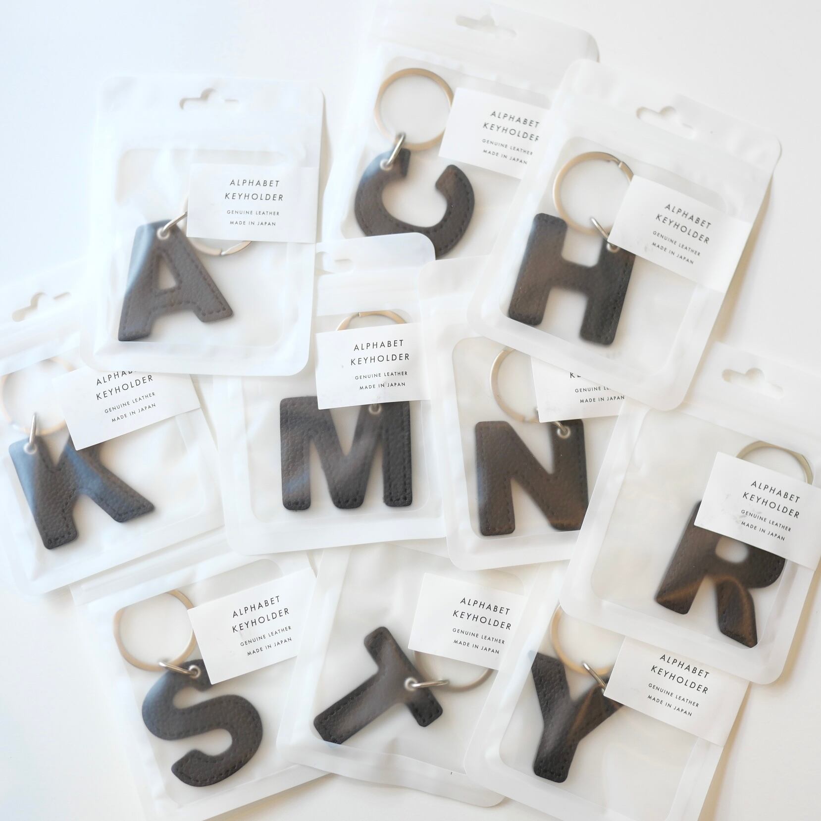 日本製のカラフルでかわいい本革アルファベット型キーホルダー。