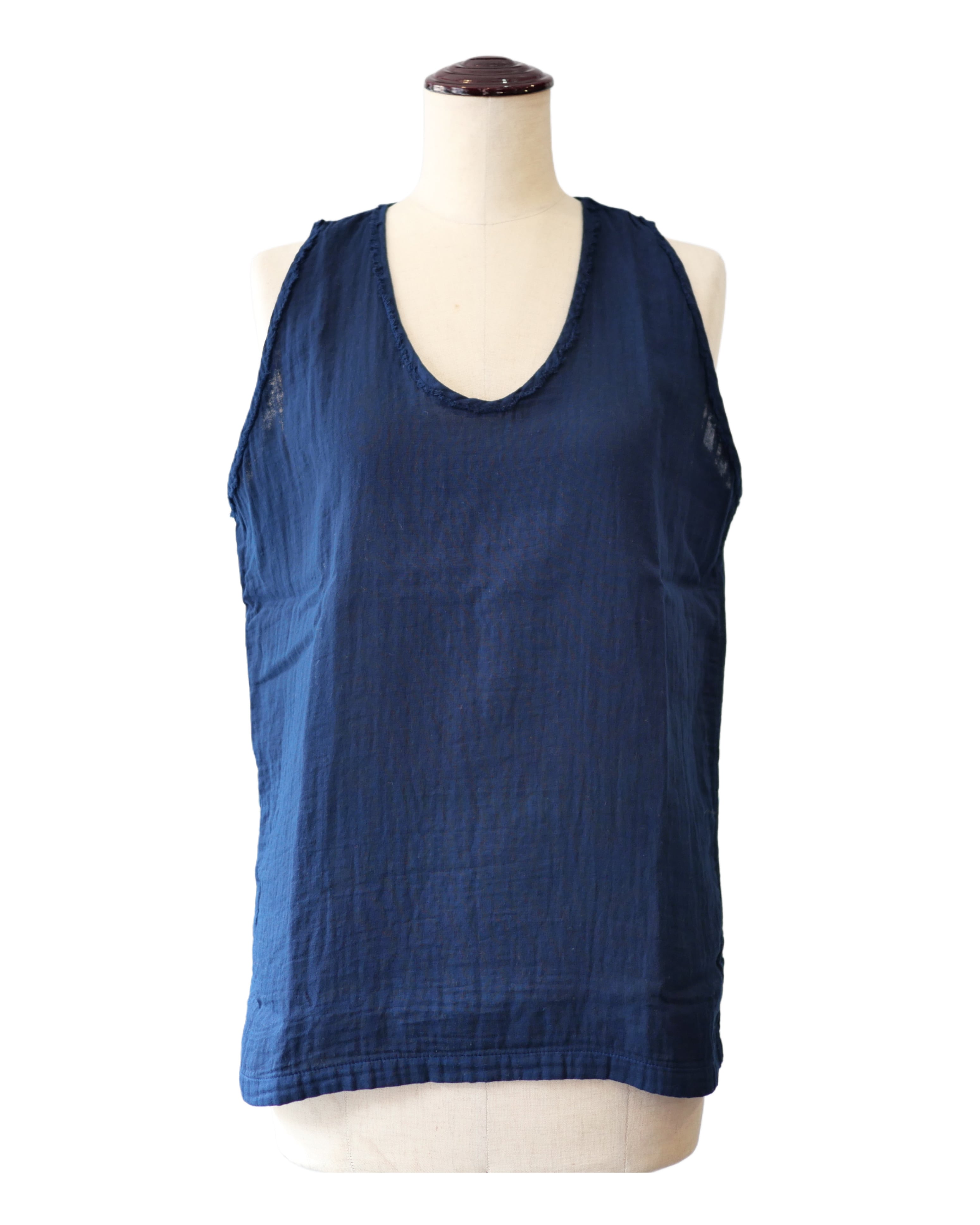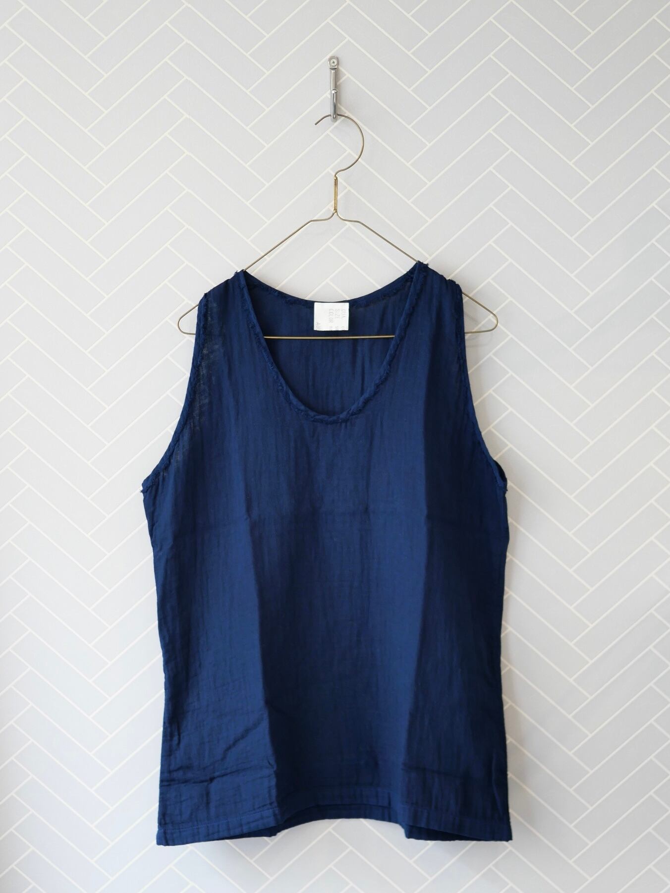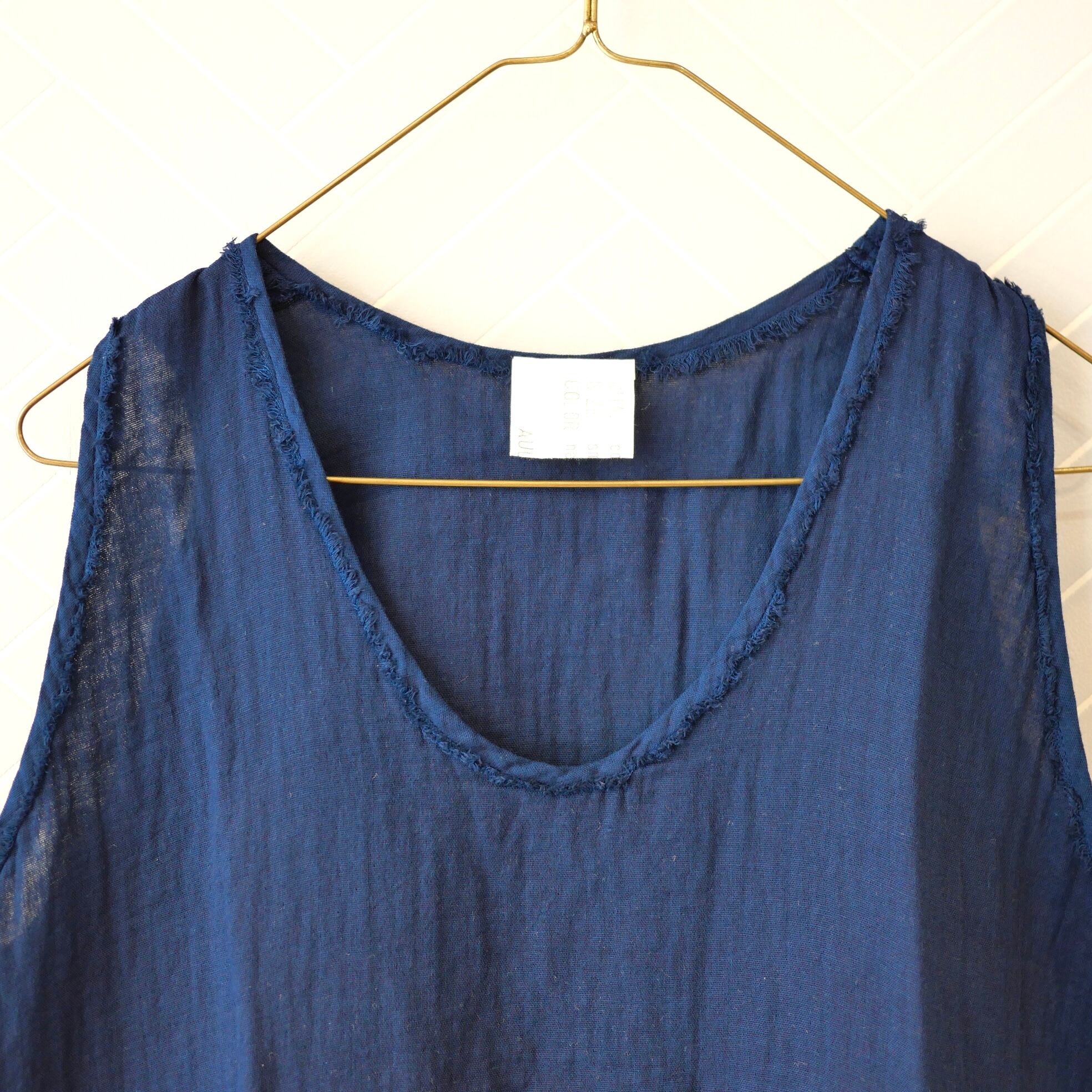 コットンガーゼの優しい素材を使った布帛タンクトップ。程よい隙間があって真夏の暑い日のインナーとして涼しく最適なタンクトップです。見えてもいい素材感ですのでレイヤードアイテムとして便利にお使い頂けます。爽やかな自然素材の着心地をどうぞ。