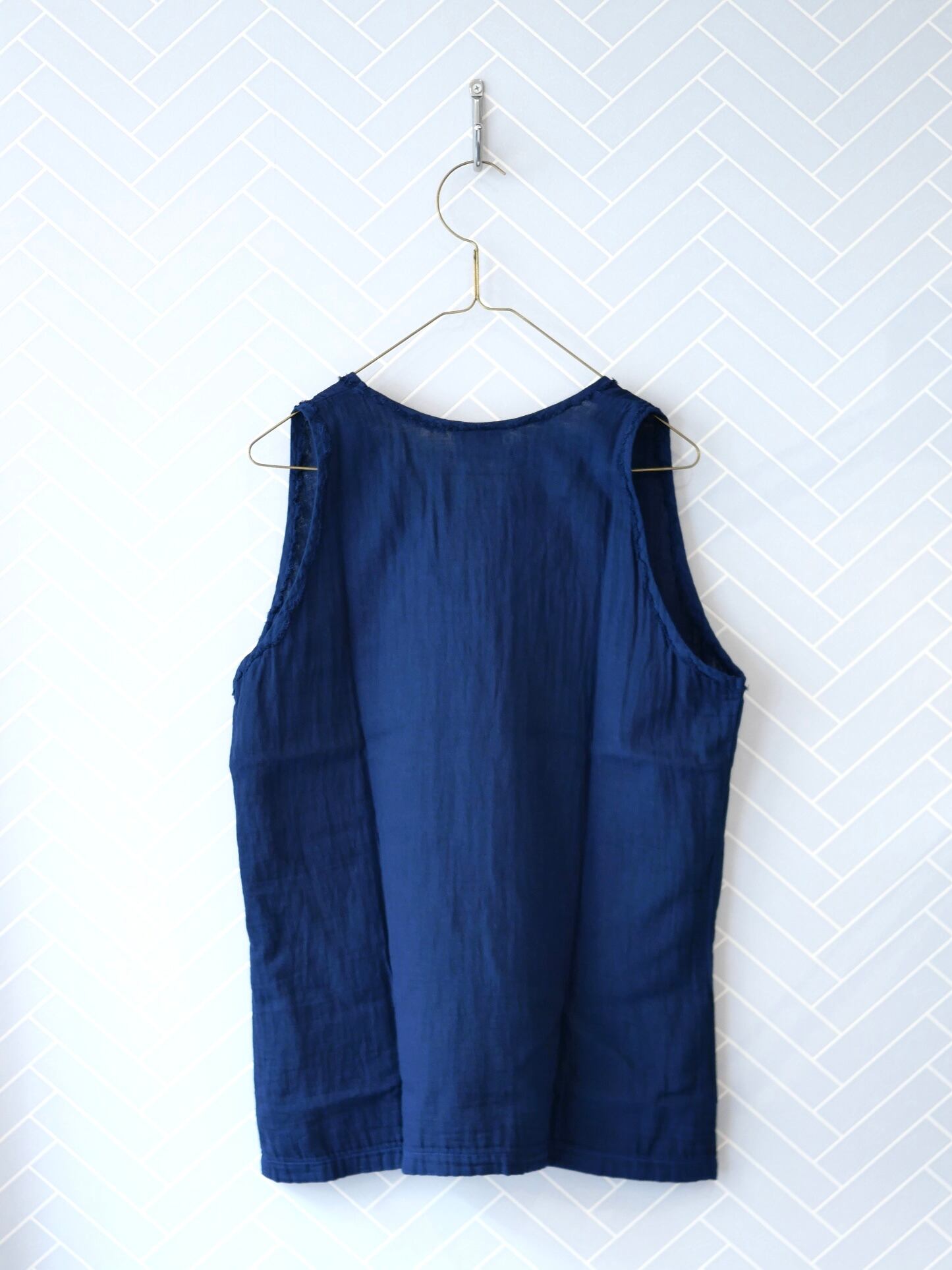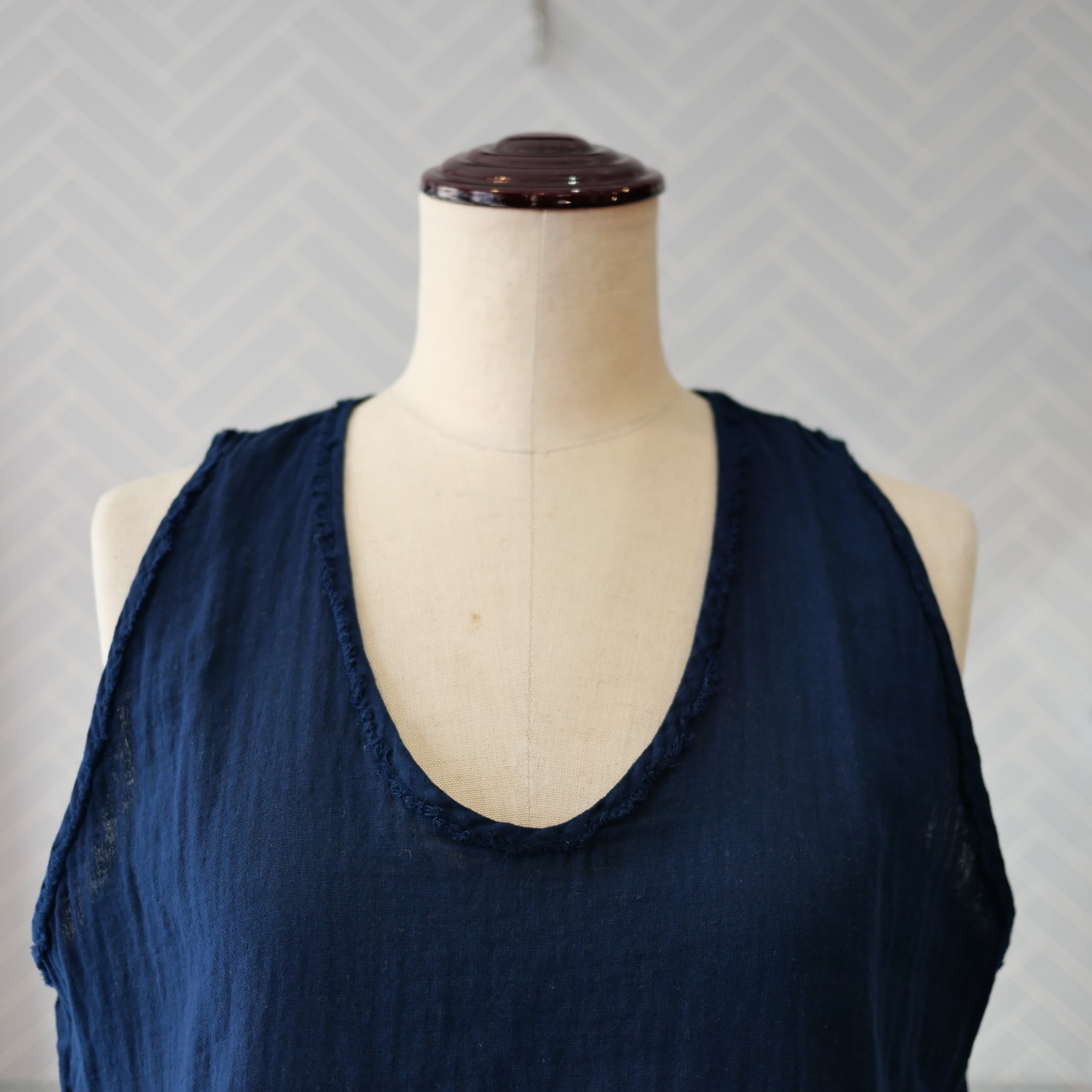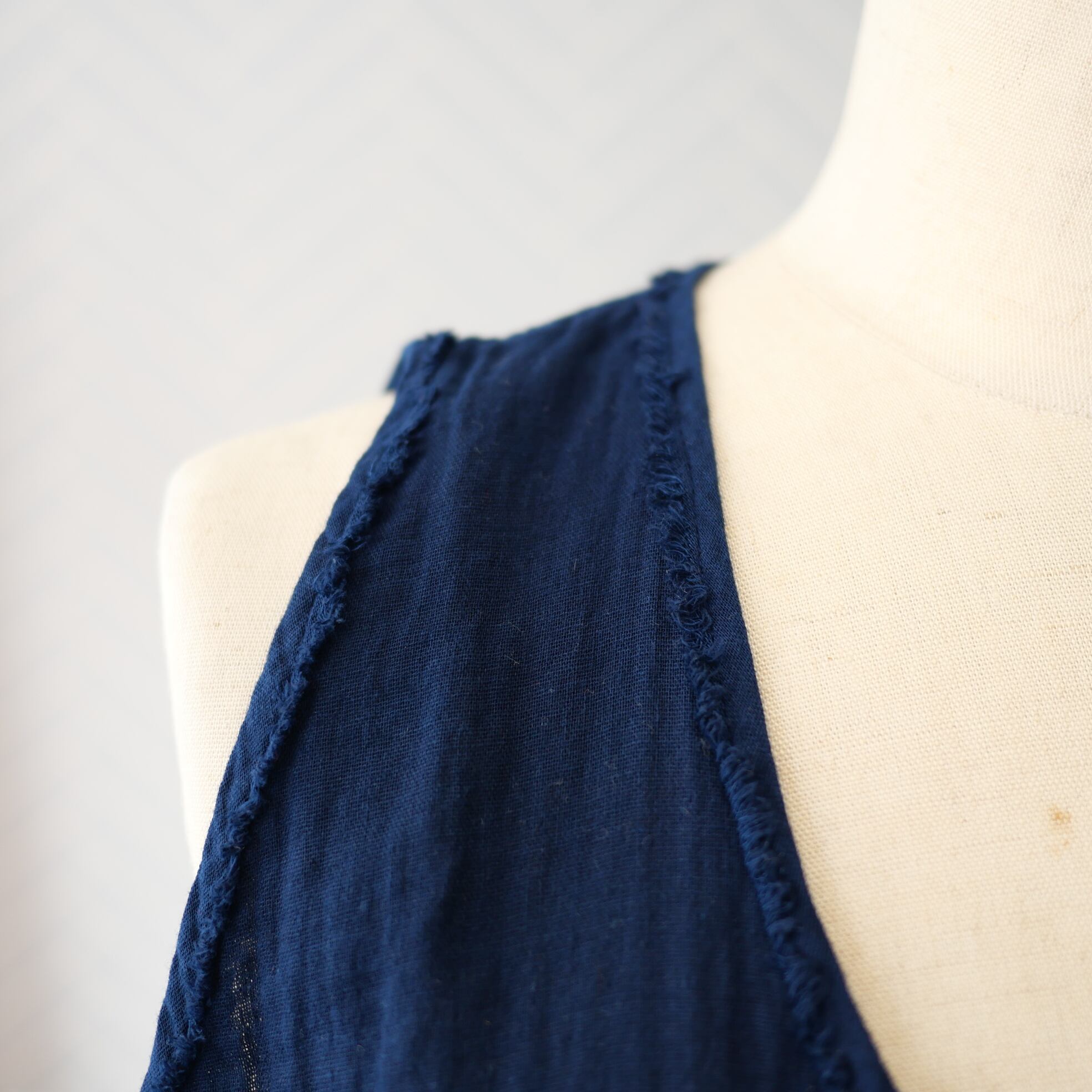コットンガーゼの優しい素材を使った布帛タンクトップ。程よい隙間があって真夏の暑い日のインナーとして涼しく最適なタンクトップです。見えてもいい素材感ですのでレイヤードアイテムとして便利にお使い頂けます。爽やかな自然素材の着心地をどうぞ。