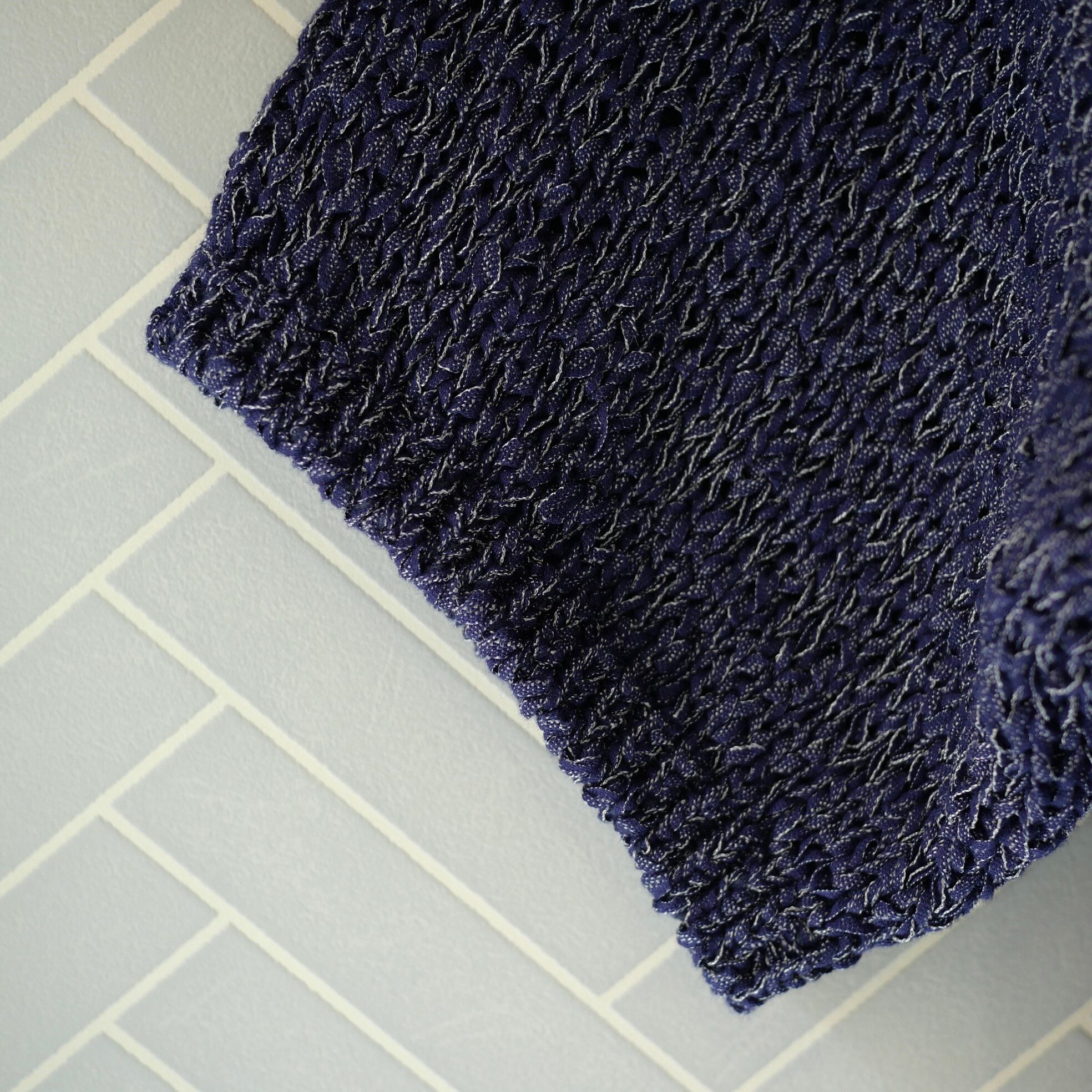 ハンドニットのような風合いと、デニム地を思わせる繊細なツートーンカラーが特徴的です。