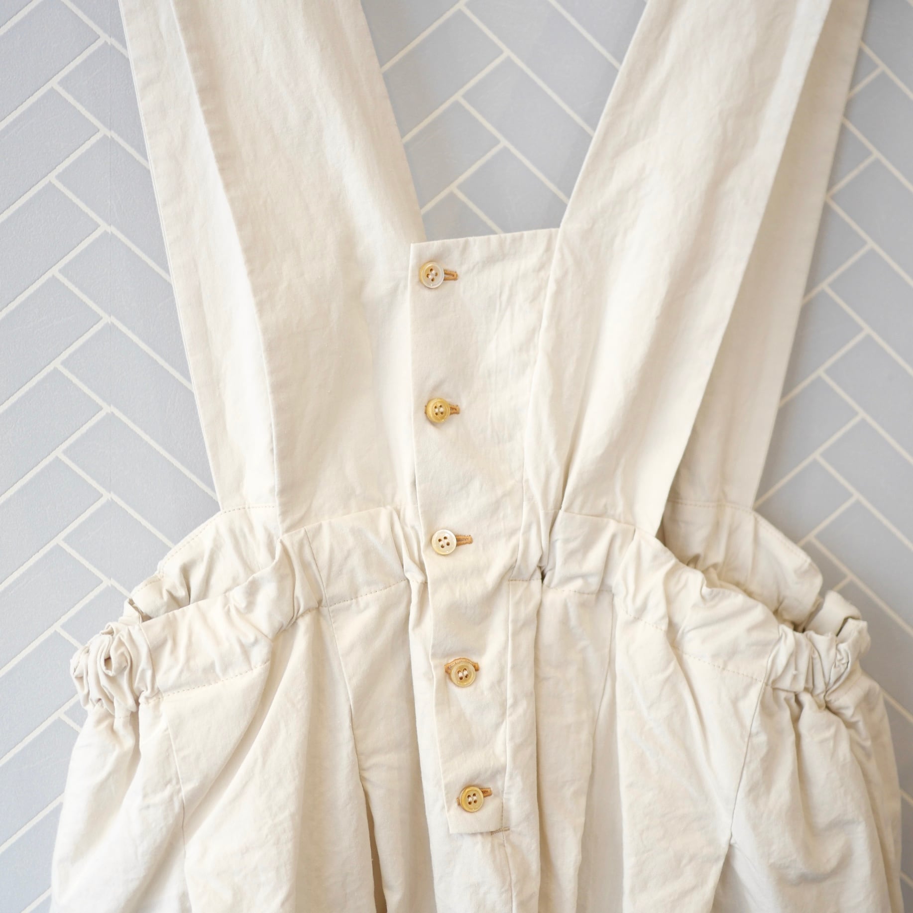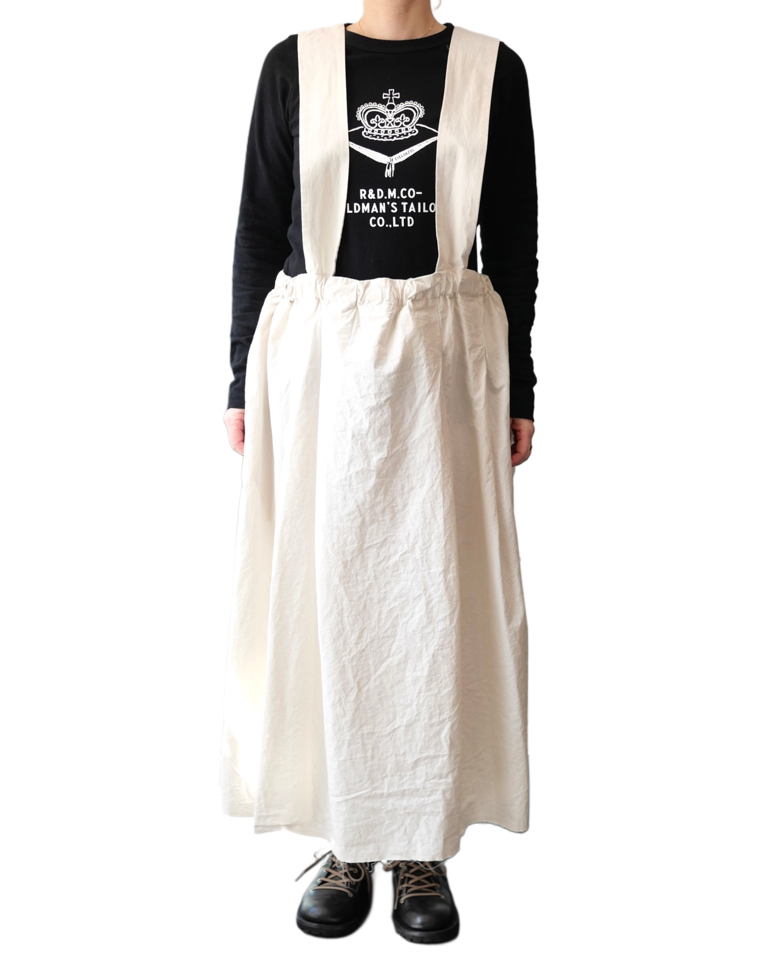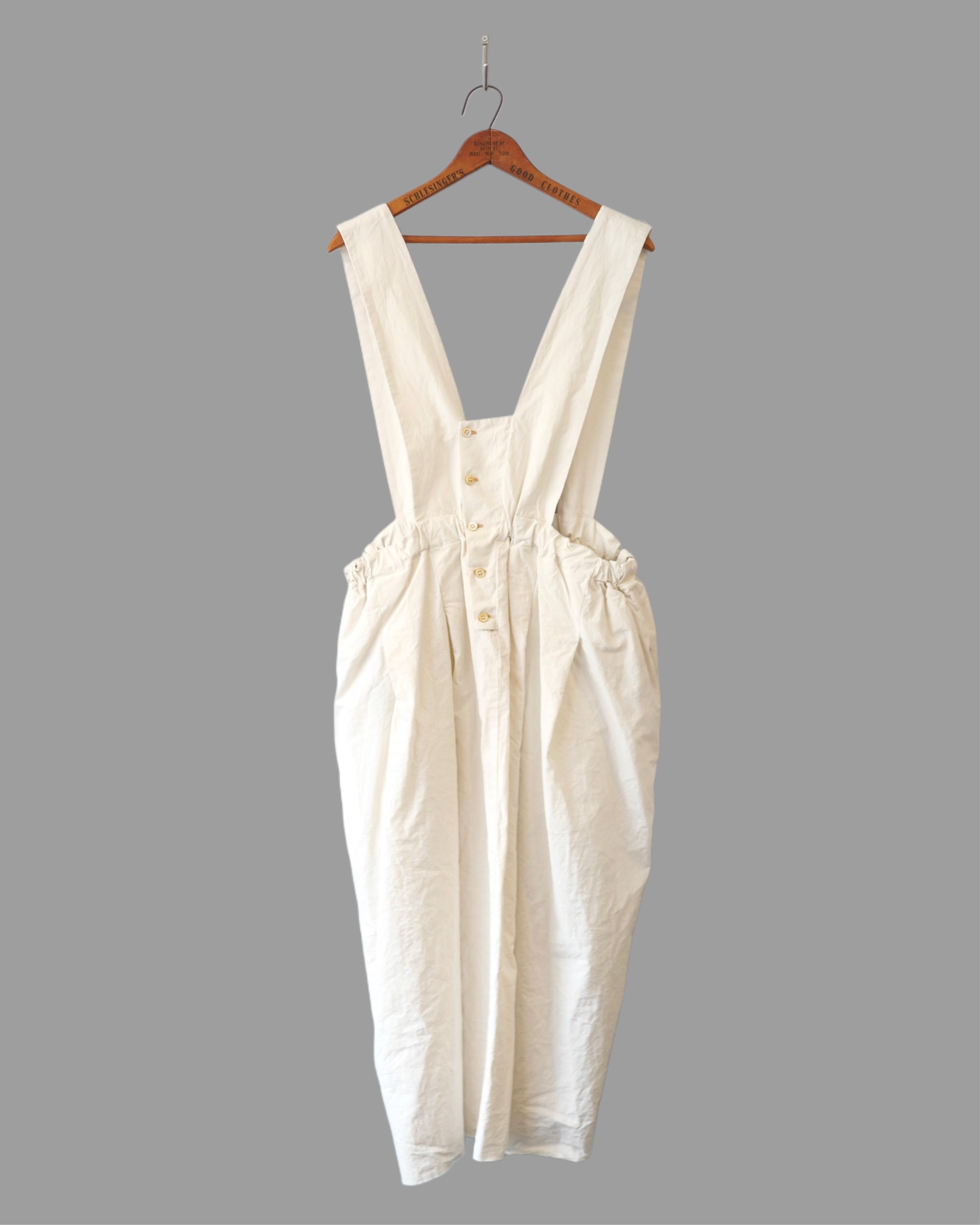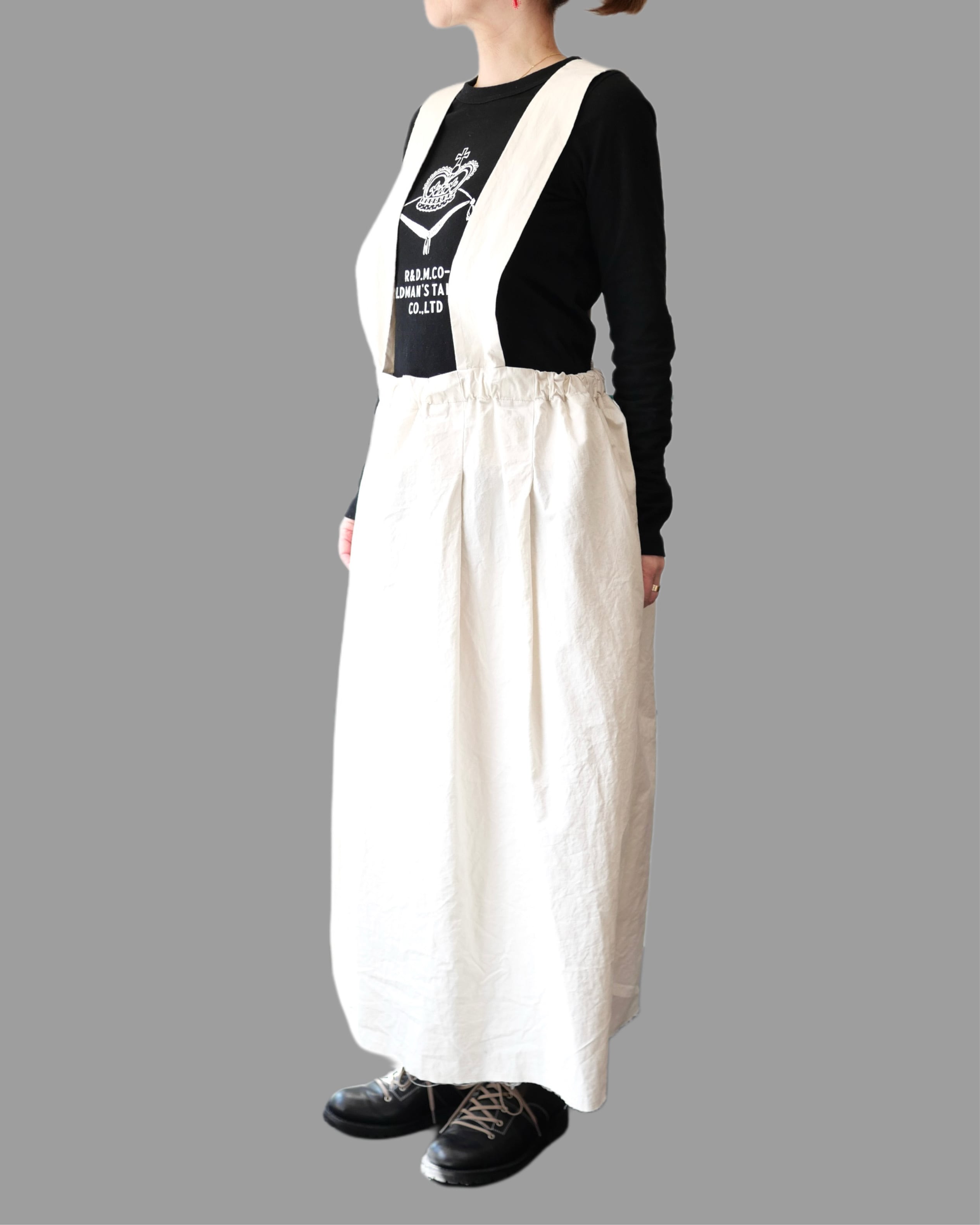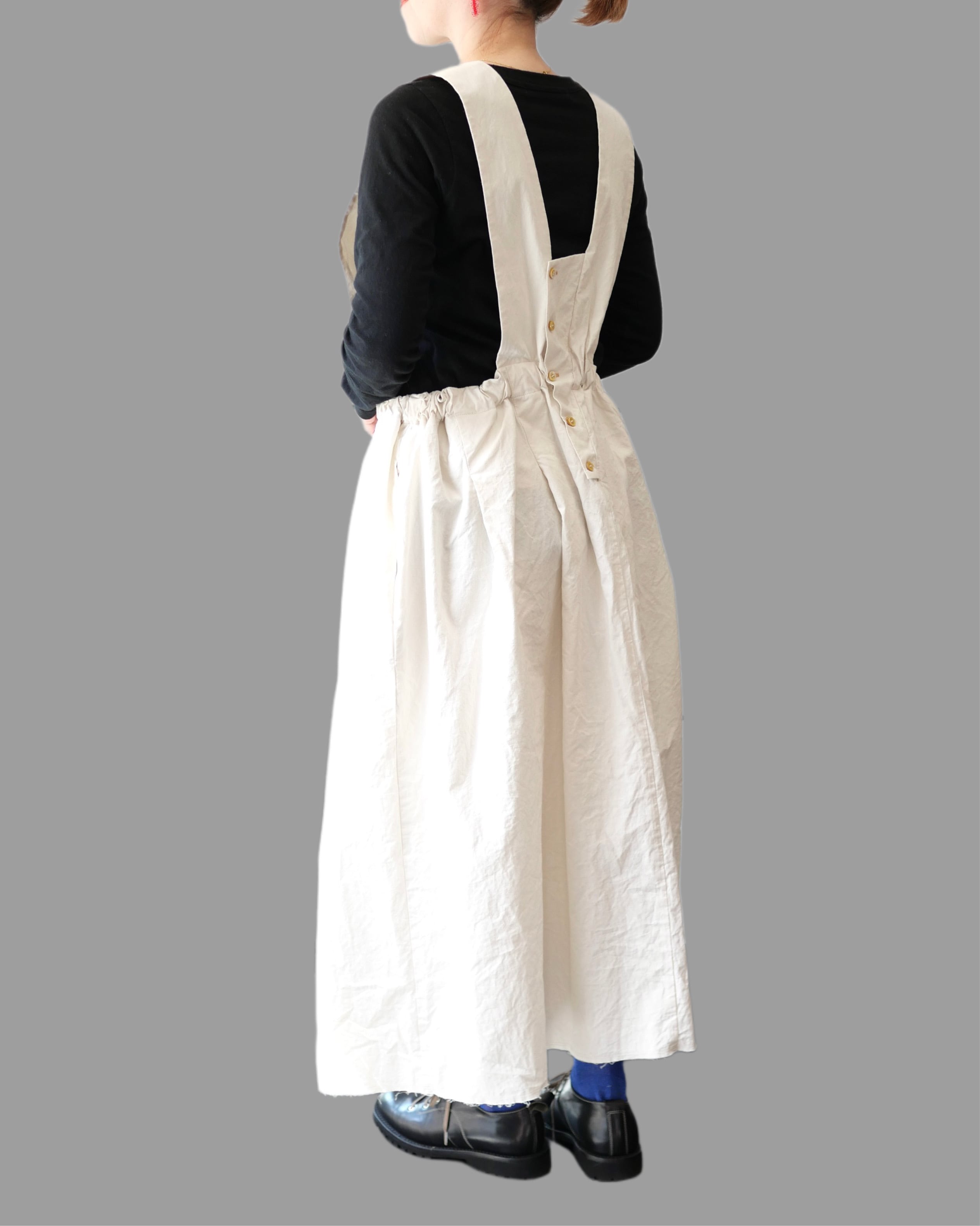 コットンリネン混紡糸を使用し、ゆっくりと時間をかけて超高密度に織った生地をたっぷりと贅沢に使ったジャンバースカート。ヴィンテージ生地のような繊細なタッチが特徴的。