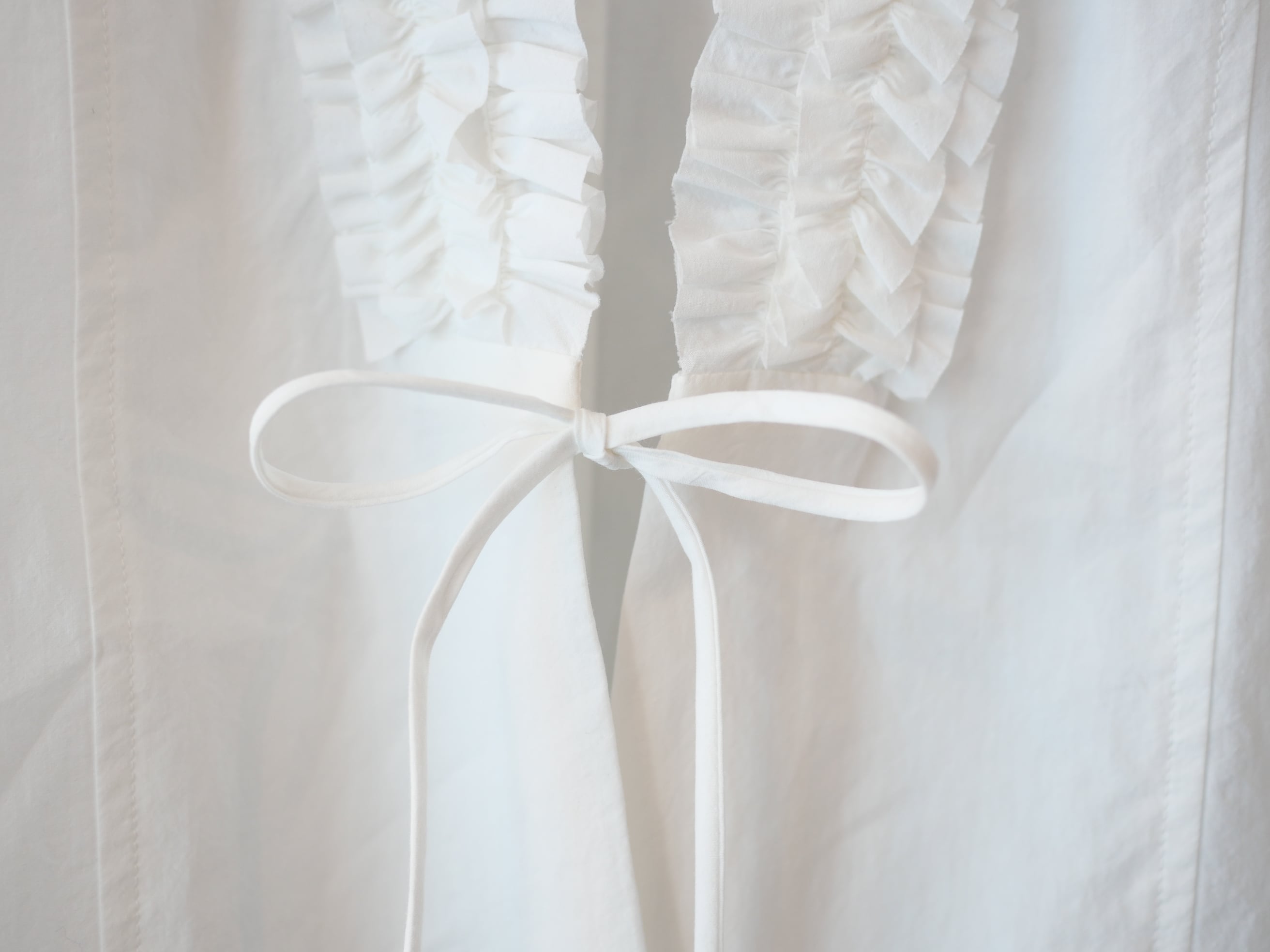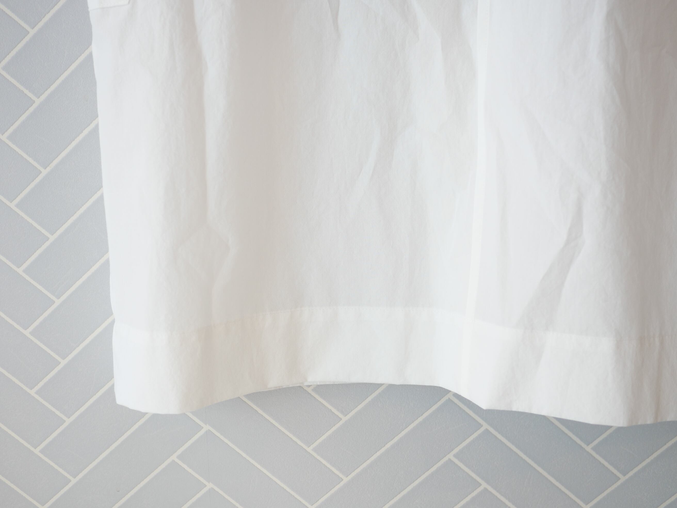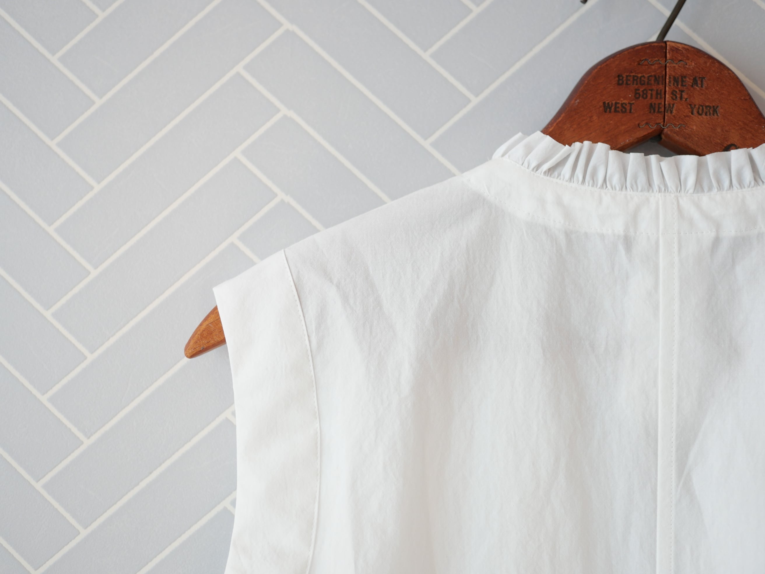 染色前に生地を繰り返し揉み込むことにより洗いざらしのしわ形状とソフトな膨らみ感を出した近江晒の綿100%80タイプライター。裁ち切りのギャザーを襟元にデザインしたショートジレ。すっきりとしたVネックのショートジレ、暑い夏のレイヤードアイテムとしてお役立てください。