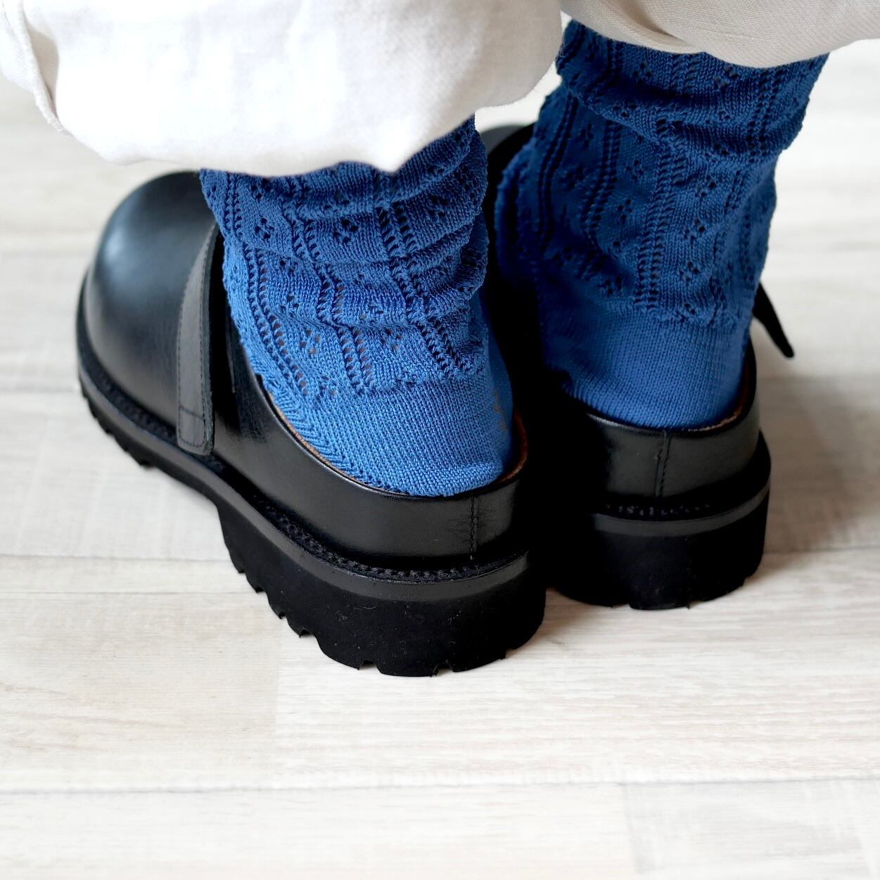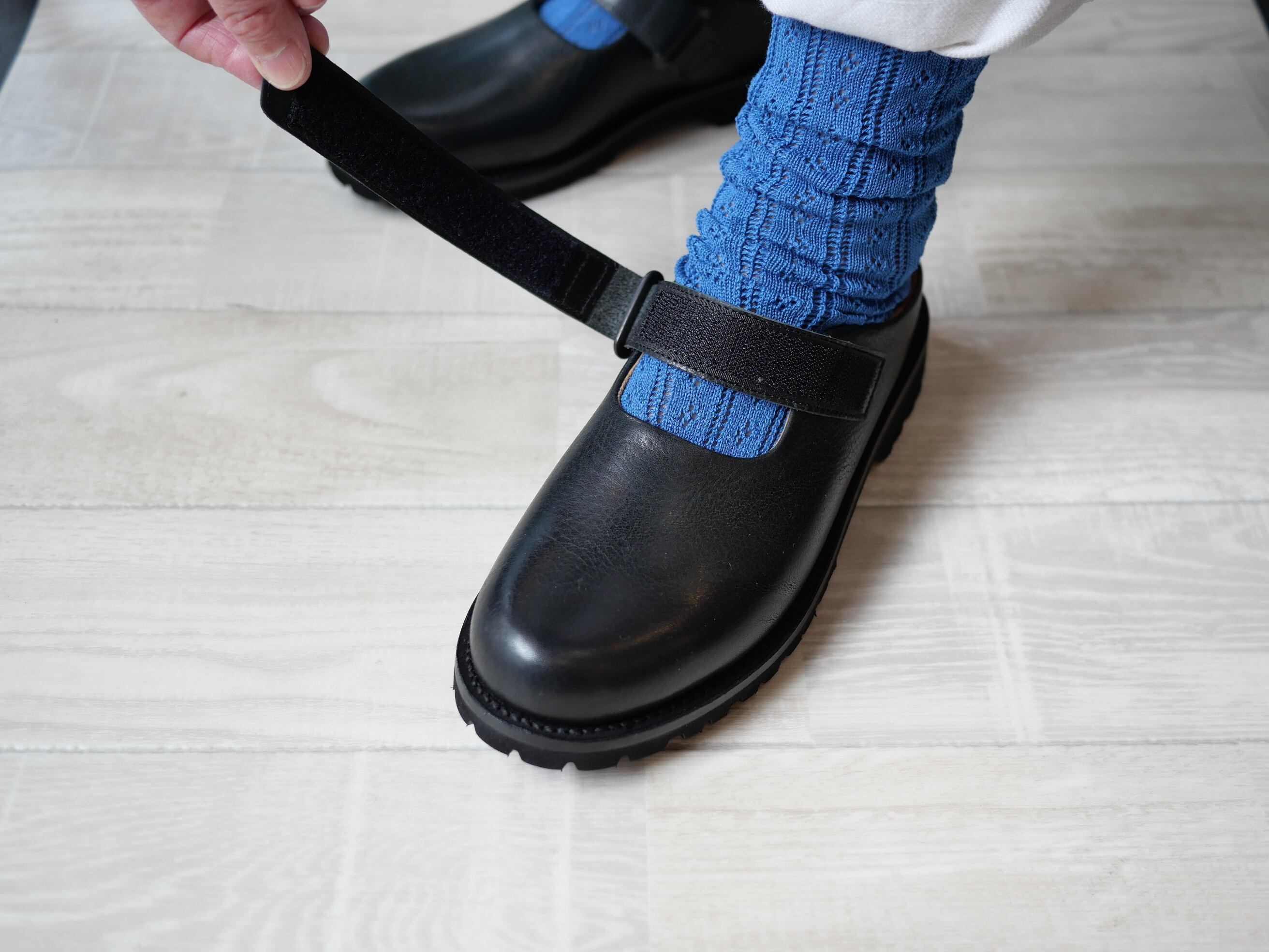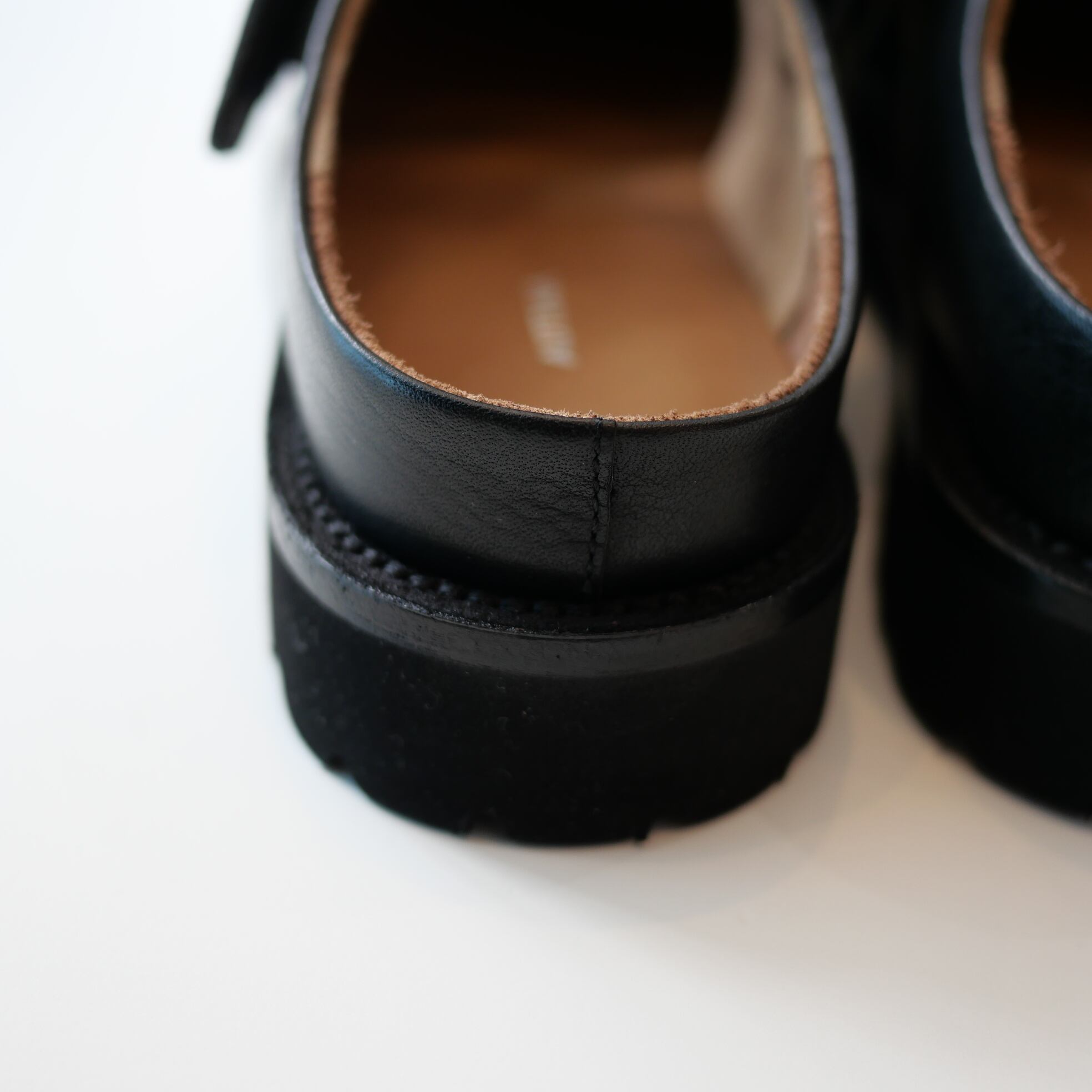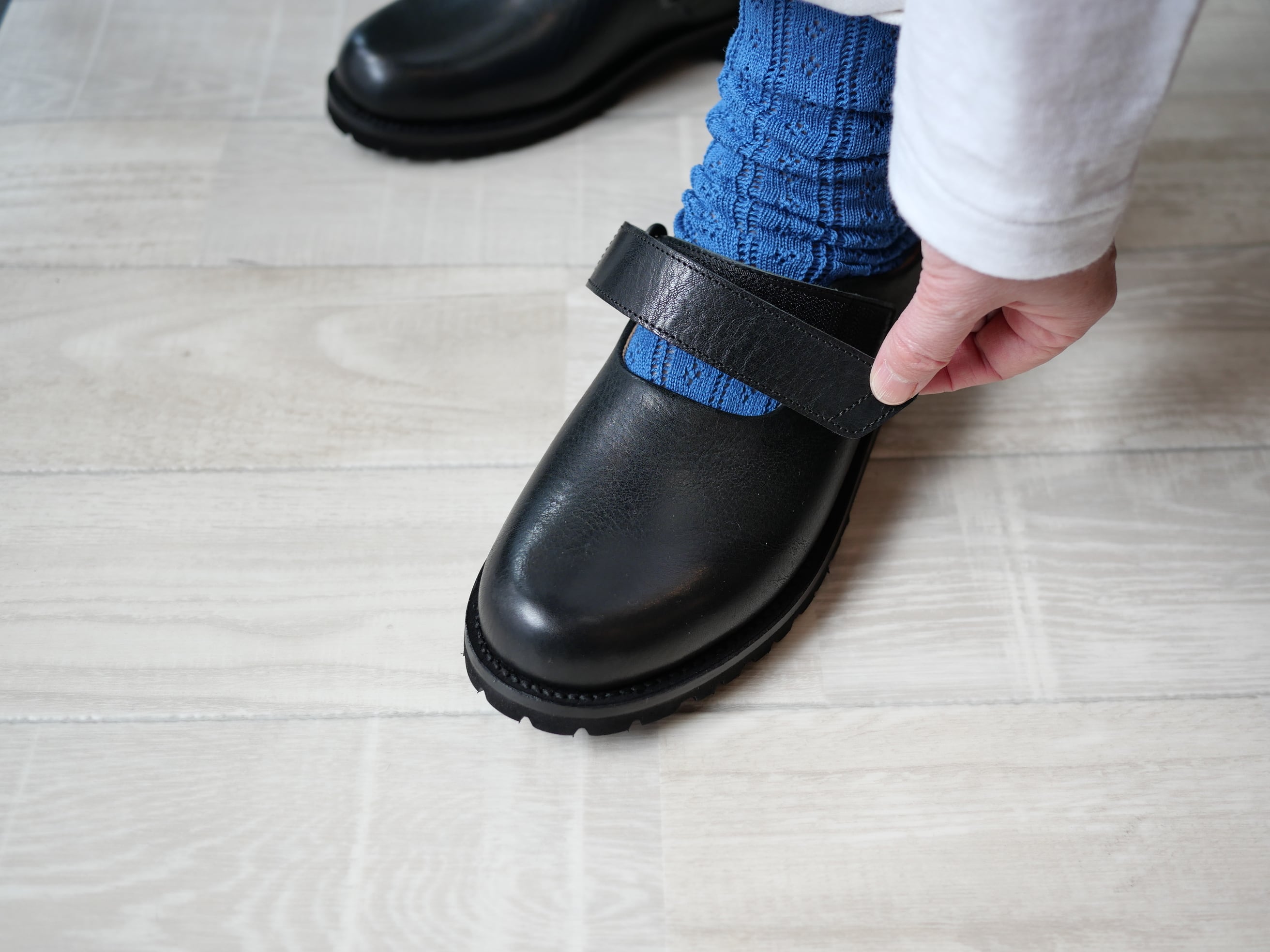 大道芸人(Busker)が履いていそうな野暮ったさとボリューム感が絶妙なバランスの、サボ型スリッポンです。天然のシボが特徴のショルダー革を使用し、墨黒を連想する独特な黒が魅力。歩行が楽なvibrant社製のタンクソールを使用し、踵部分が少しあるので、脱げそうな不快感が軽減されています。またストラップはベルクロで着脱するタイプなので甲のサイズに合わせてご使用頂けます。