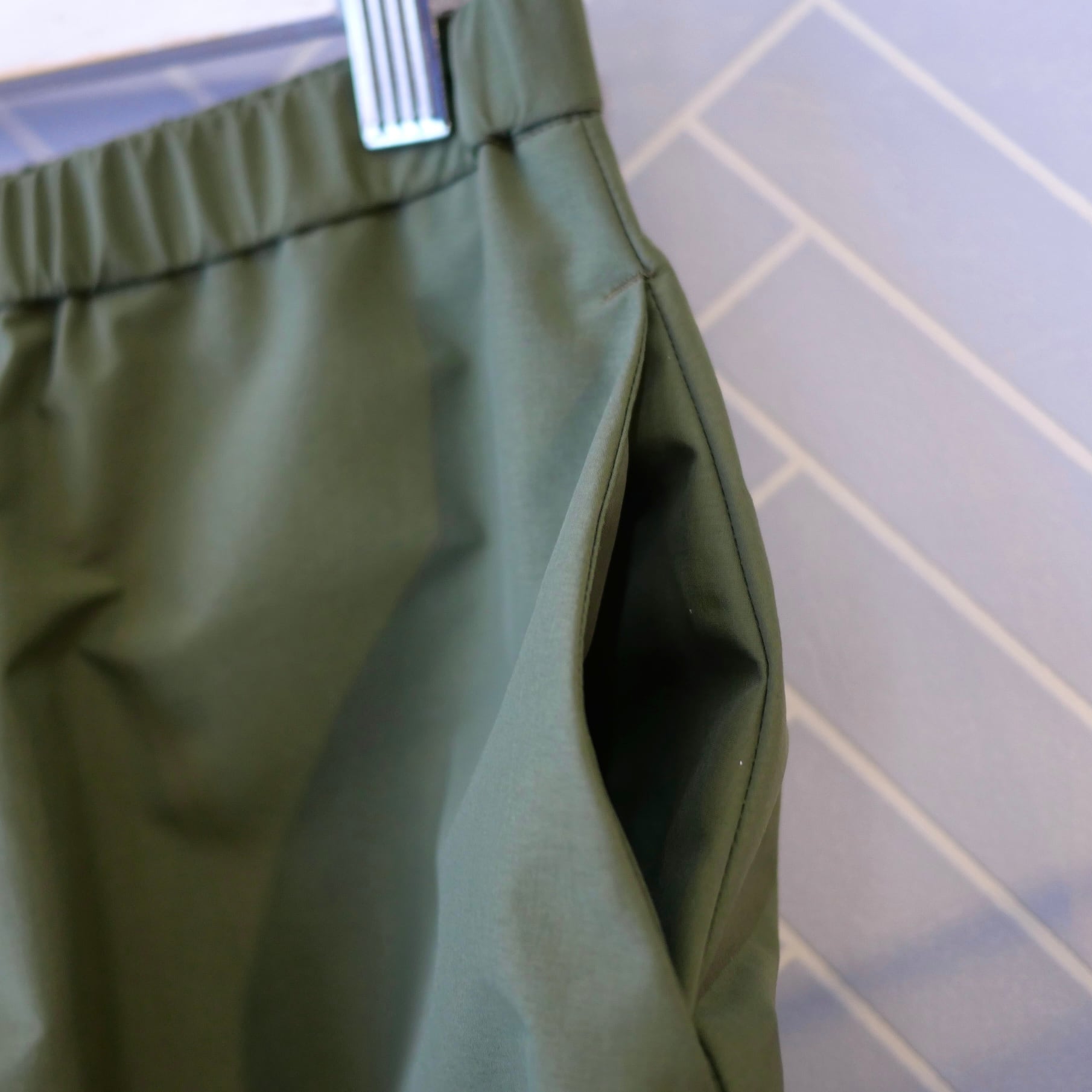 防水加工が施されたウォータープルーフシリーズのフレアスカート。上品な広がりでスマートなシルエットが魅力的です。ウエストはゴム仕様。両サイドにポケットがついています。