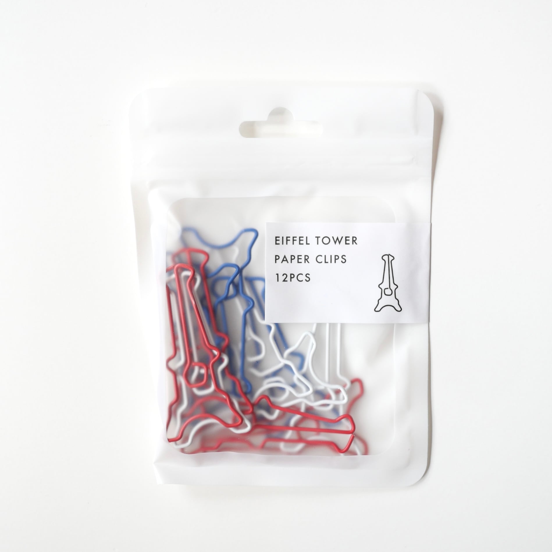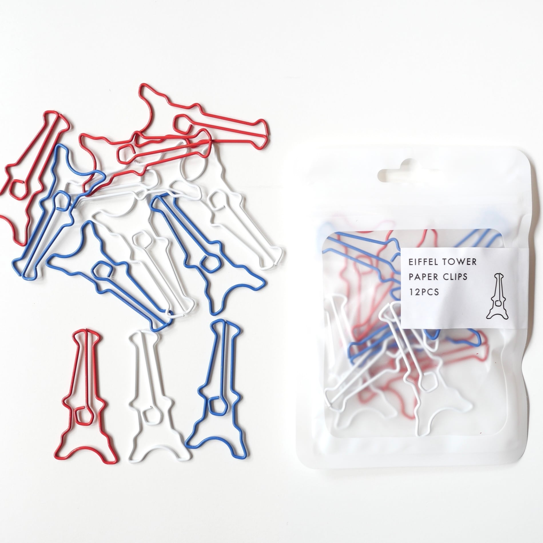 トリコロールカラーのエッフェルタワークリップ。レッド、ホワイト、ブルーのクリップの3色が4個ずつ入っています。