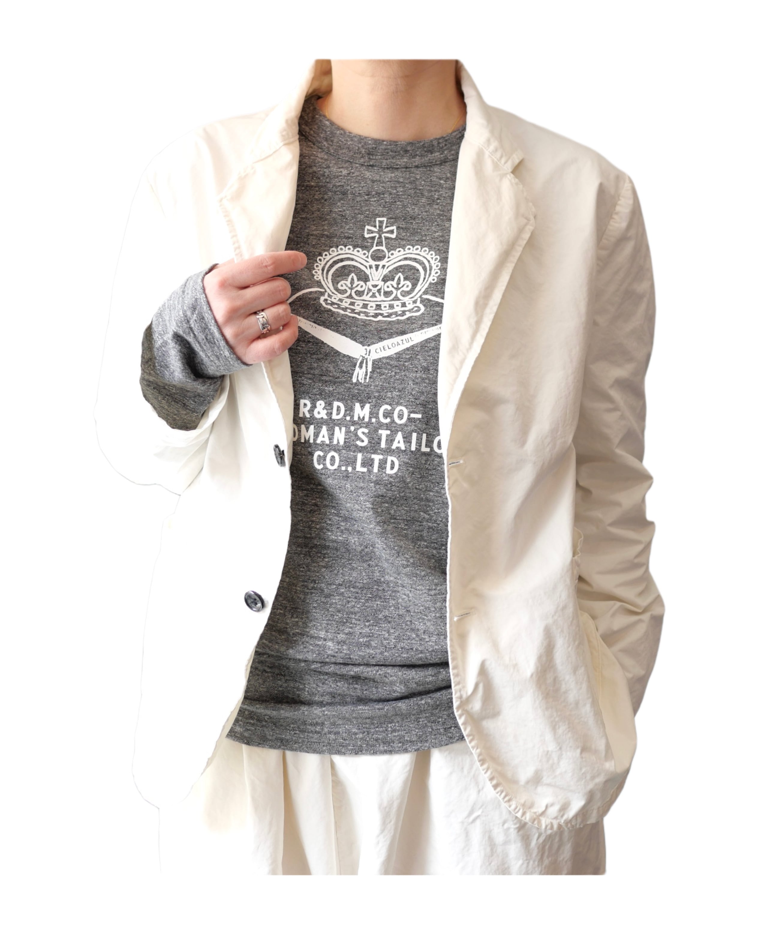 胸のクラウンプリントがクラシカルで上品なロンT。一枚でも決まる主役らしさもあり、ニットやジャケット、コートの中に着ていただく事で、見える位置にクラウン柄が配置され、インナーとしても最適な一枚です。こちらはCIELOAZULとR&D.M.Co-のコラボ別注アイテム、クラウンTシャツシリーズの第5弾として制作した限定品です。チャコールグレーにホワイトのプリントが可愛らしい雰囲気です。