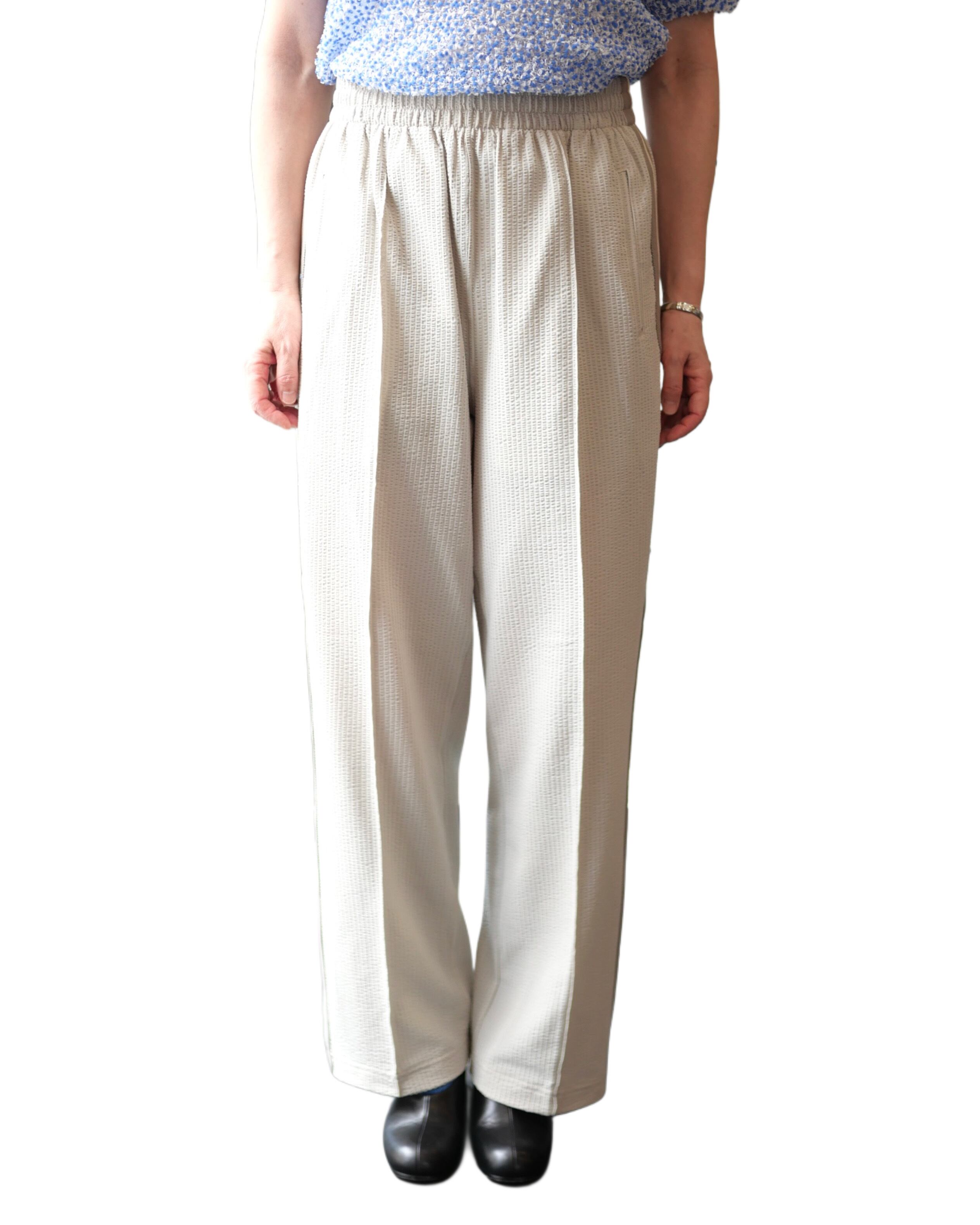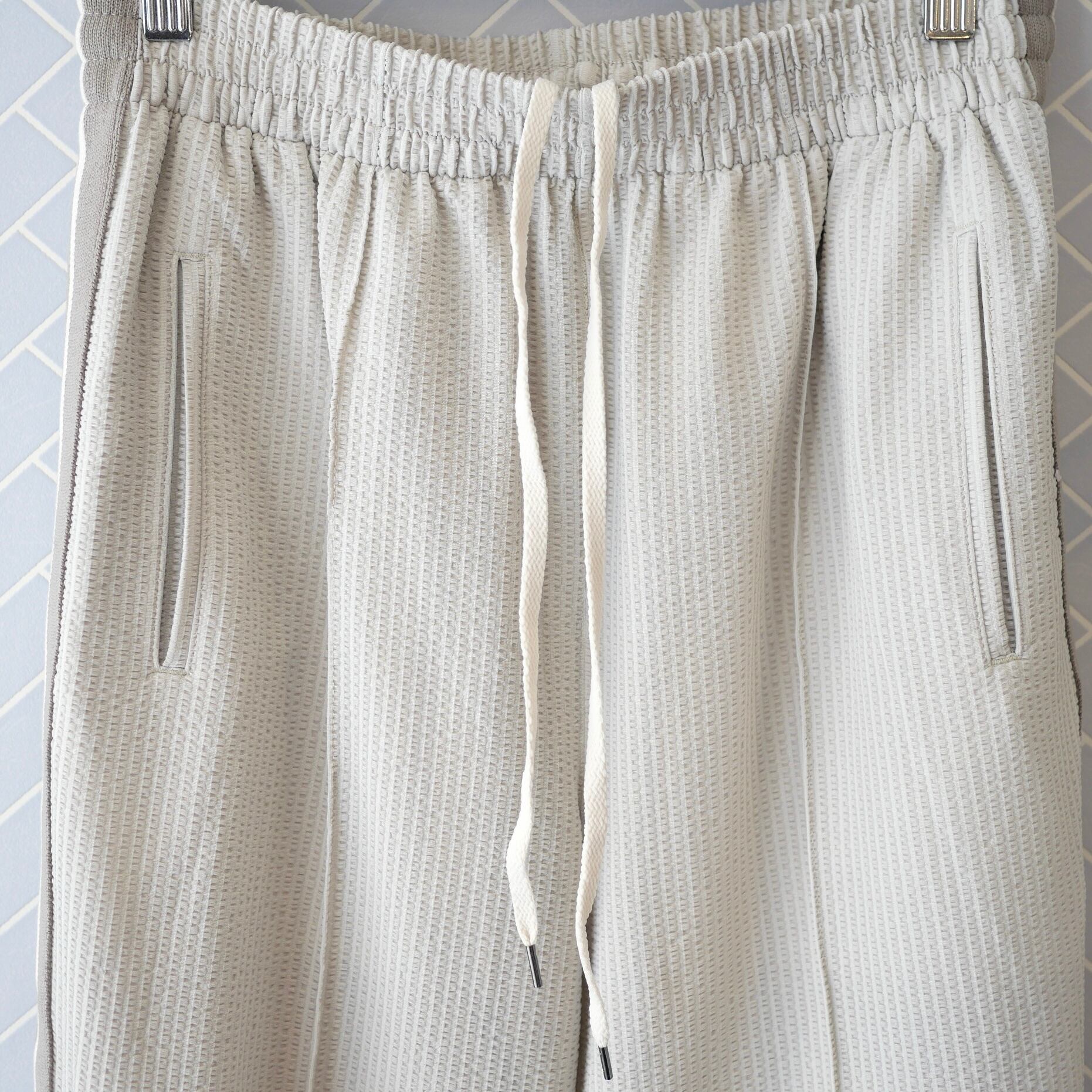 爽やかなサマースーツを思わせるシアサッカージャージーを使用。表面に程よい凹凸感とハリ感があり、足のラインを拾いにくいシルエットです。スラックスのような雰囲気を持つトラックパンツに仕上げています。
