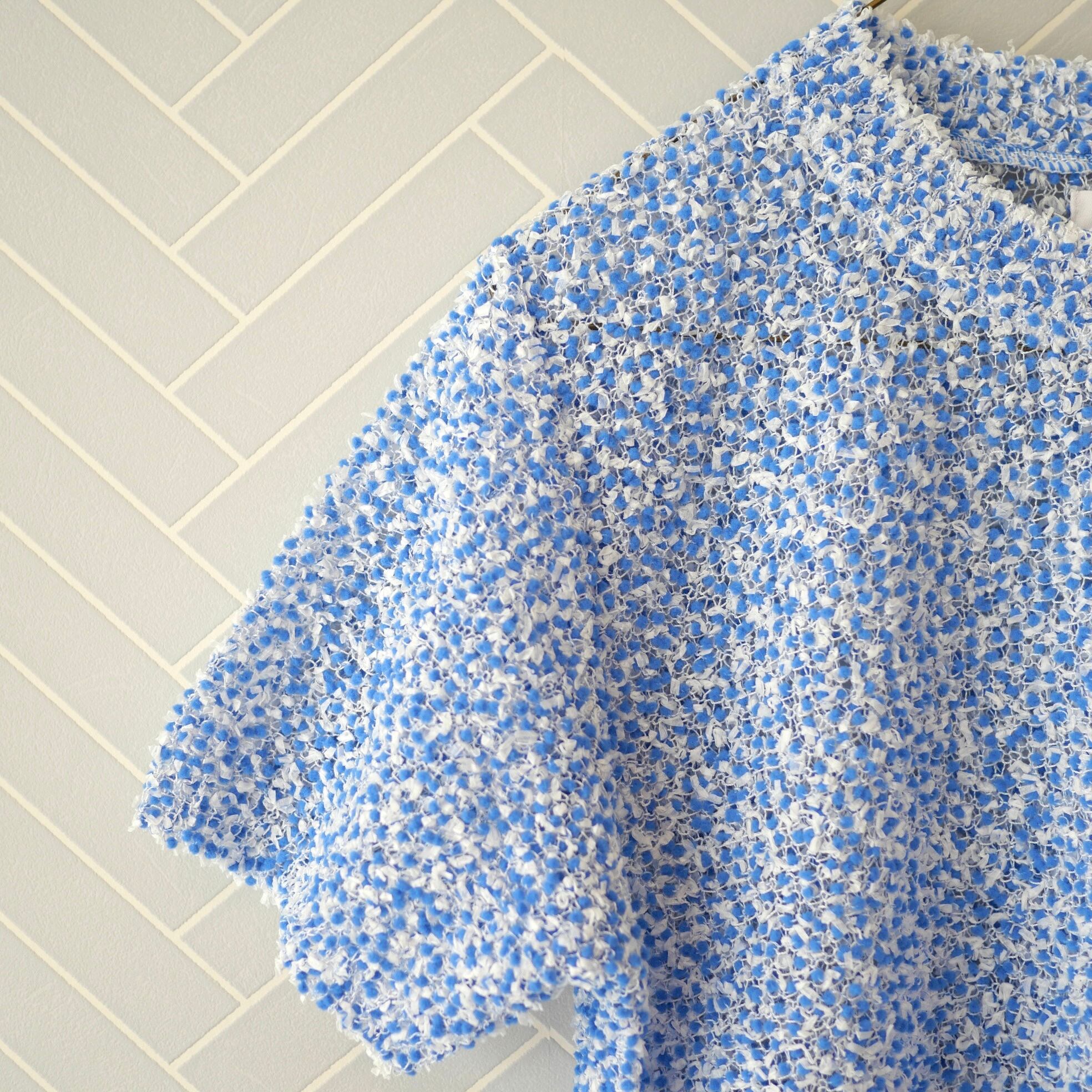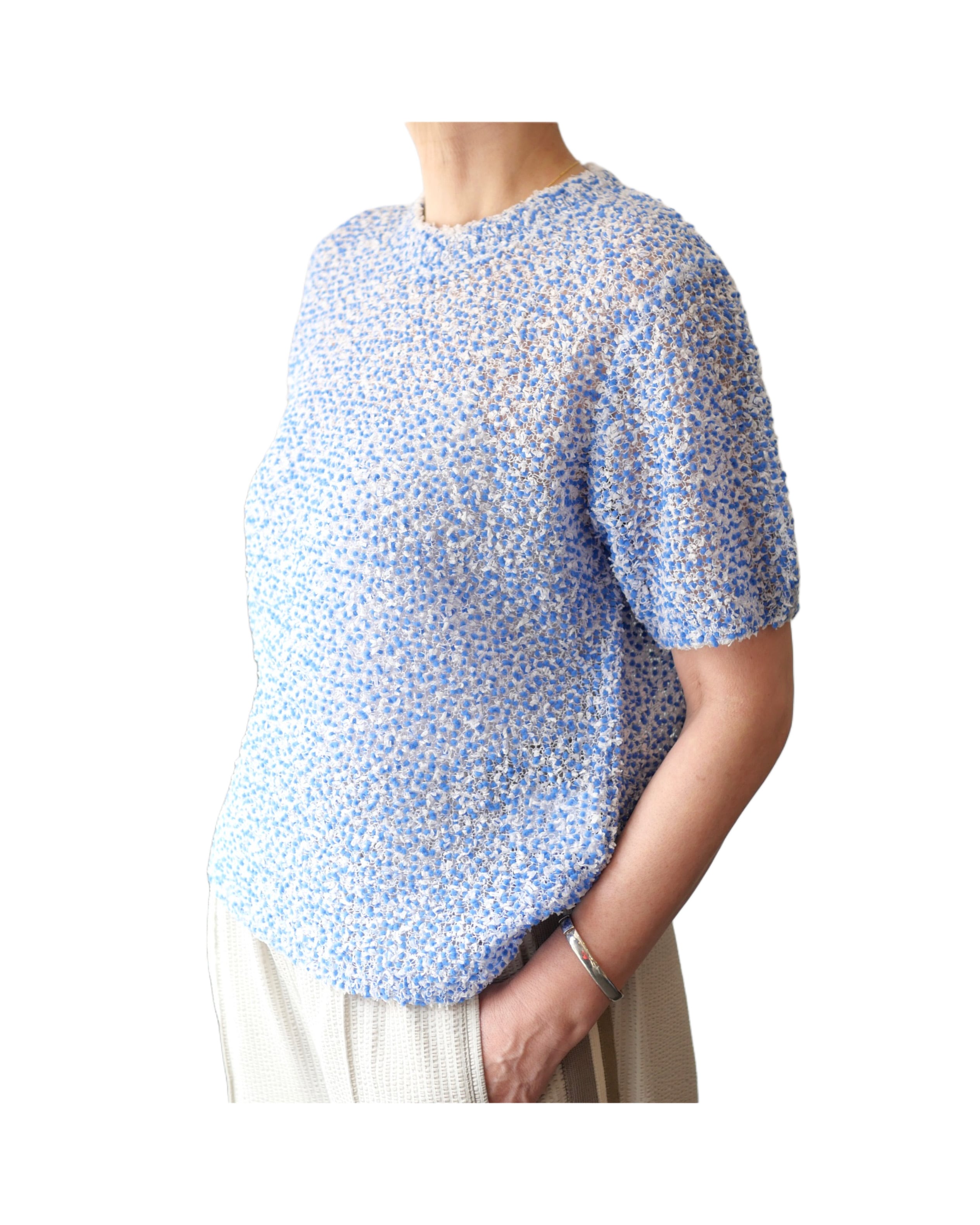 キュプラ100%のモール糸をベースに、ざっくりと編み上げた透け感のあるニットプルオーバー。