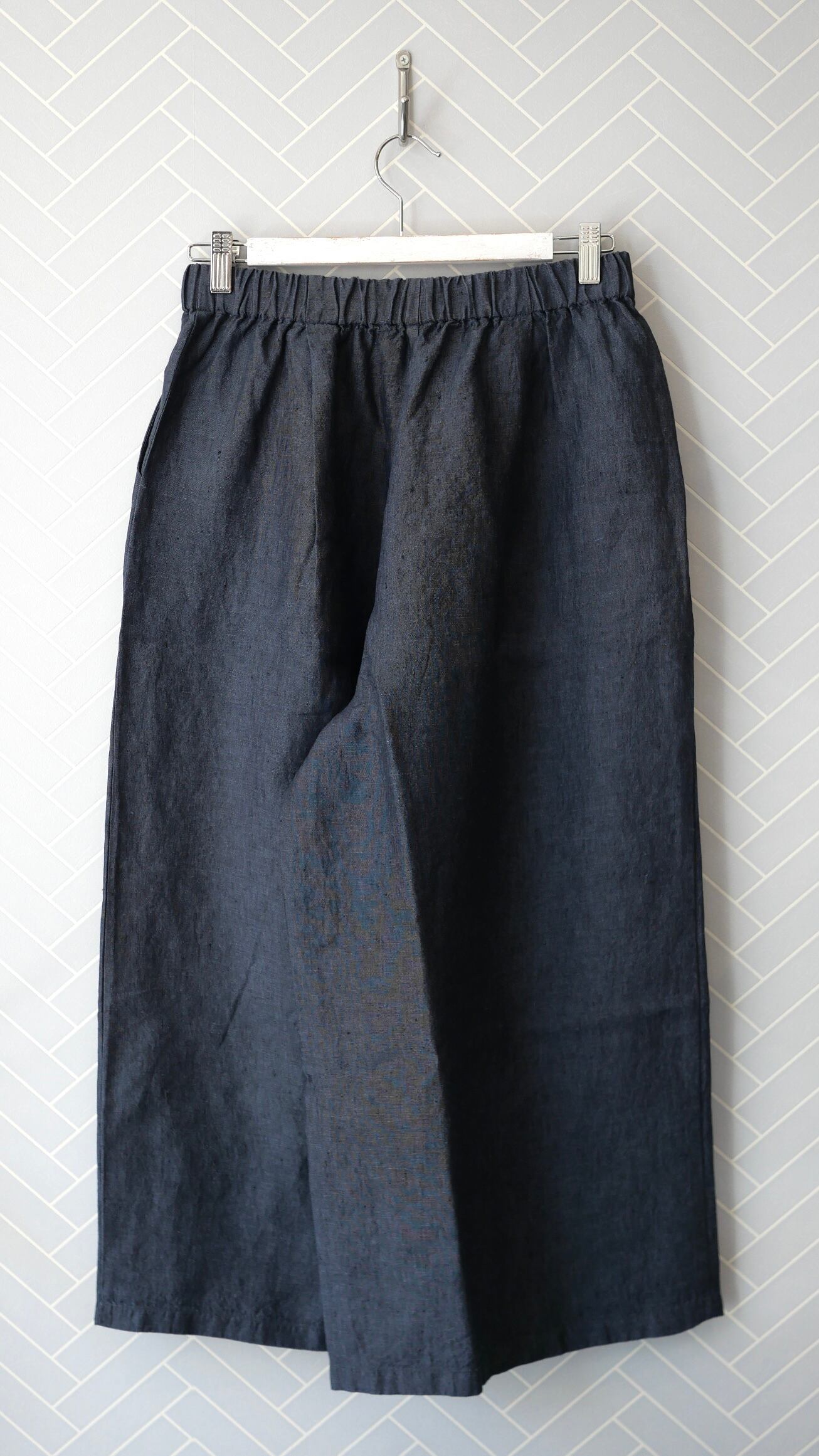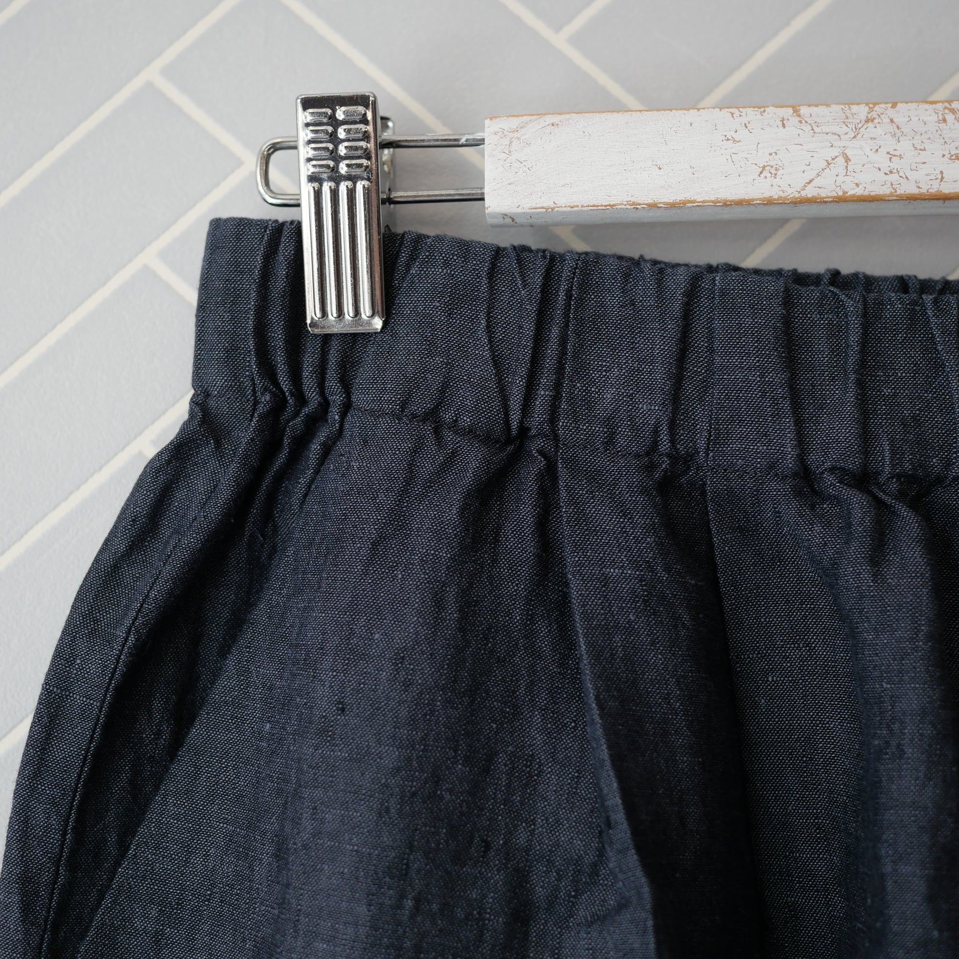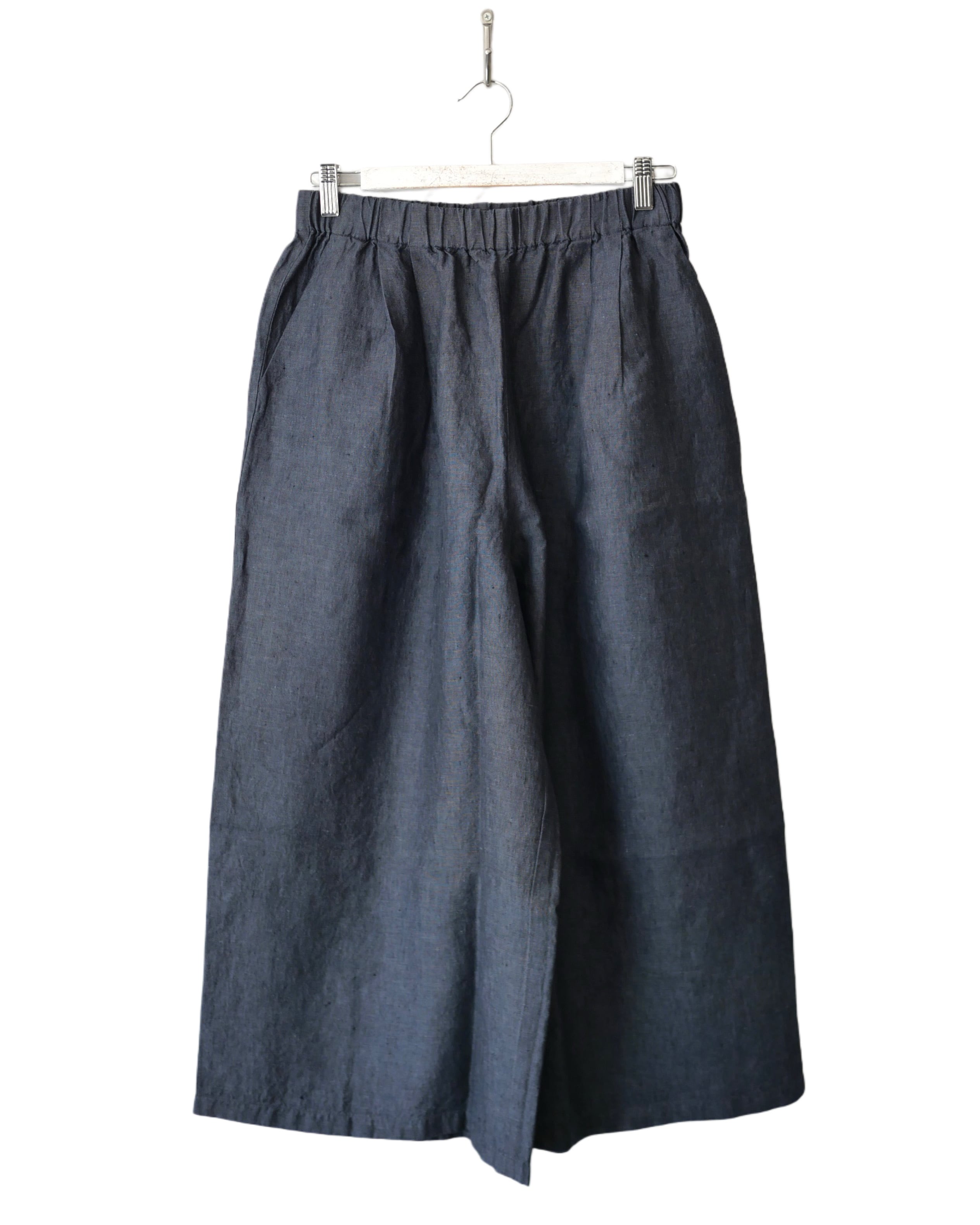 爽やかな青みの糸を使った奥行きのあるシャンブレー生地。デニム生地を思わせるカジュアルさと、リネンの上品な質感を併せ持つキュロットです。生地の重なりやボリューム感で洗練された佇まいに。