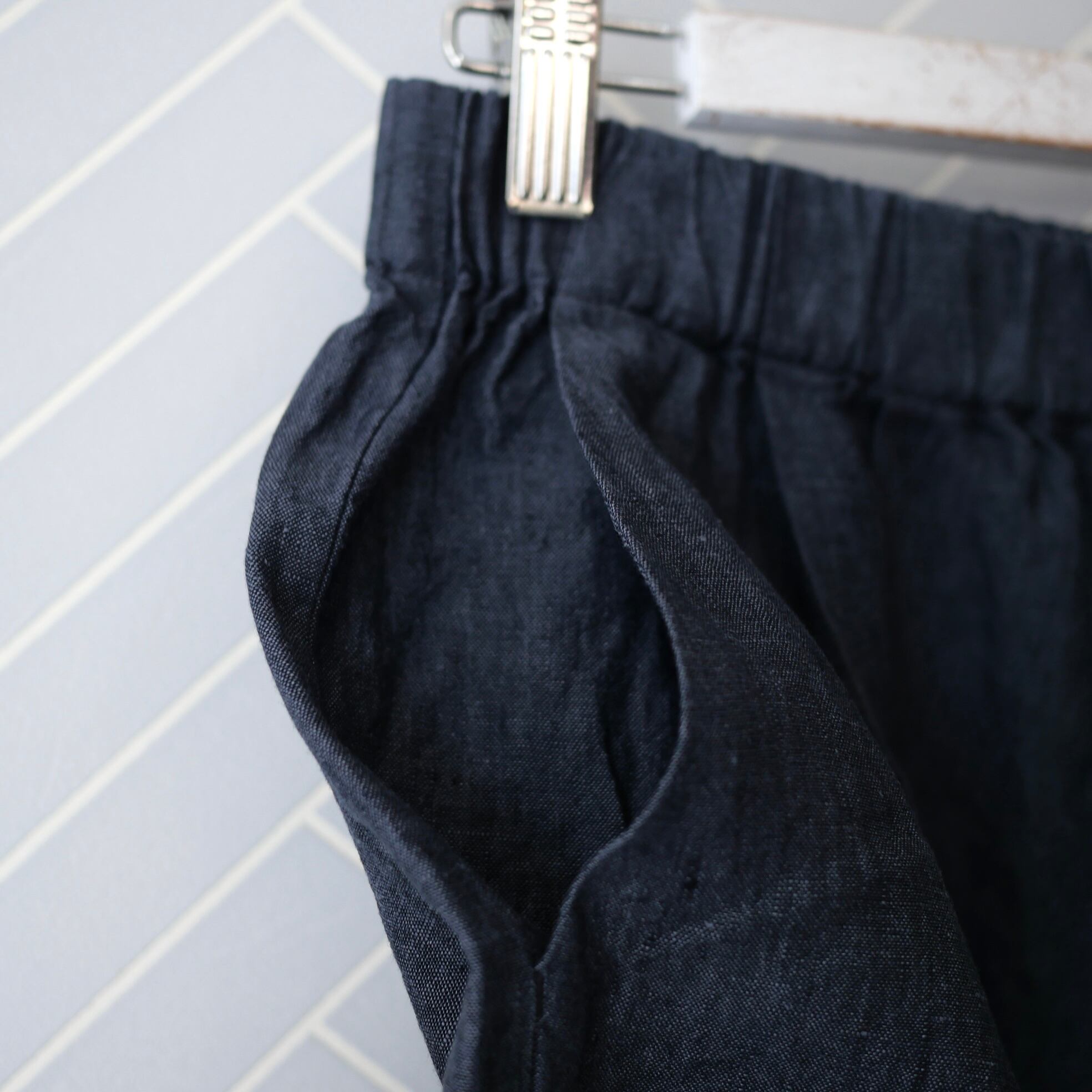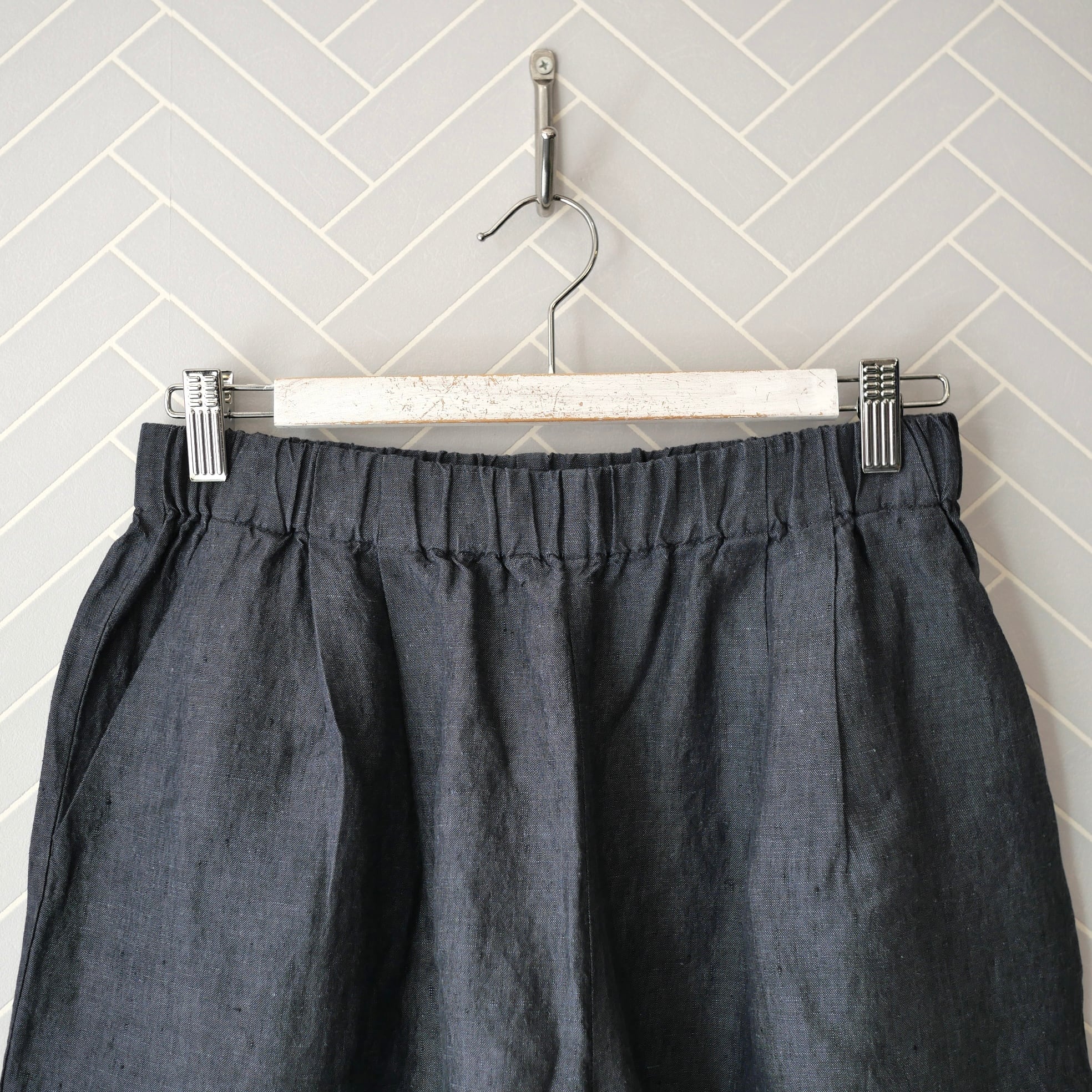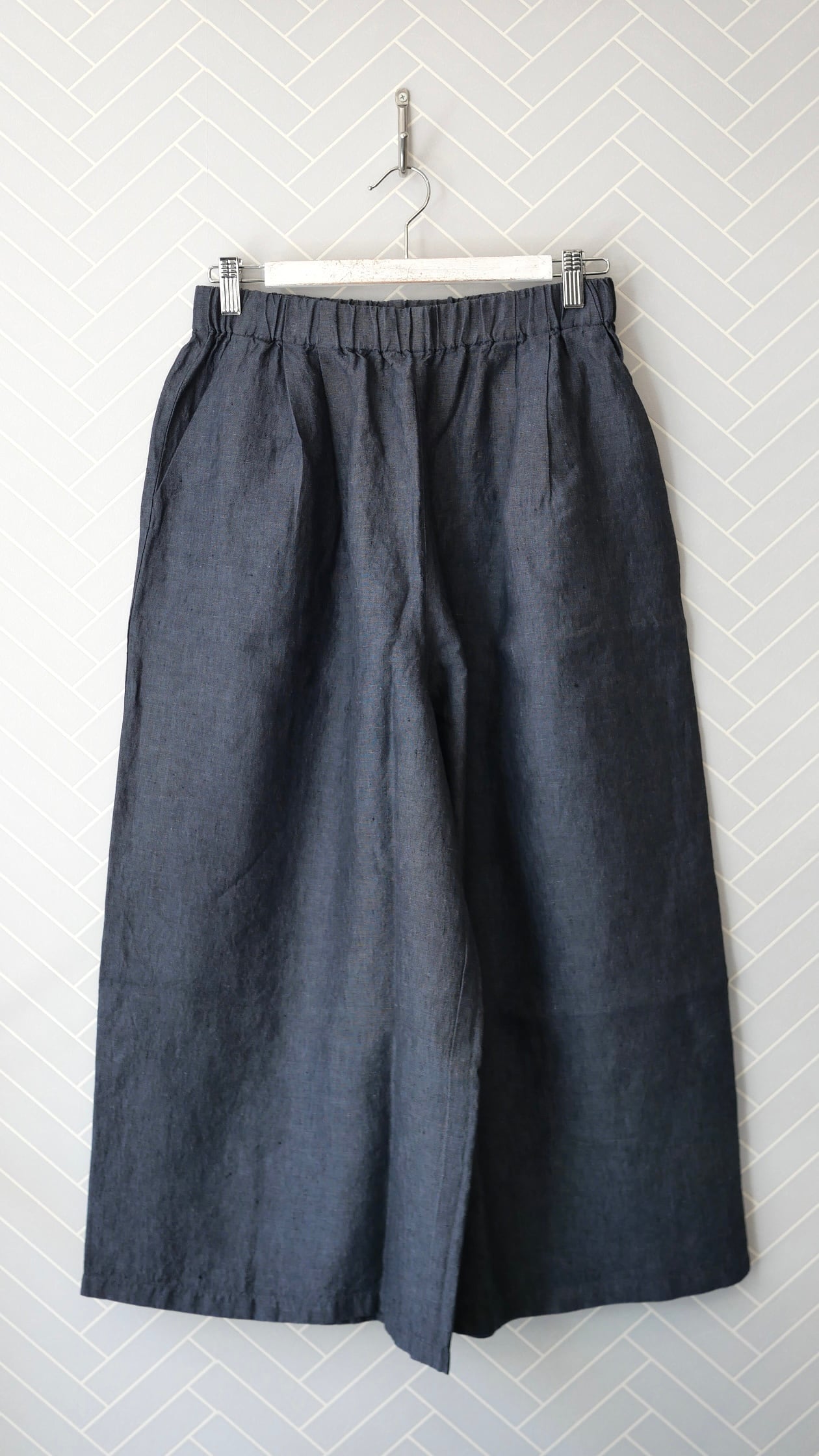 爽やかな青みの糸を使った奥行きのあるシャンブレー生地。デニム生地を思わせるカジュアルさと、リネンの上品な質感を併せ持つキュロットです。生地の重なりやボリューム感で洗練された佇まいに。