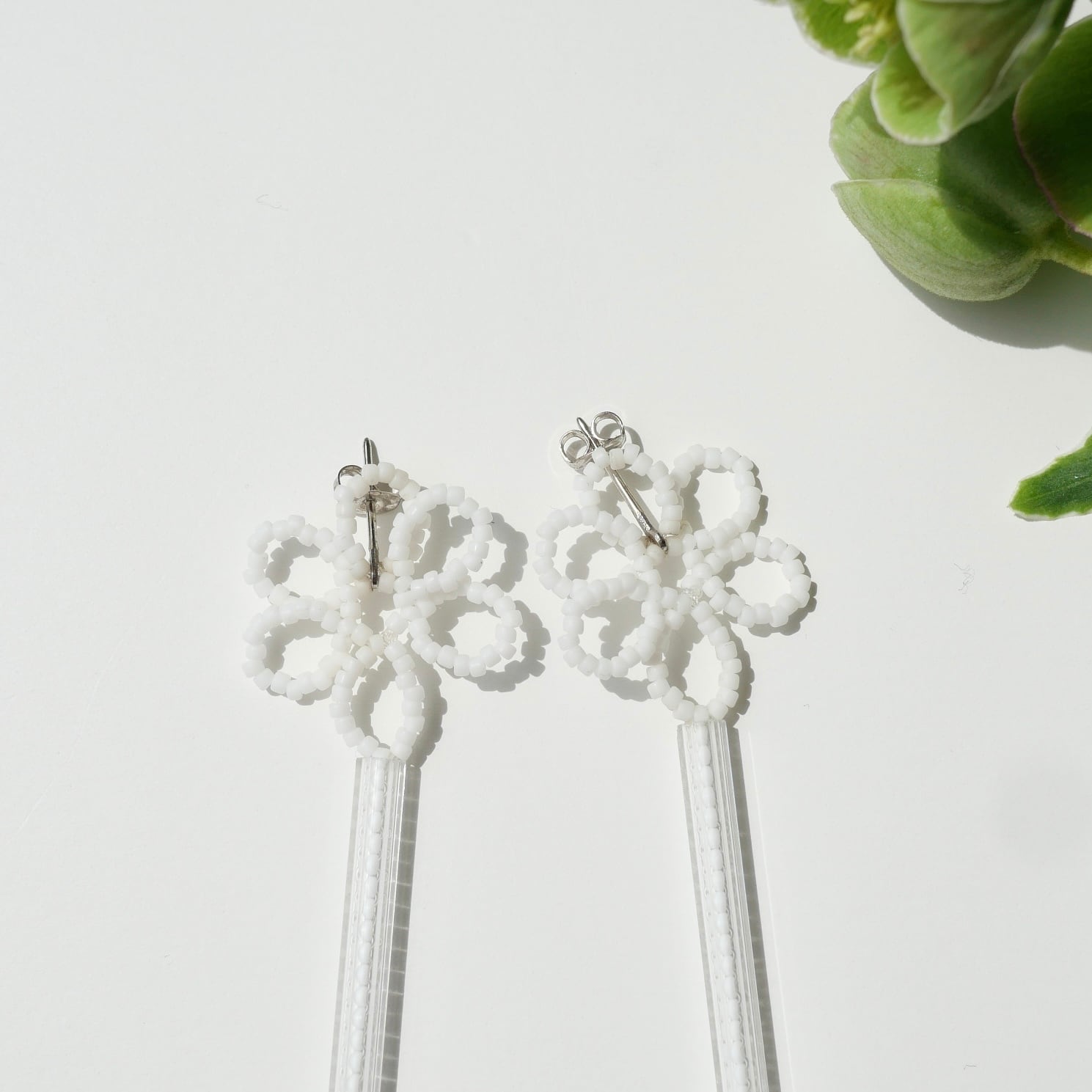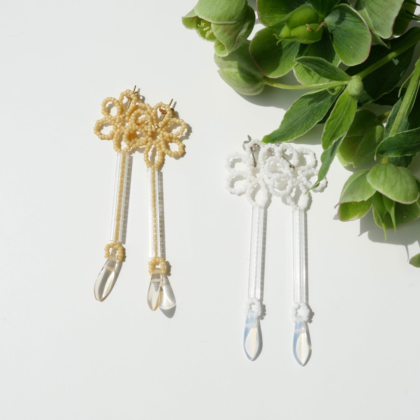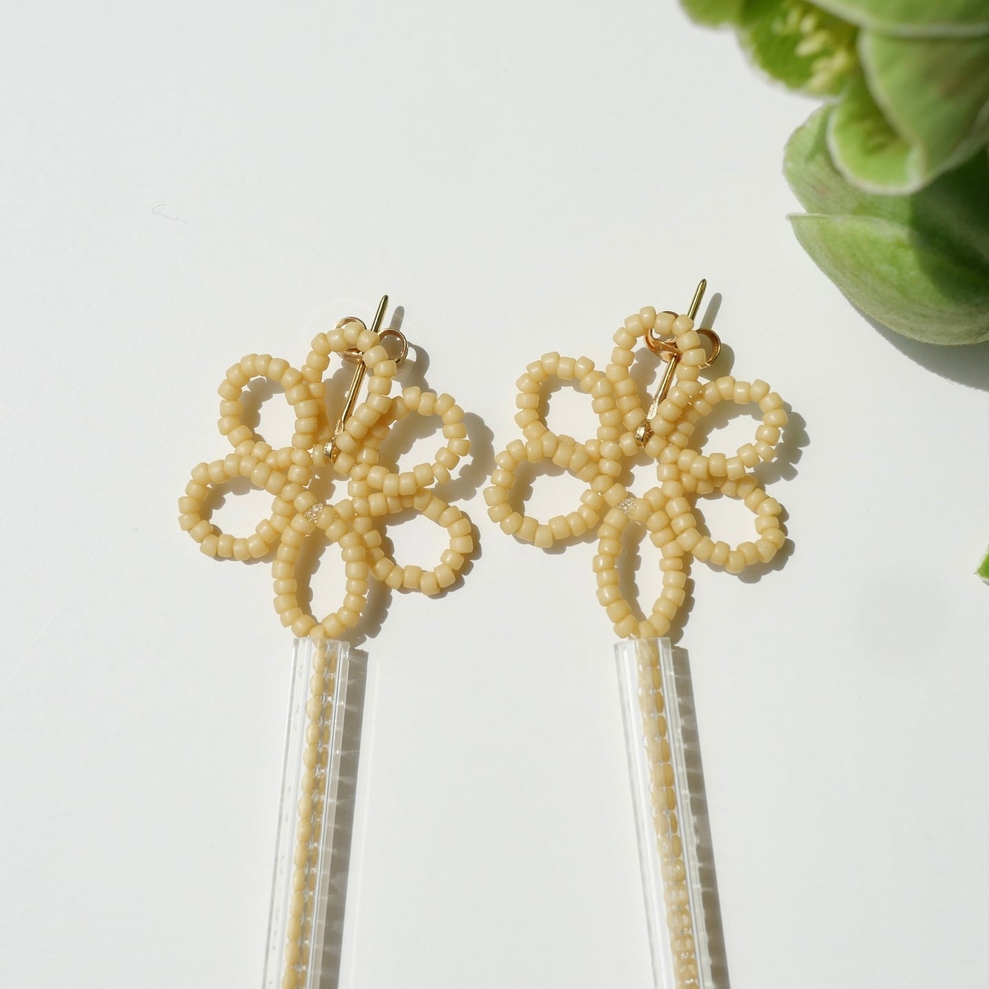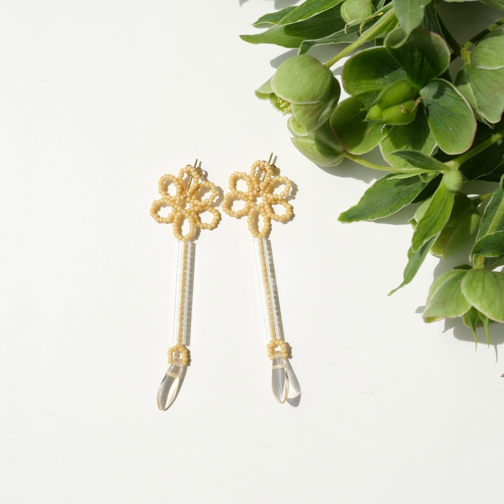 耳たぶに小さなお花が密着し、長い竹ビーズの中にはさらにビーズが入っているデザイン。密着と揺れる形が融合したピアスです。