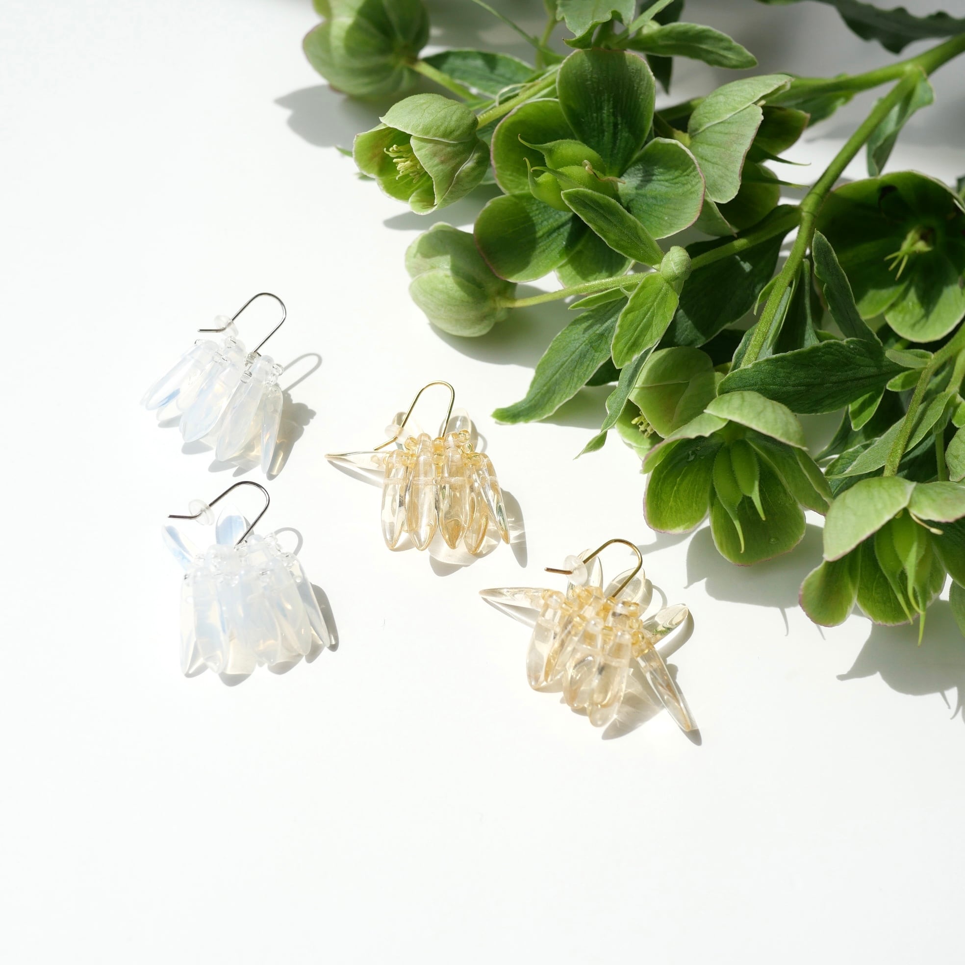 シャンデリアを耳に付けているような揺れるピアス。透明感のあるガラスビーズが上品です。