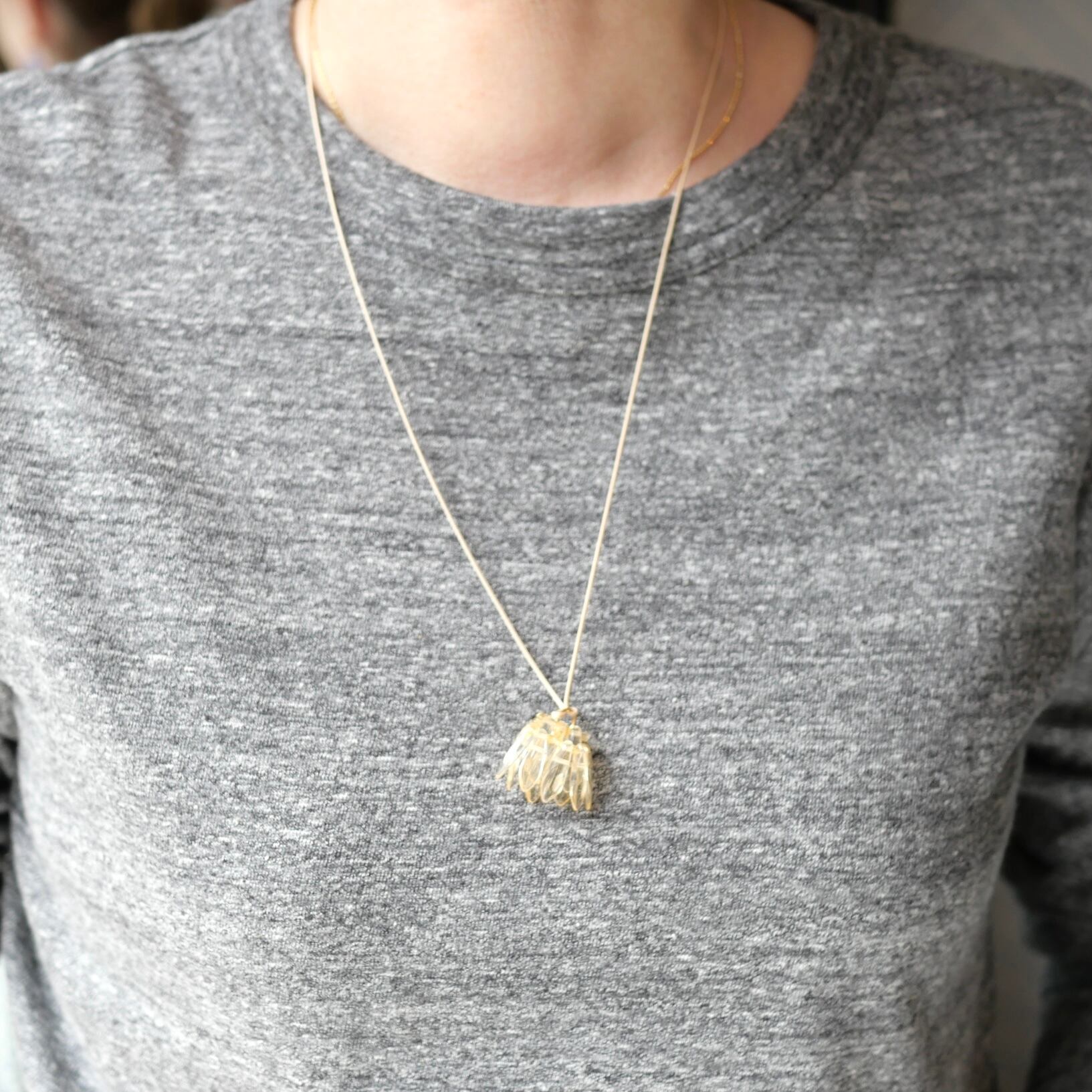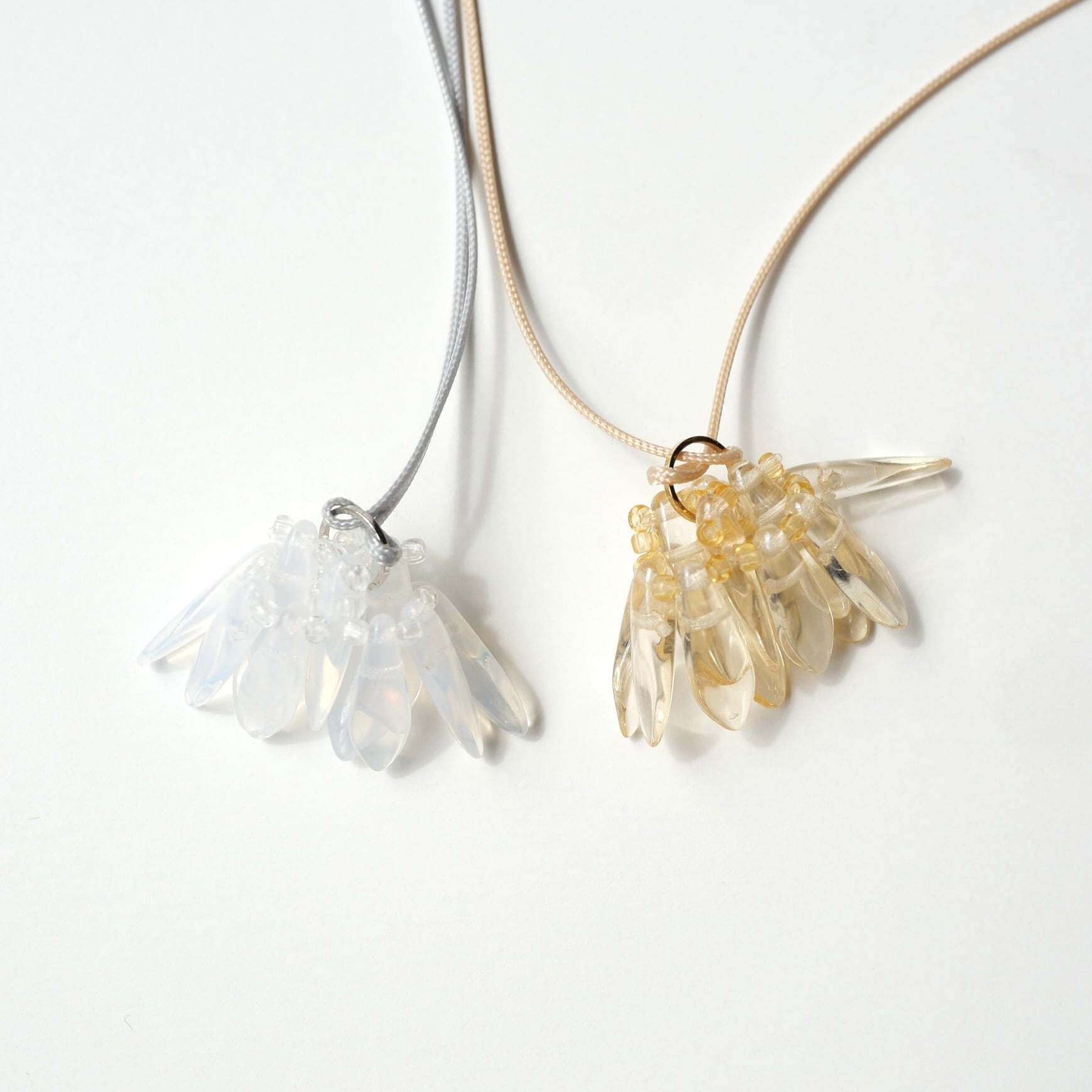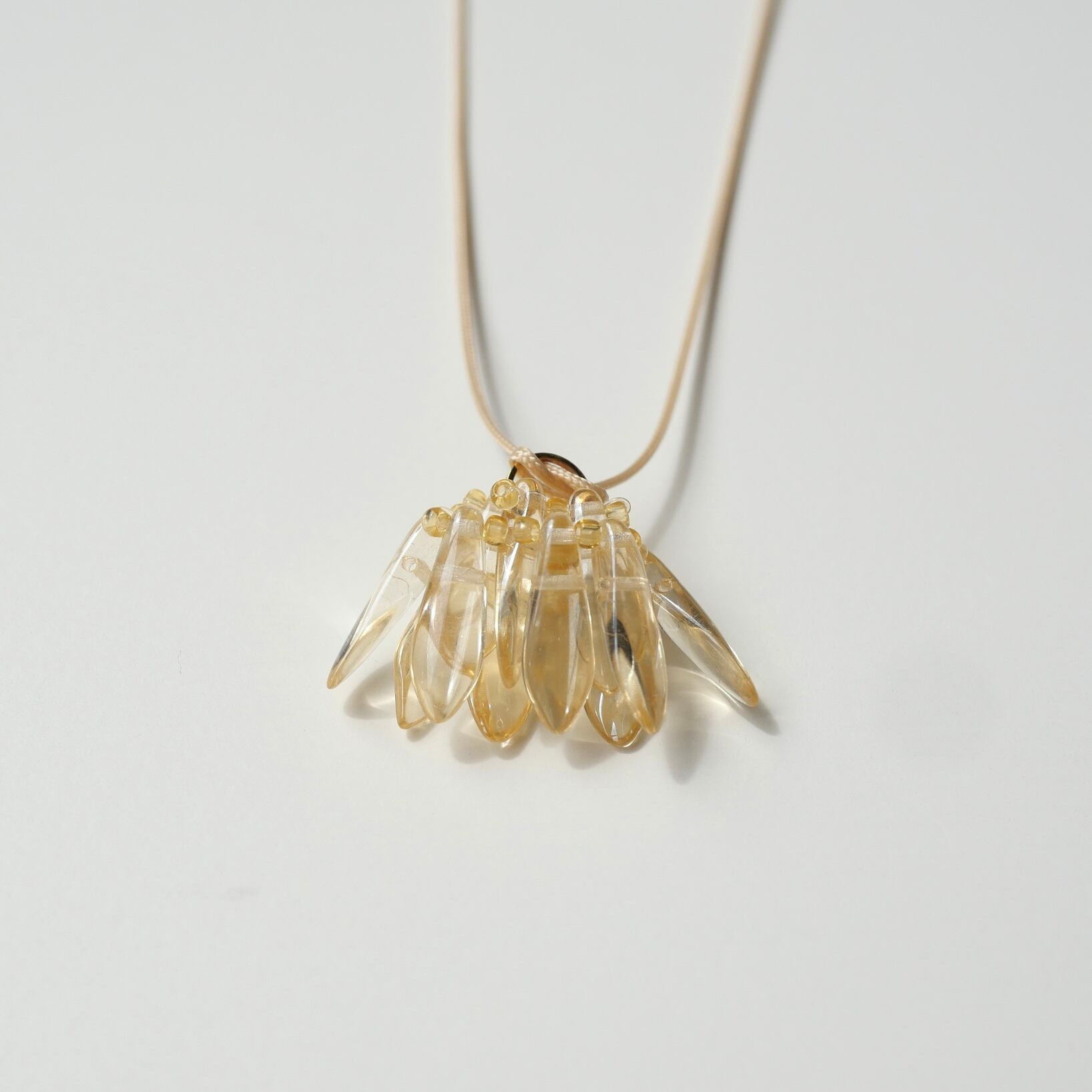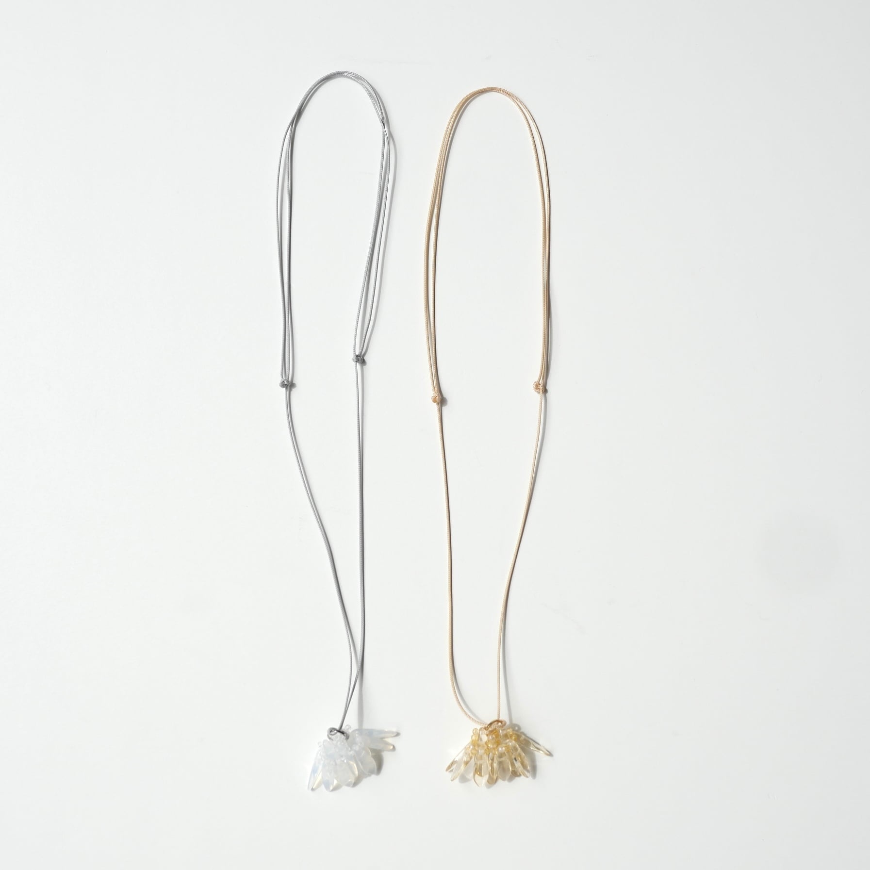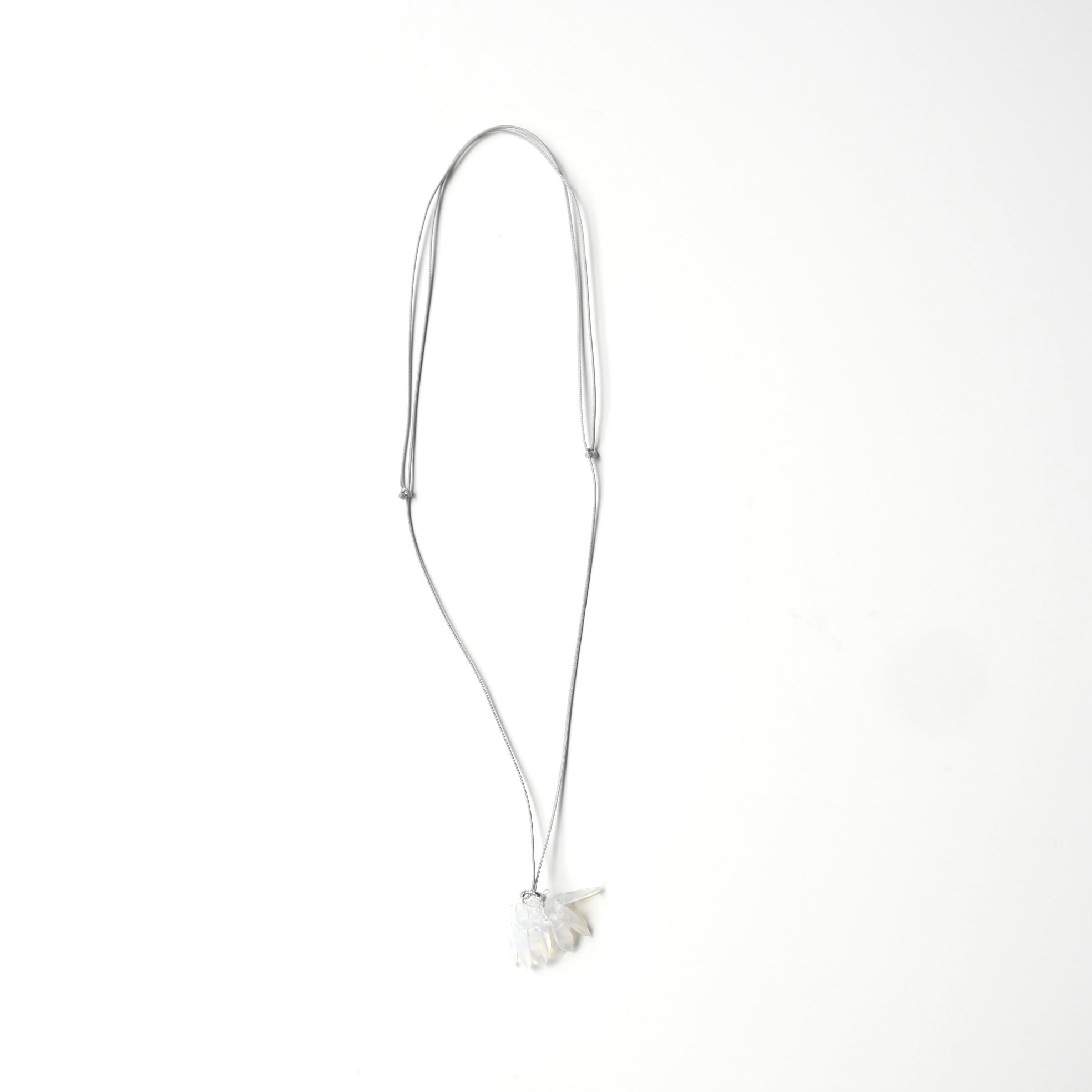 シャンデリアを身に付けているような揺れるペンダント。透明感のあるガラスビーズが上品です。長さが調節できるのでシーンに合わせた長さでお楽しみいただけます。