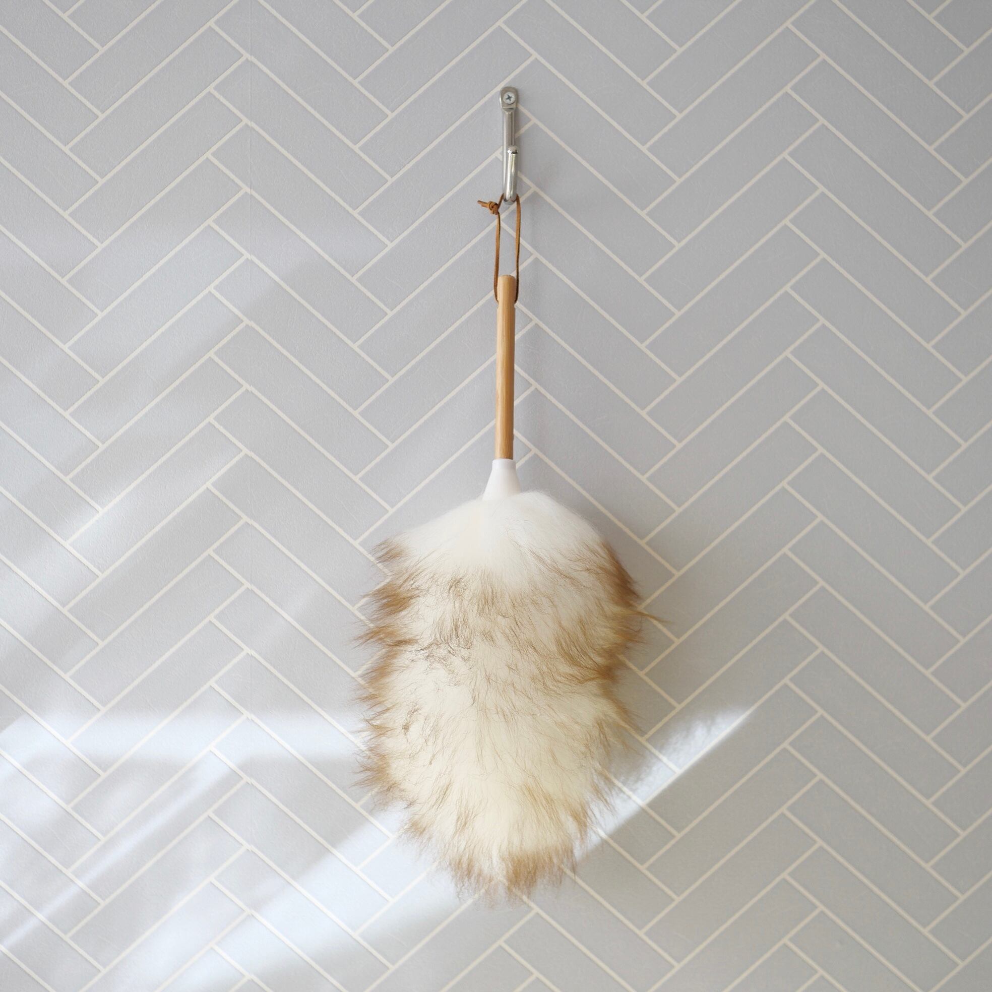 柔らかな羊毛が大きなホコリから見えないホコリまでしっかり絡めとります。壁かけできるよう川の紐がついています。