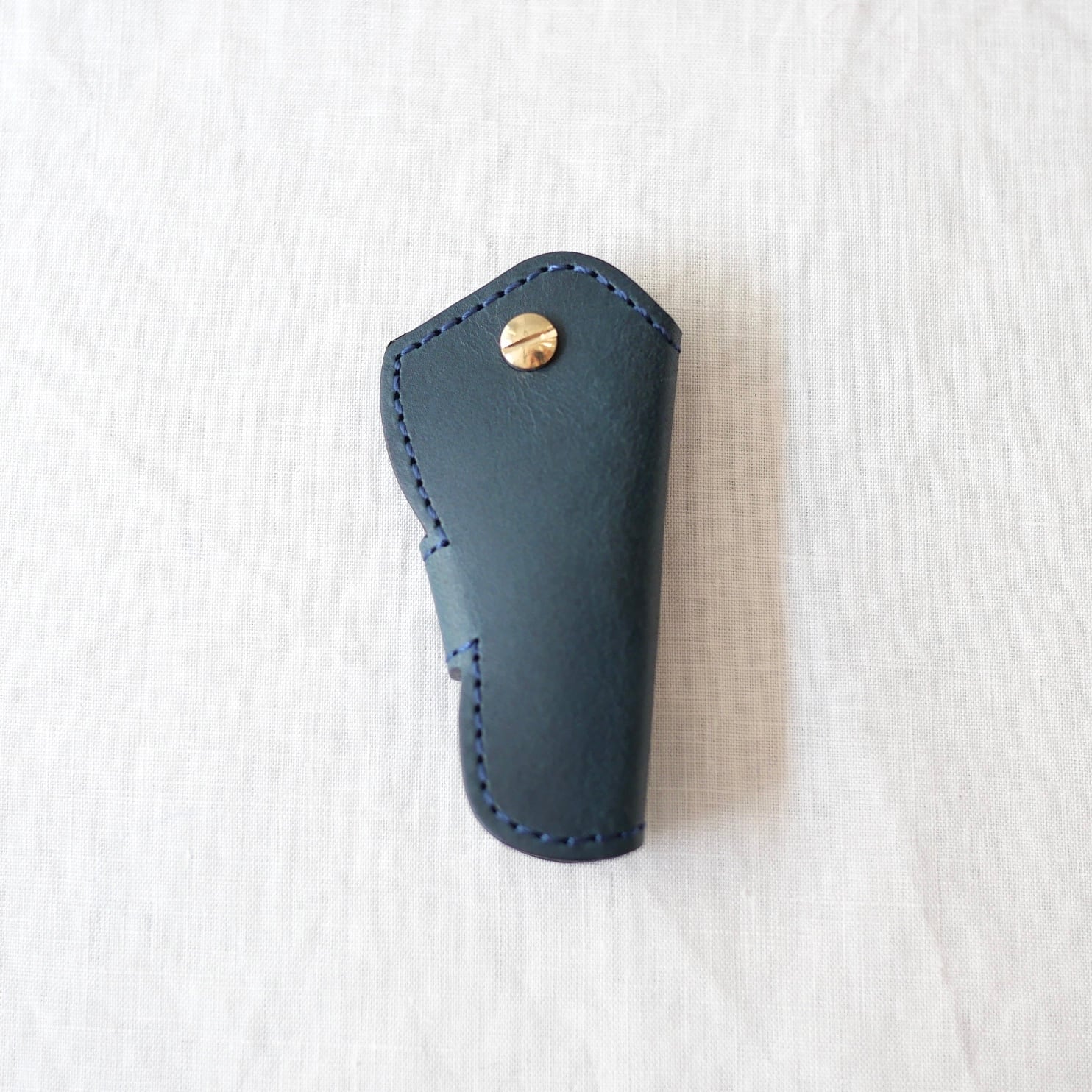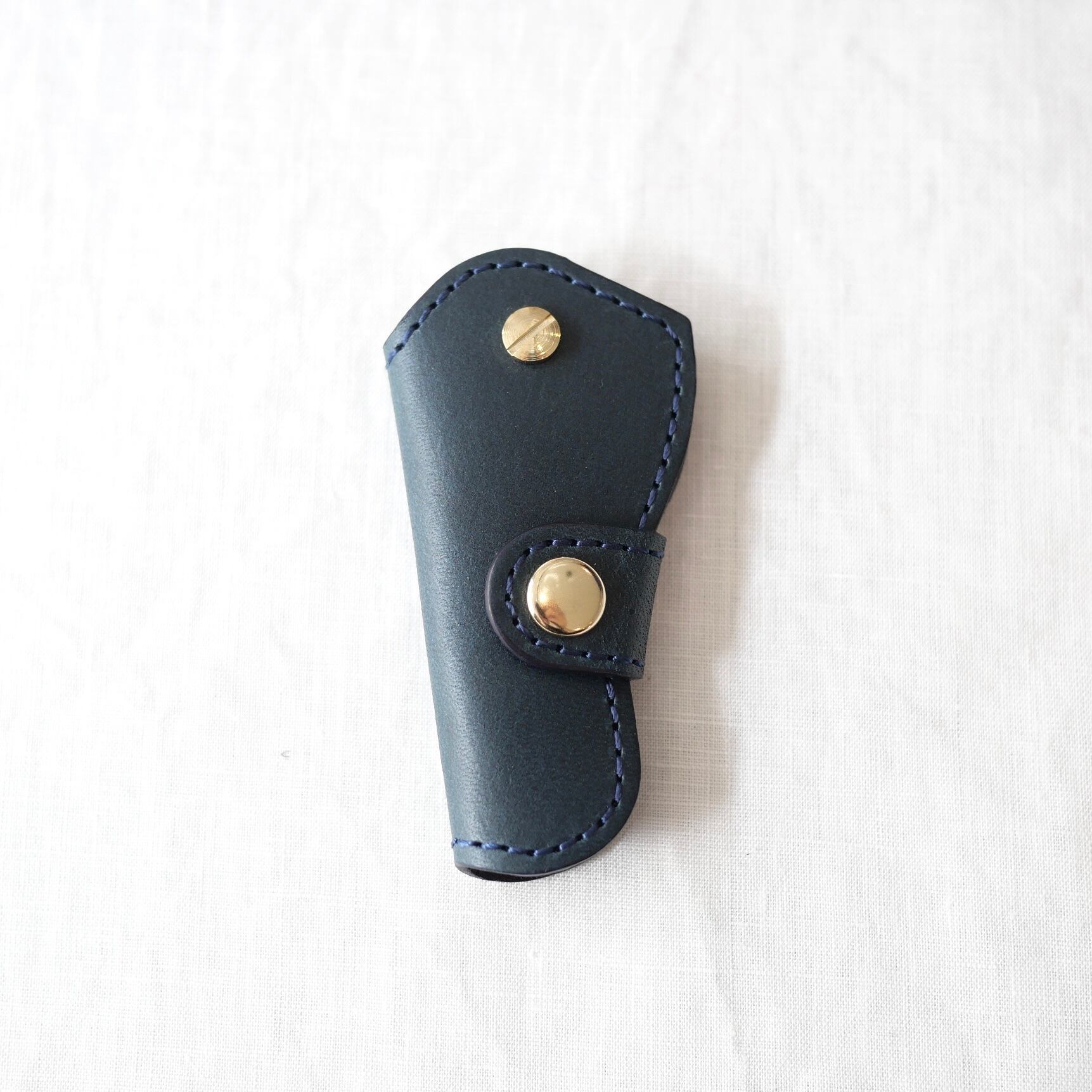 染め、鞣しの段階で染料を芯まで染み込ませた植物性フルタンニン仕上げの皮を使用したホルスター型のキーホルダー。繊維密度が高くハリがあり、なおかつ柔軟性もあります。