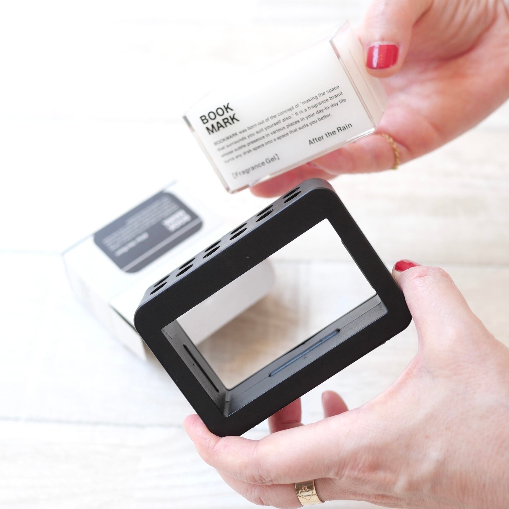 空になったジェルの真ん中を押すと簡単に外すことができます。リフィルのフィルムを剥がして同じところにカチッと音がするまで嵌め込んでください。同じように素敵な香りが広がります。