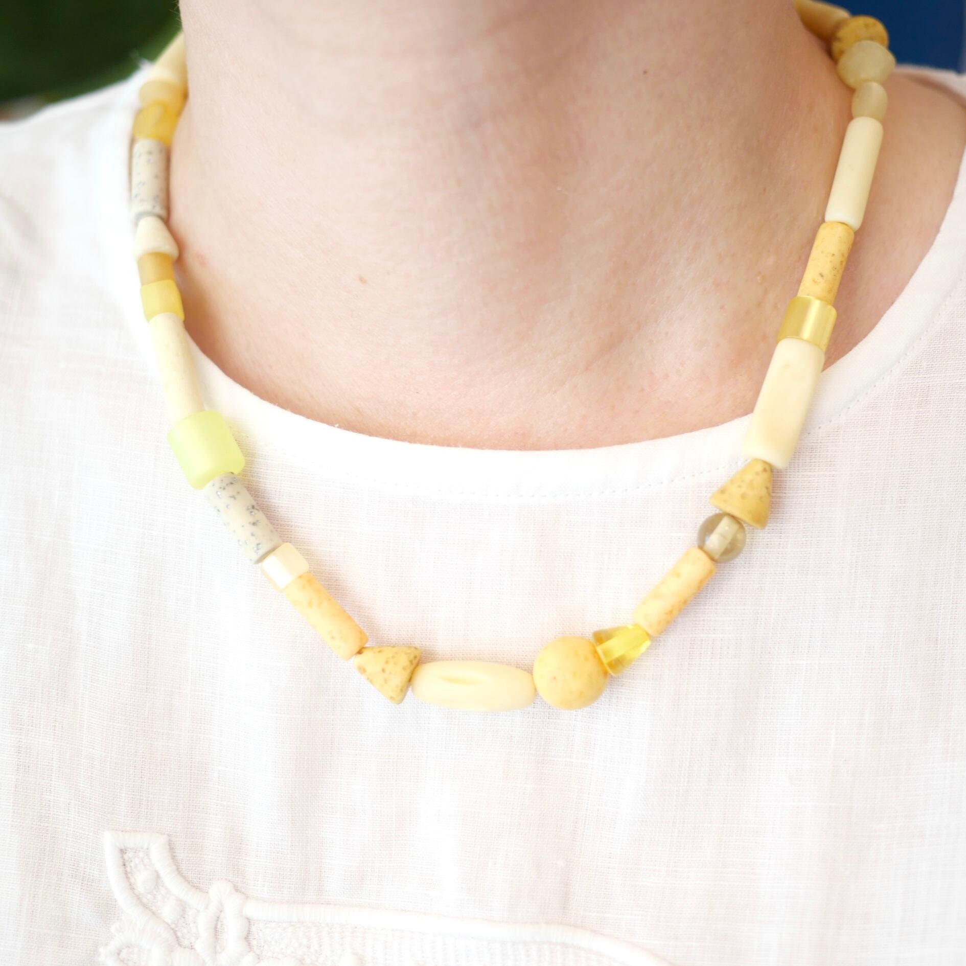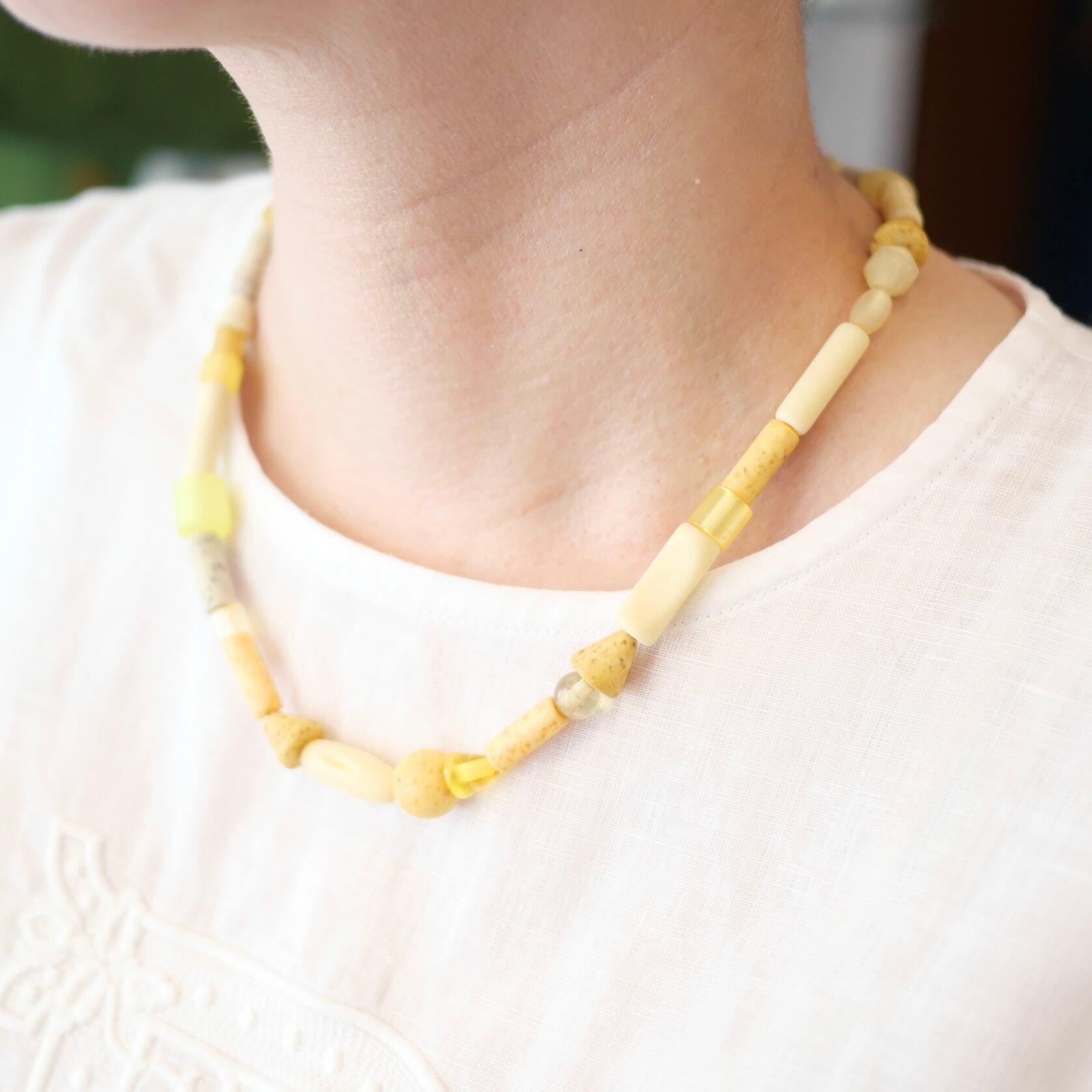 マットな丸、三角、円柱形のパーツの中に透き通ったレモンイエロービーズを合わせてヘルシーな印象です。