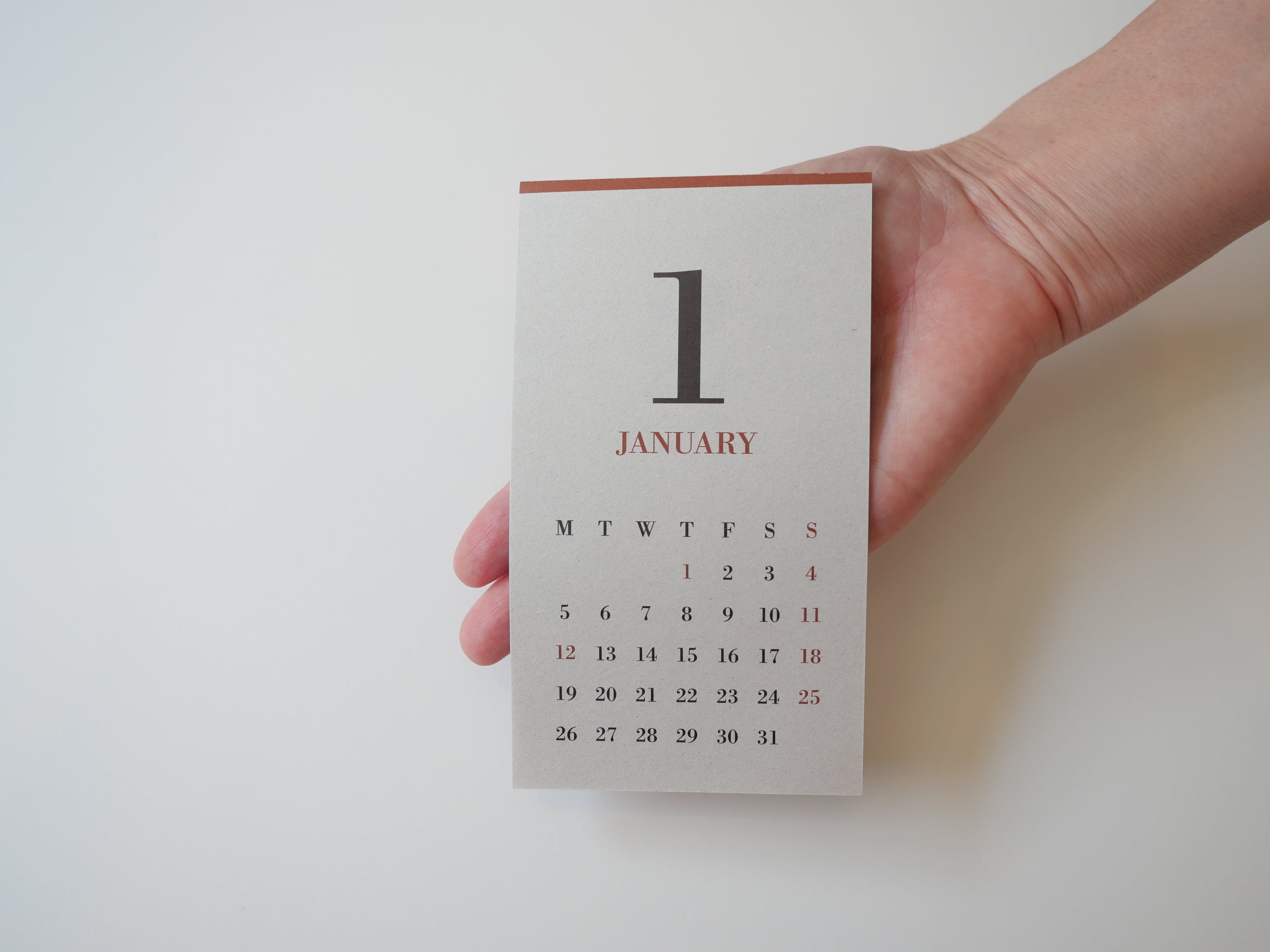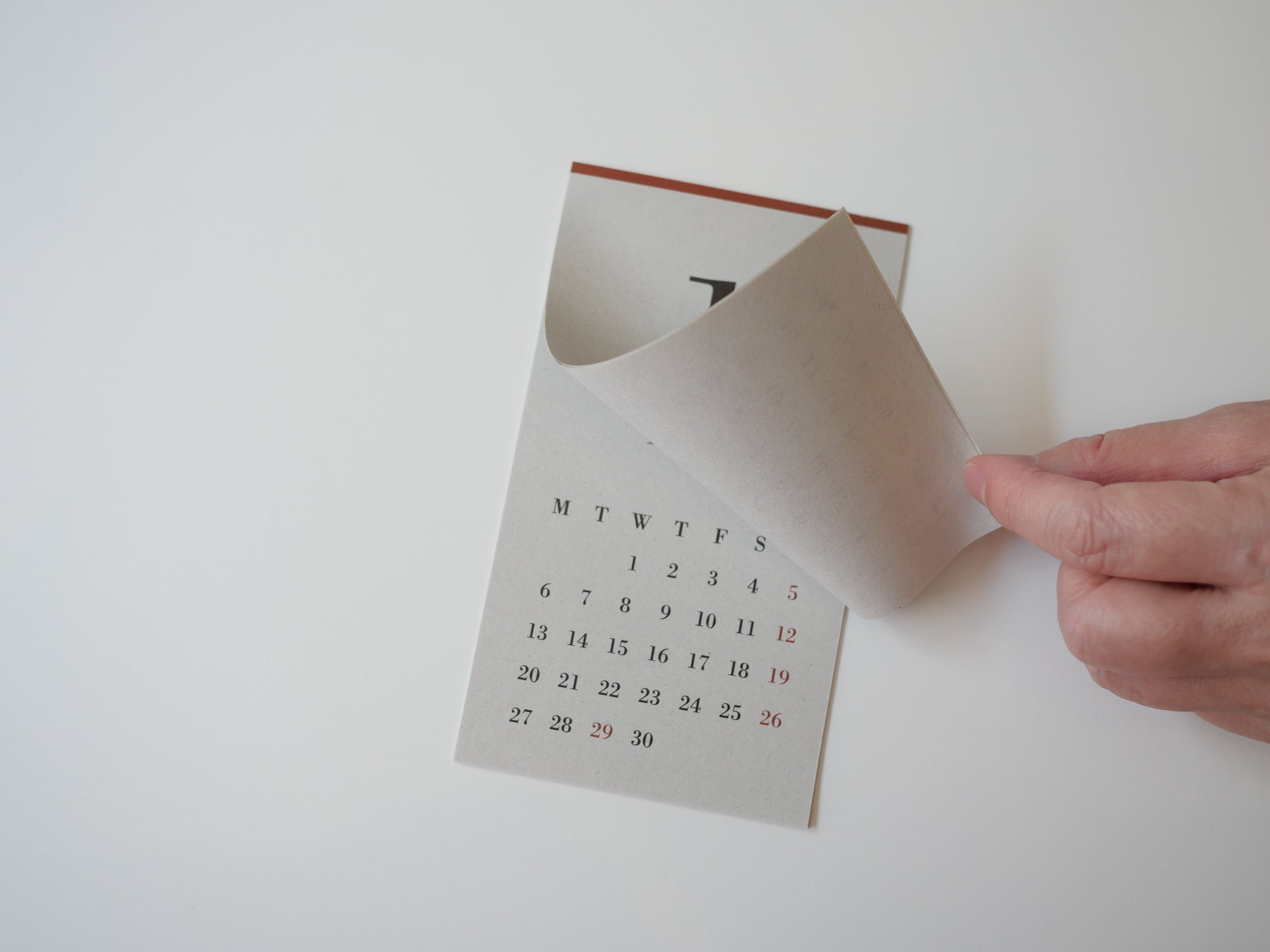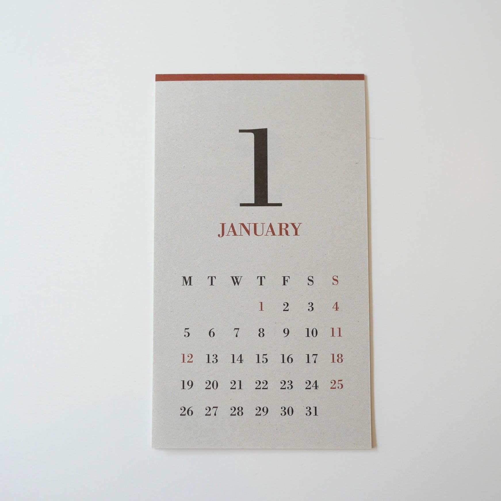 更紙12枚で作られたシンプルで小さなカレンダー。卓上カレンダーとしても便利な人気商品です。こちらはリフィルとして発売されたものですが、このまま手帳に挟んだり、マスキングテープで壁に貼ったりして小さくシンプルにお使いいただけます。