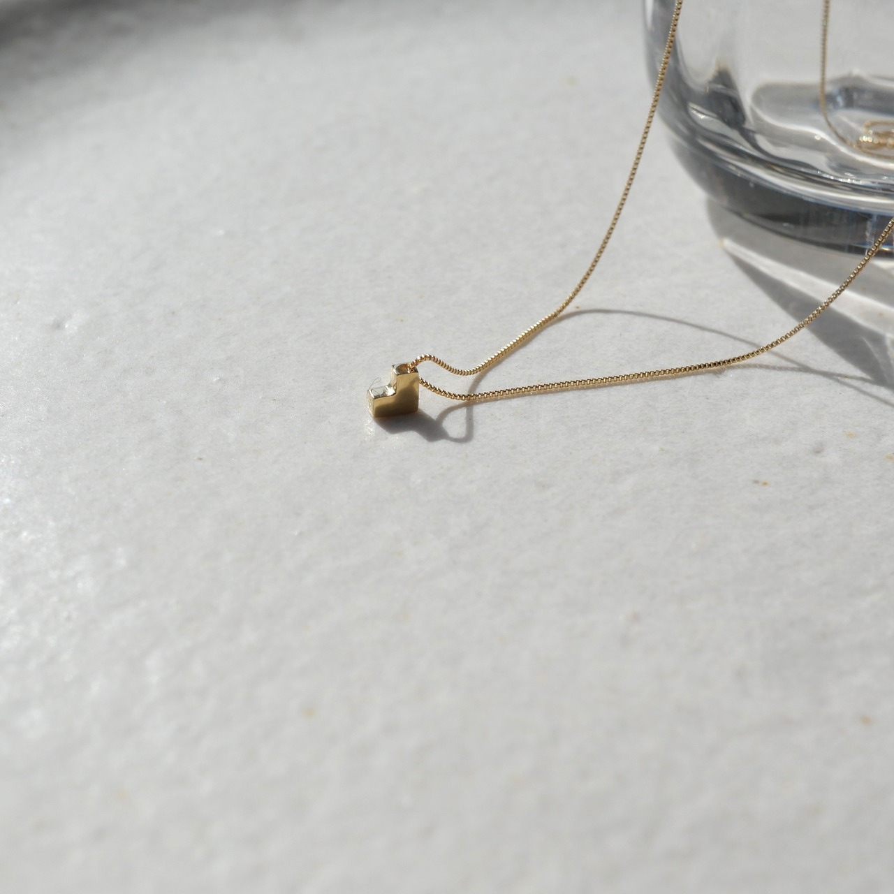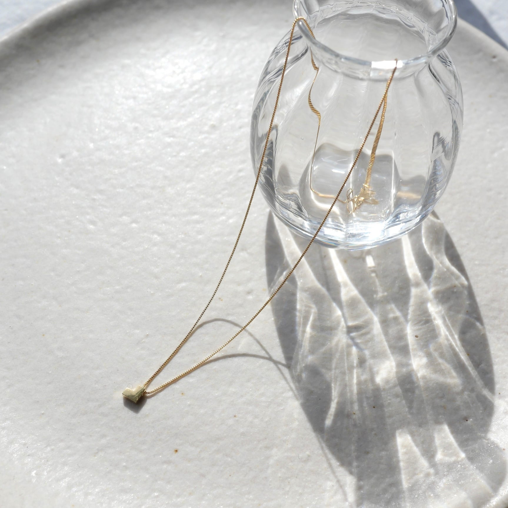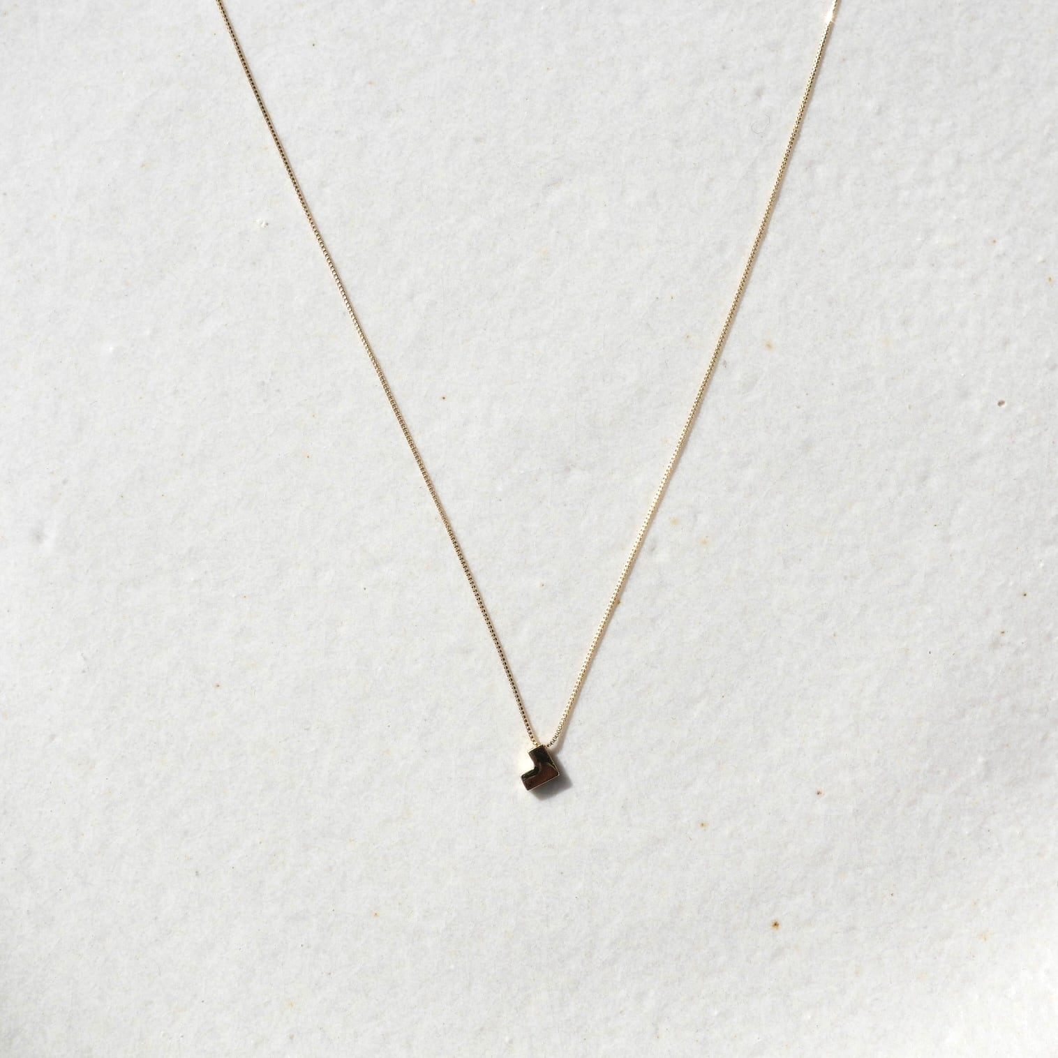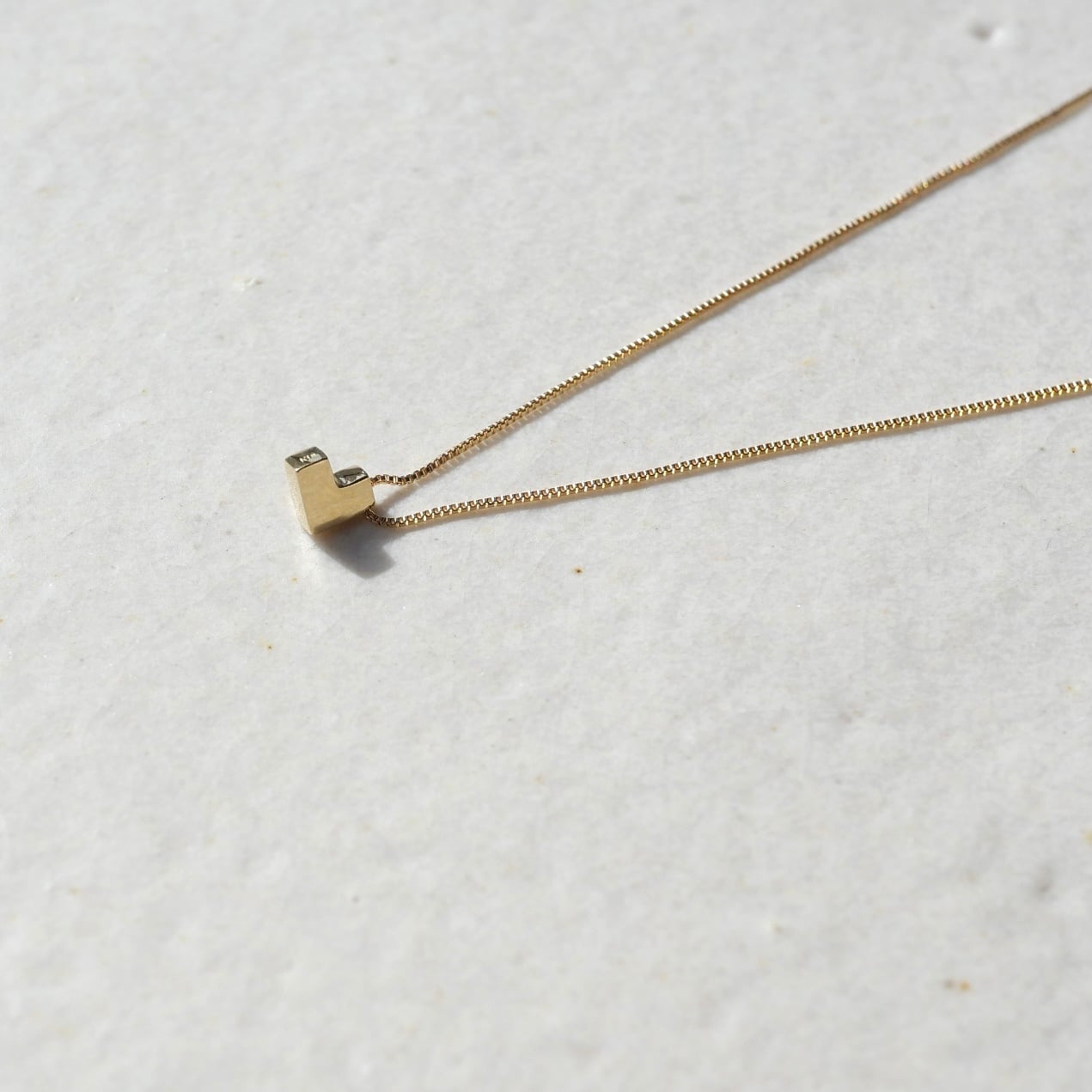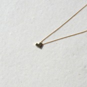 ハート型のモチーフネックレス。甘くなりがちなモチーフをデフォルメし、縦になるようチェーンに取り付けることでL字型やブロックのような不思議なデザインができあがりました。