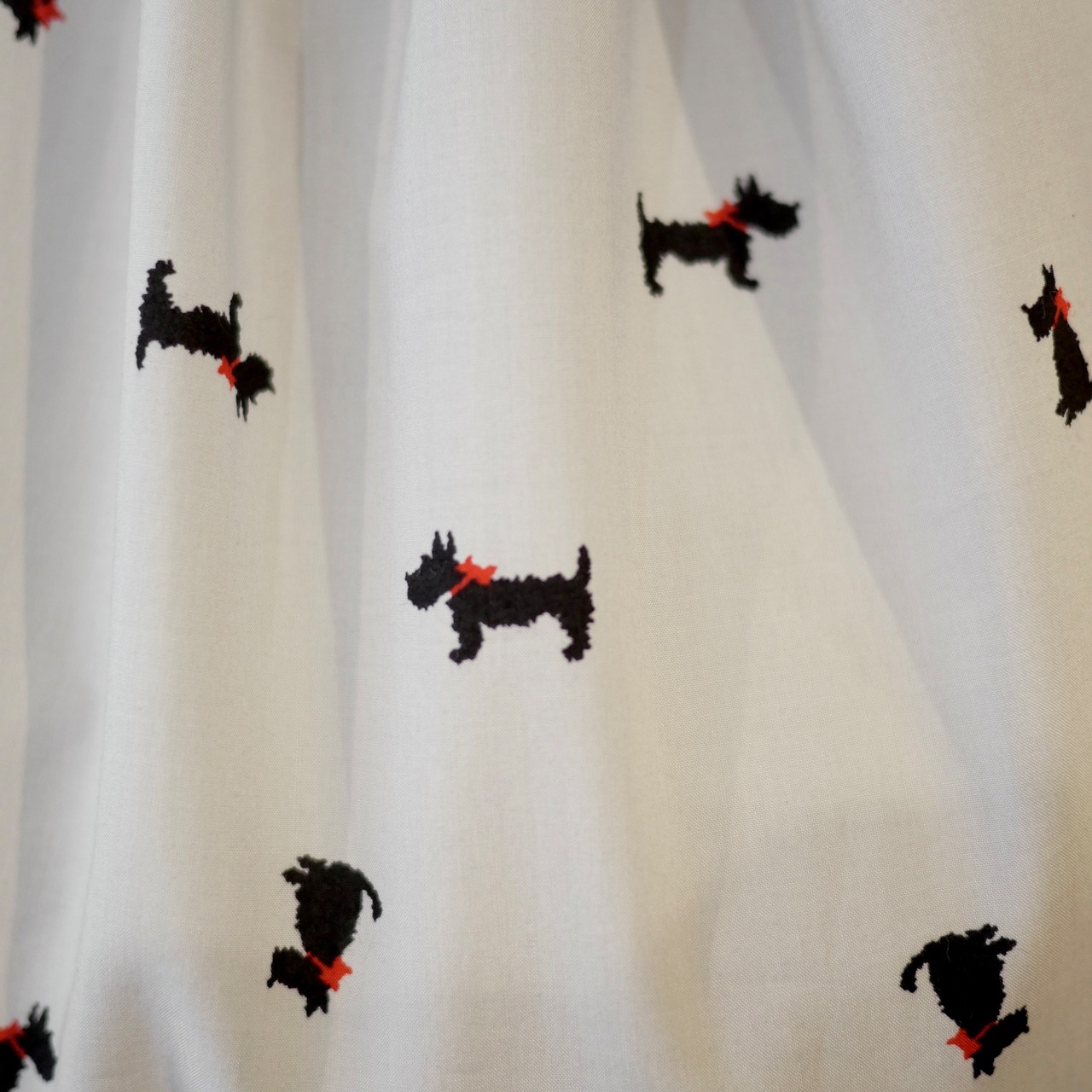 サックス色にテリア(犬)が描かれた可愛い生地は、高密度のタイプライターコットン。程よいハリと光沢があって上品さが漂います。巾着袋のLサイズは着替えなどもしっかり入る大きさです。巾着バッグとして持ってもかわいい!