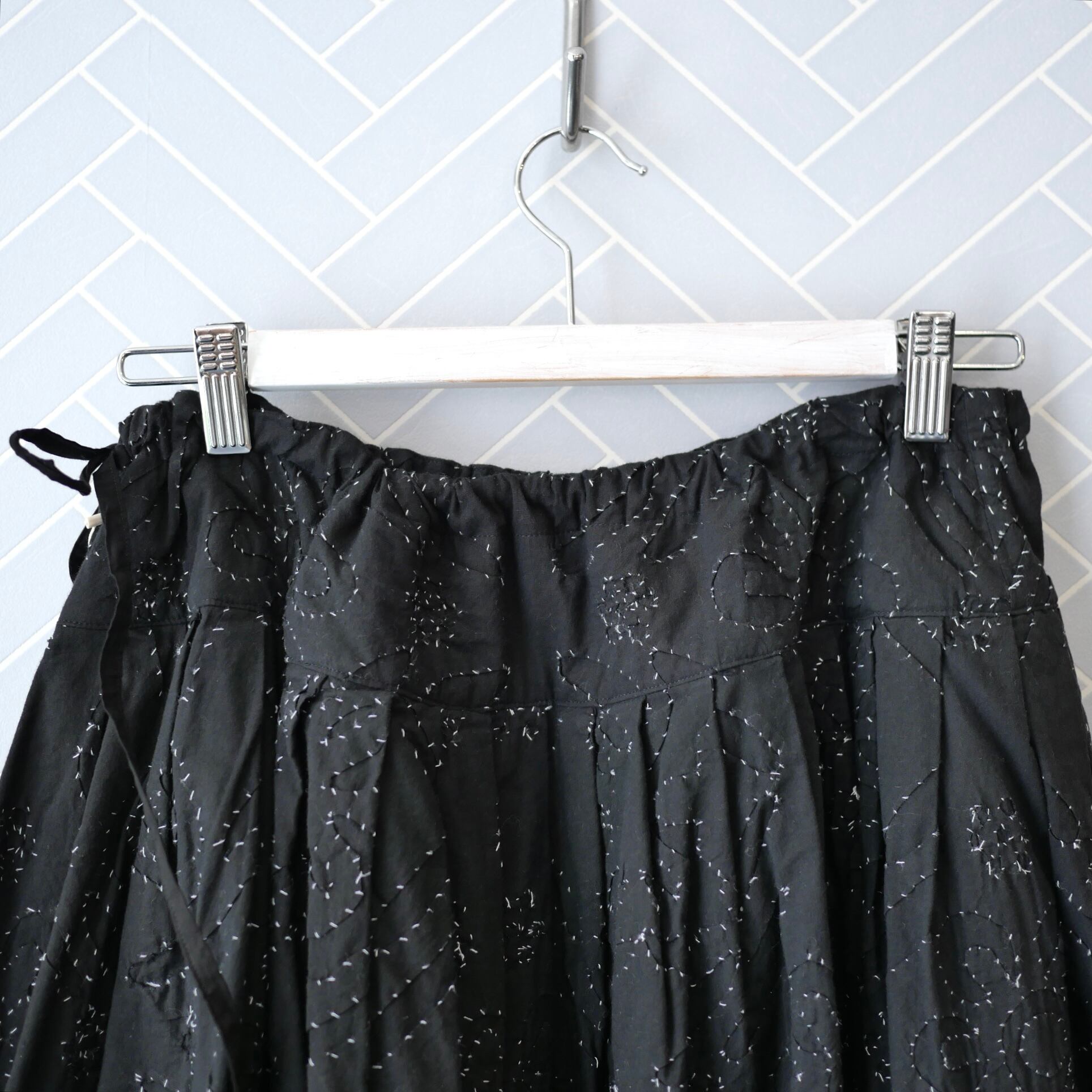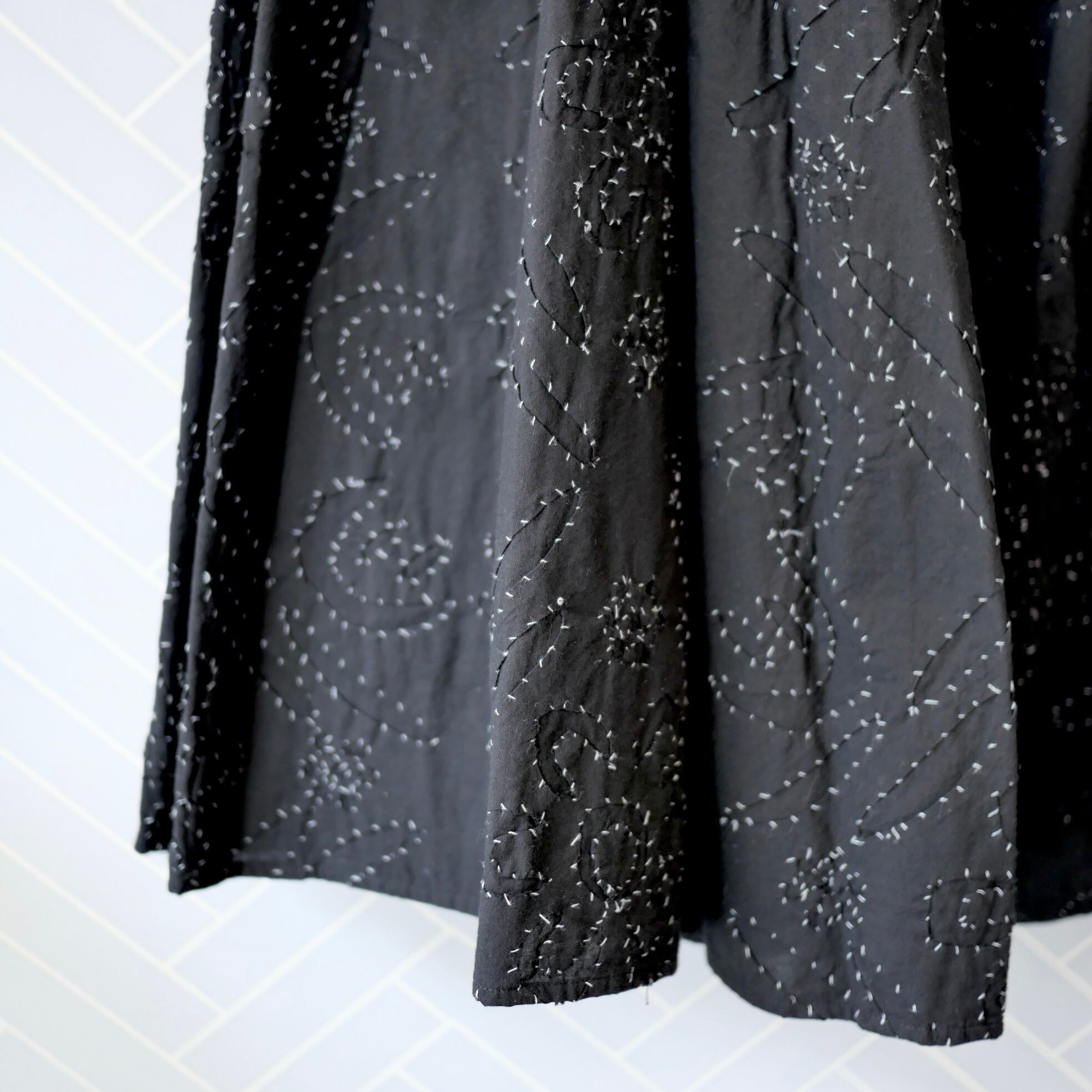 R&D.M.Co-オリジナルのアップリケ生地を使用しています。基になる生地の上に、別の生地を置き、それを縫い合わせることで、柄や模様を描く刺繍加工の生地。立体感のある花柄と白い糸の刺繍模様が個性的です。ウエストの10cmほど下からタックが入っているので、定番のギャザースカートに比べて広がりが控えめな形です。パッチワークにような刺繍柄が映えるスカートです。