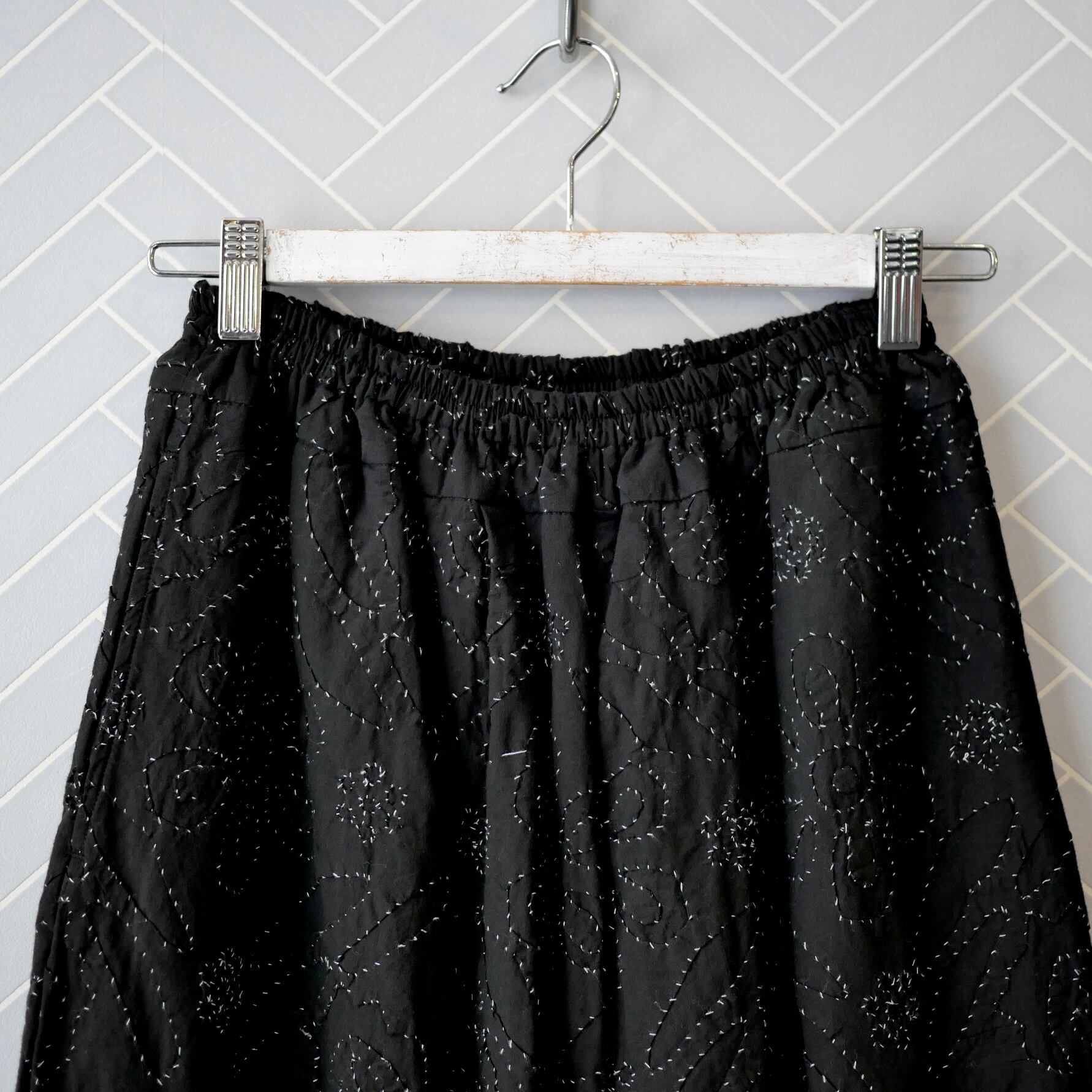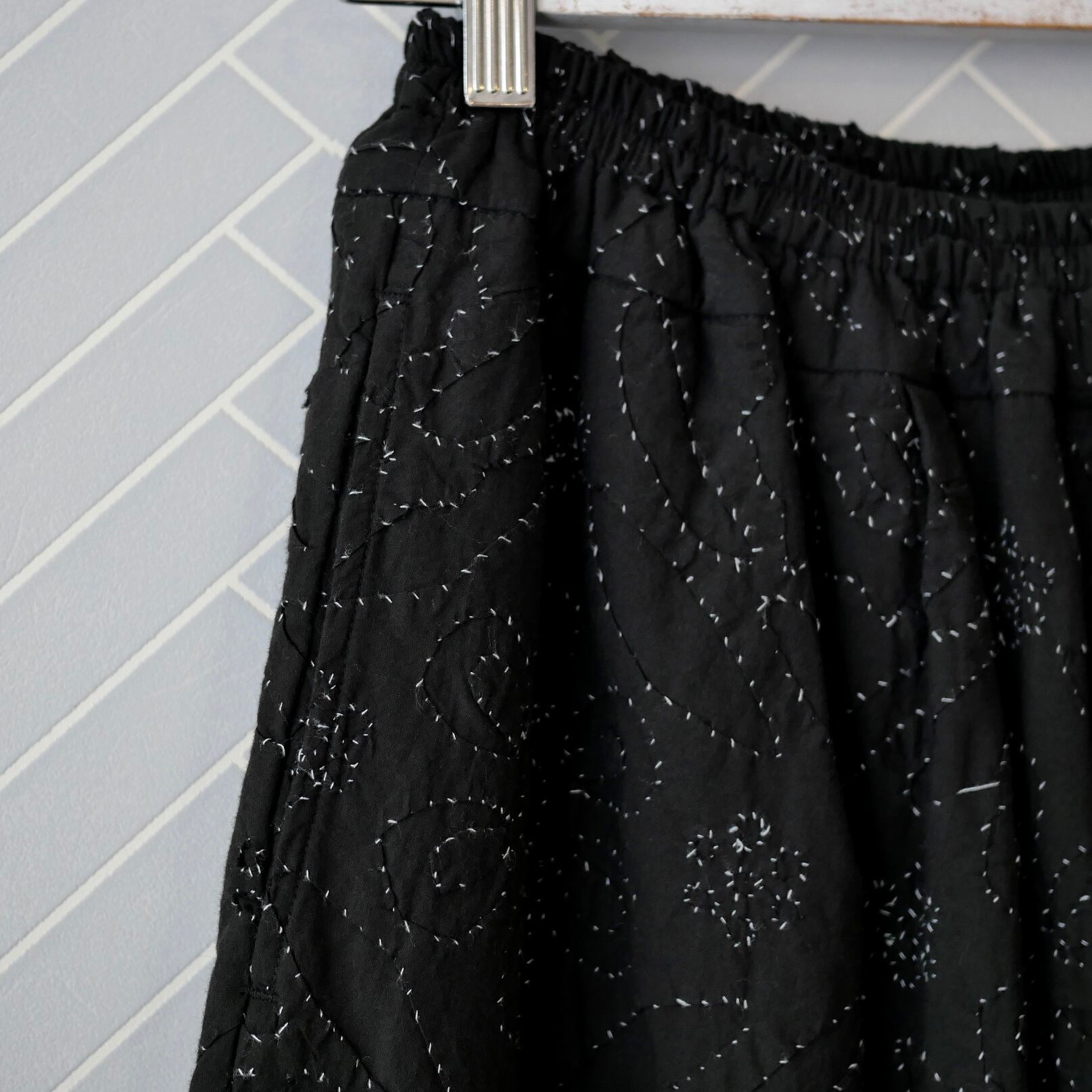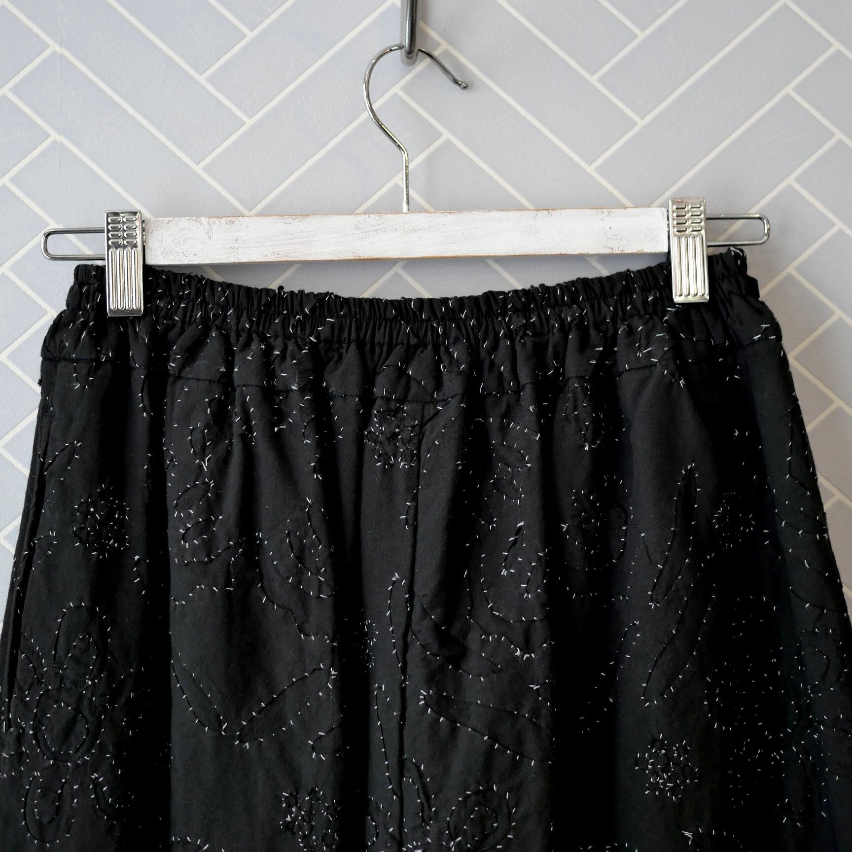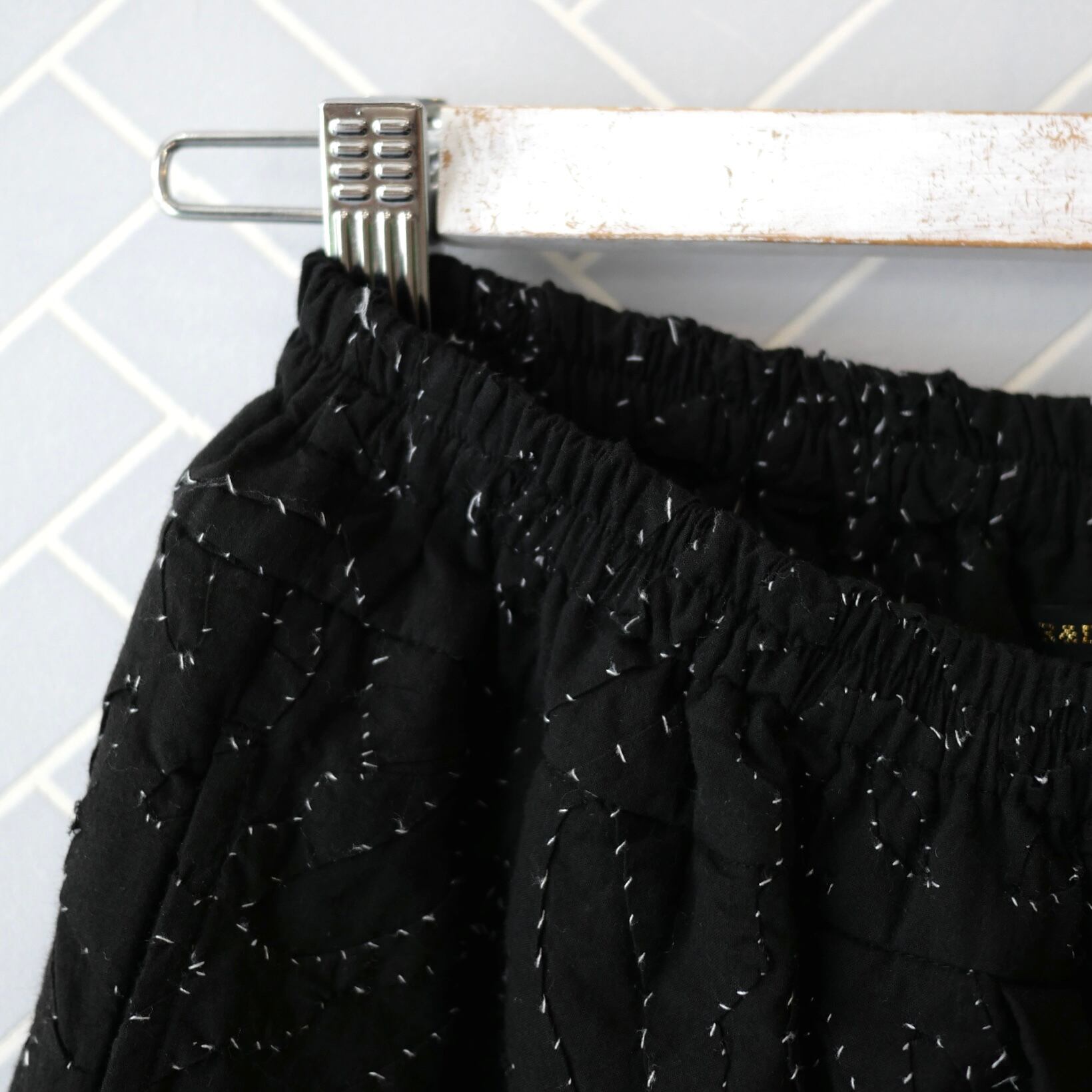R&D.M.Co-オリジナルのアップリケ生地を使用したゴムパンツです。基になる生地の上に、別の生地を置き、それを縫い合わせることで、柄や模様を描く刺繍加工です。立体感のある花柄と白い糸の刺繍模様が個性的です。