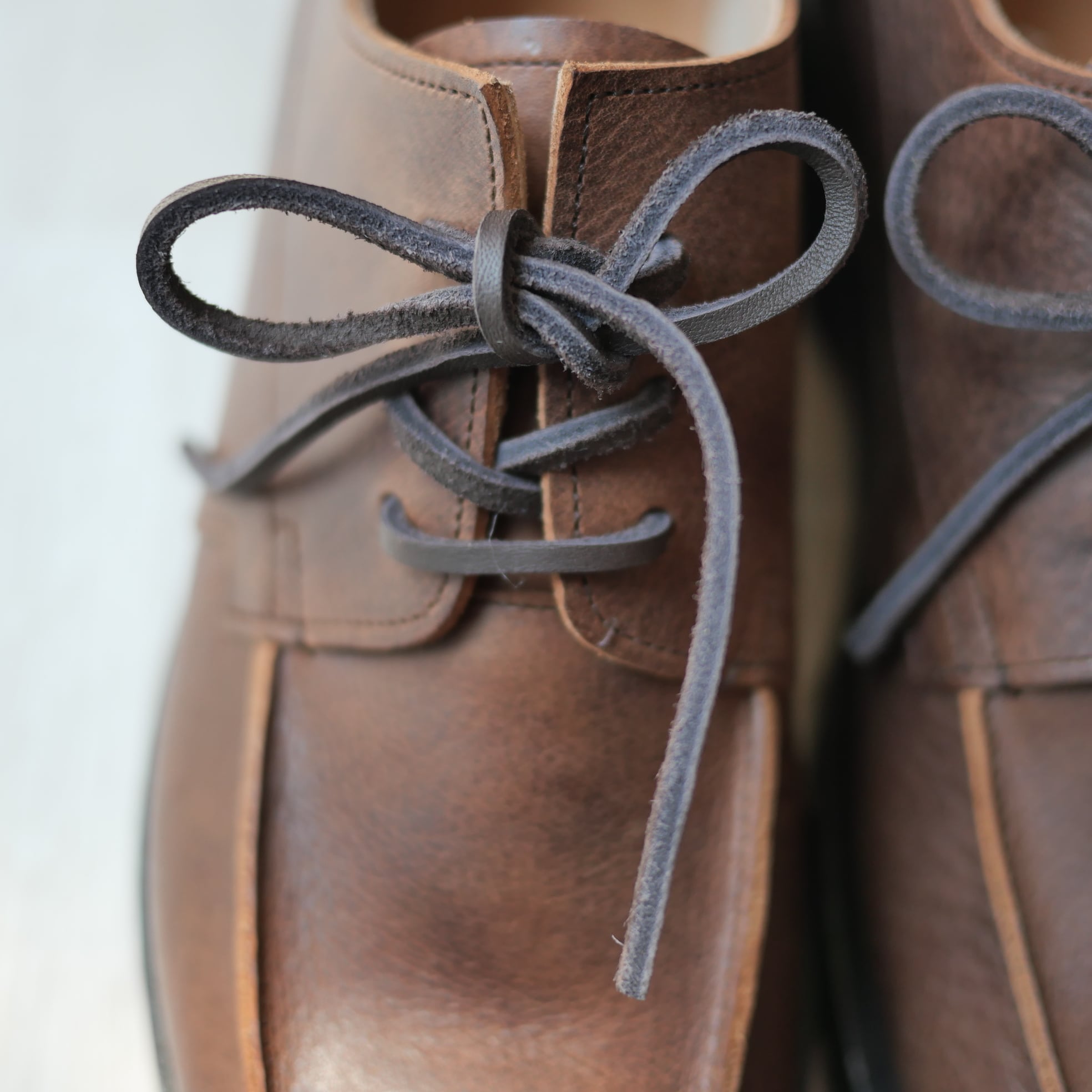 イタリアのオイルアップレザーの独特な風合いをシンプルなクラシックモカシンをイメージした外羽根に仕上げた一足。