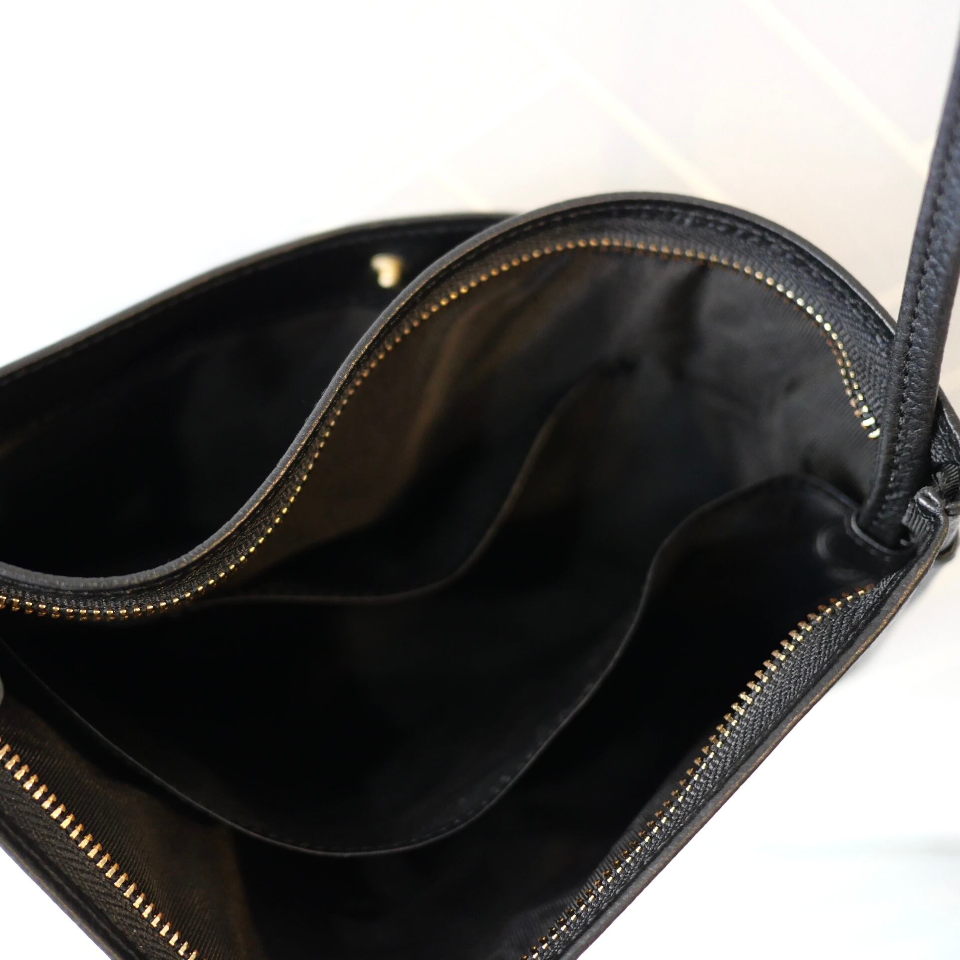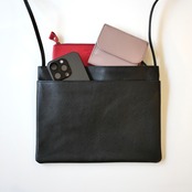 長財布やスマートフォン、ポーチなども入れられるサイズです。内側は大小二つのポケット付き。外側のポケットはスナップボタンが付いています。日常使いはもちろんご旅行にもおすすめのアイテムです。